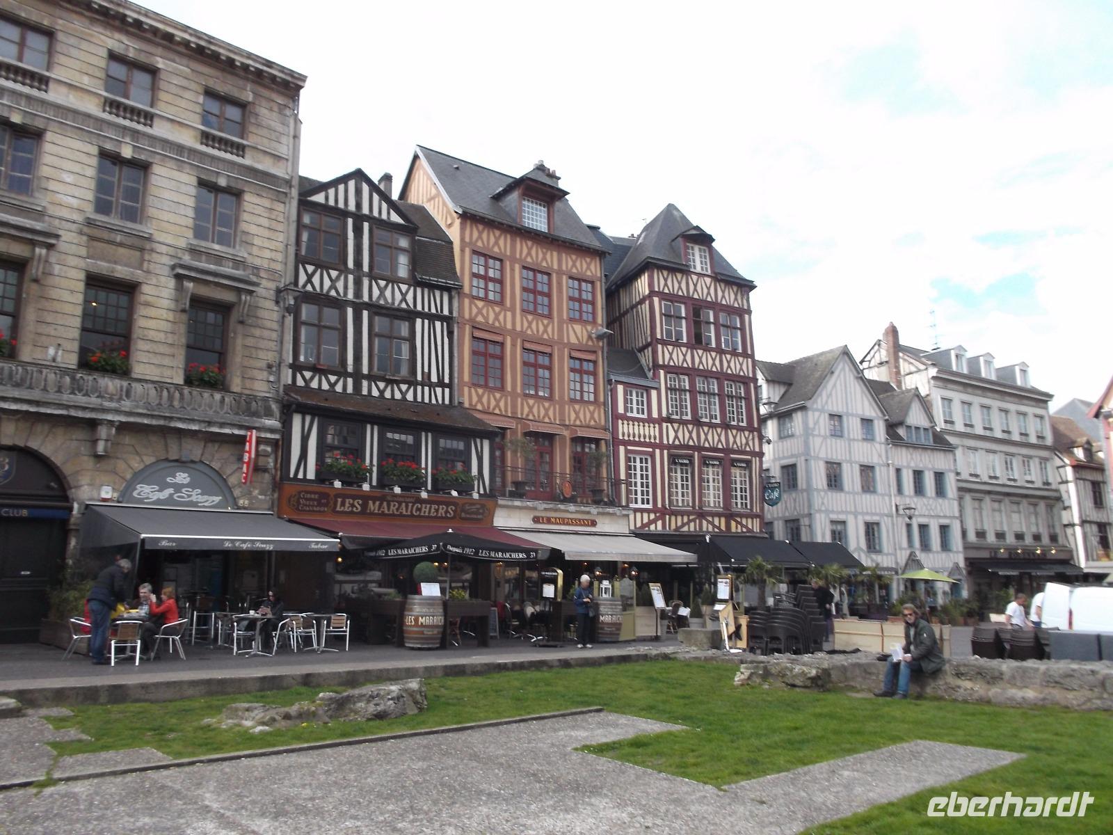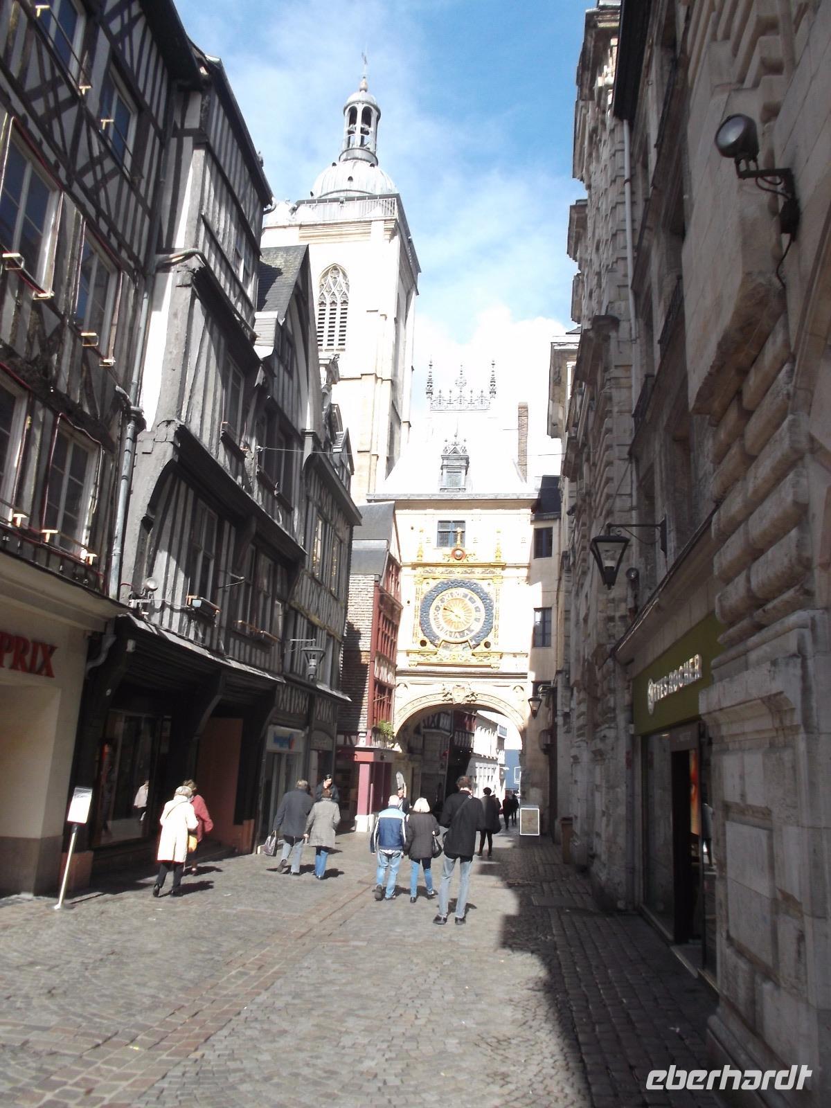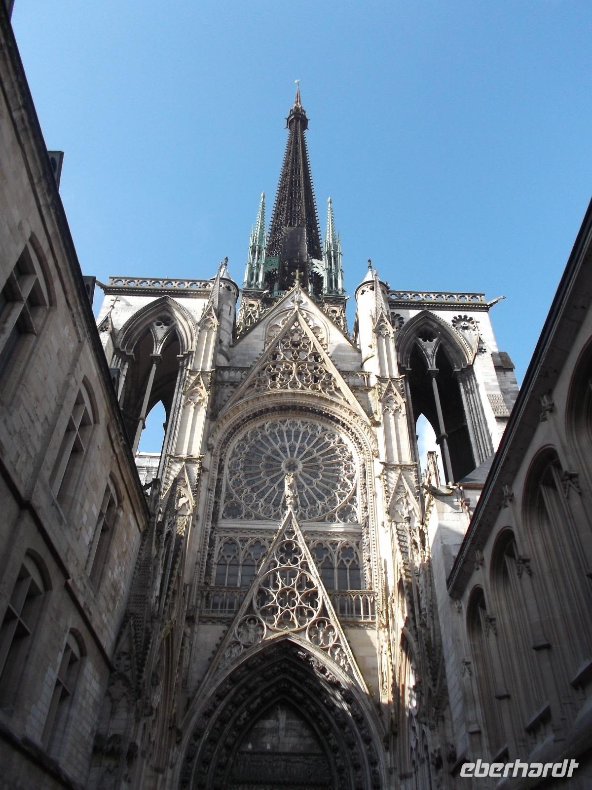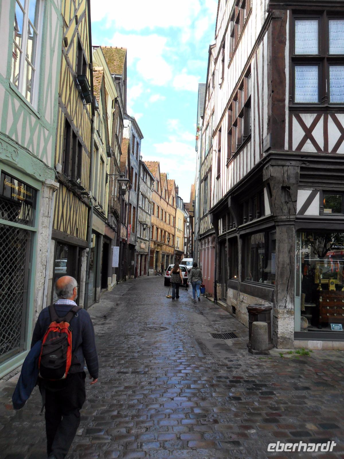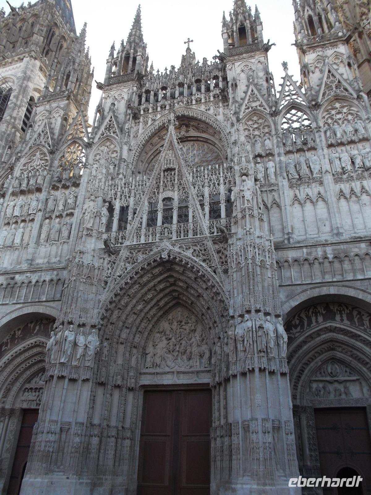 Zu Beginn des Tages erwartete uns ein ausführlicher Stadtrundgang in der normannischen Hauptstadt Rouen. Er begann am Platz vor der herrlichen Kathedrale - wie die schon zwei Tage zuvor kurz besuchte von Metz eine der bedeutendsten und schönsten in Frankreich und ein weiteres Paradestück der französischen Gotik. Vom gegenüberliegenden Renaissancehaus, heute Tourismus-Amt, hat der Maler Claude Monet die herrliche Westfassade immer wieder gemalt und mit den entstandenen 33 Bildern eine der bekanntesten Motivreihen des Impressionismus geschaffen, die ihm letztlich zum künstlerischen Durchbruch verhalf. Die filigran wirkenden Strebewerke und Verzierungen der Seitenaufbauten, die beiden Türme der Kirche, Wimperge und verschwenderisches Maßwerk, eine Fensterrosette und vieles mehr gehören zu den Besonderheiten der Kathedrale von Rouen. Es begeistert der Figurenschmuck der westlichen Schaufassade zwischen den Türmen, von denen einer „Butterturm" genannt wird, da sein Bau aus Sonderzahlungen in der Fastenzeit, dem sogenannten „Butterpfennig" finanziert wurde: Das Innere nimmt - trotz niedrigerer Gewölbehöhe als in Metz - auch mit einer phantastischen Raumwirkung und dem Eindruck sich wahrlich inmitten der Gotik zu befinden, gefangen. Wir hatten etwas Zeit, den eindrucksvollen Kirchenraum zu erkunden, bevor wir ihn durch das nördliche Seitenportal - aussen verziert mit „Höllenbildern", die vor den Gefahren sündhaften Lebens warnen sollen, wieder verließen. An der Nordseite der Kirche finden beginnen die Viertel mit den uralten malerischen Fachwerkhäusern der Altstadt von Rouen und hier befindet sich auch - direkt an die Kirche gebaut - der nur noch als Ruine erhaltene alte Bischofspalastes. Hier war der Schauplatz des Prozesses gegen die französische Nationalheilige Jeanne d'Arc. Diese, bekannt als die „Jungfrau von Orleans" spielt eine bedeutende Rolle in der Geschichte. Sie hatte im 15. Jahrhundert im grausamen „hundertjährigen Krieg" Englands gegen Frankreich Partei ergriffen und als in Rüstung dem französischen Heer voranreitende Anführerin wohl die Wende des Krieges und damit wohl den Sieg Frankreichs herbeigeführt. Als 1430 die Engländer sie gefangen nahmen, veranstaltete man hier in Rouen einen Schauprozess wegen Ketzerei verurteilte sie 1431 genau in dem Gerichtssaal an der Kathedrale von Rouen zum Tode auf dem Scheiterhaufen.