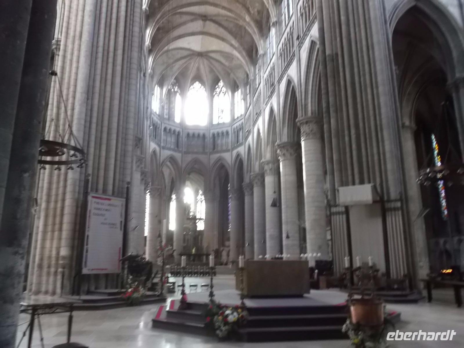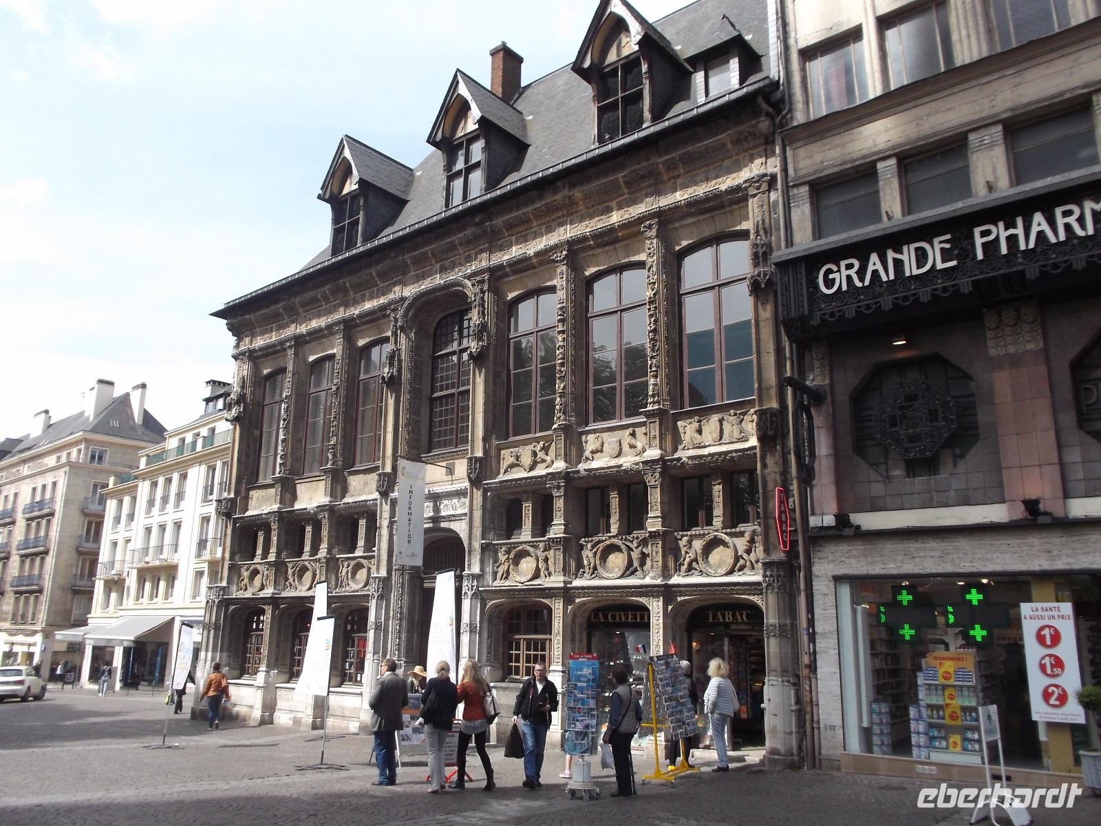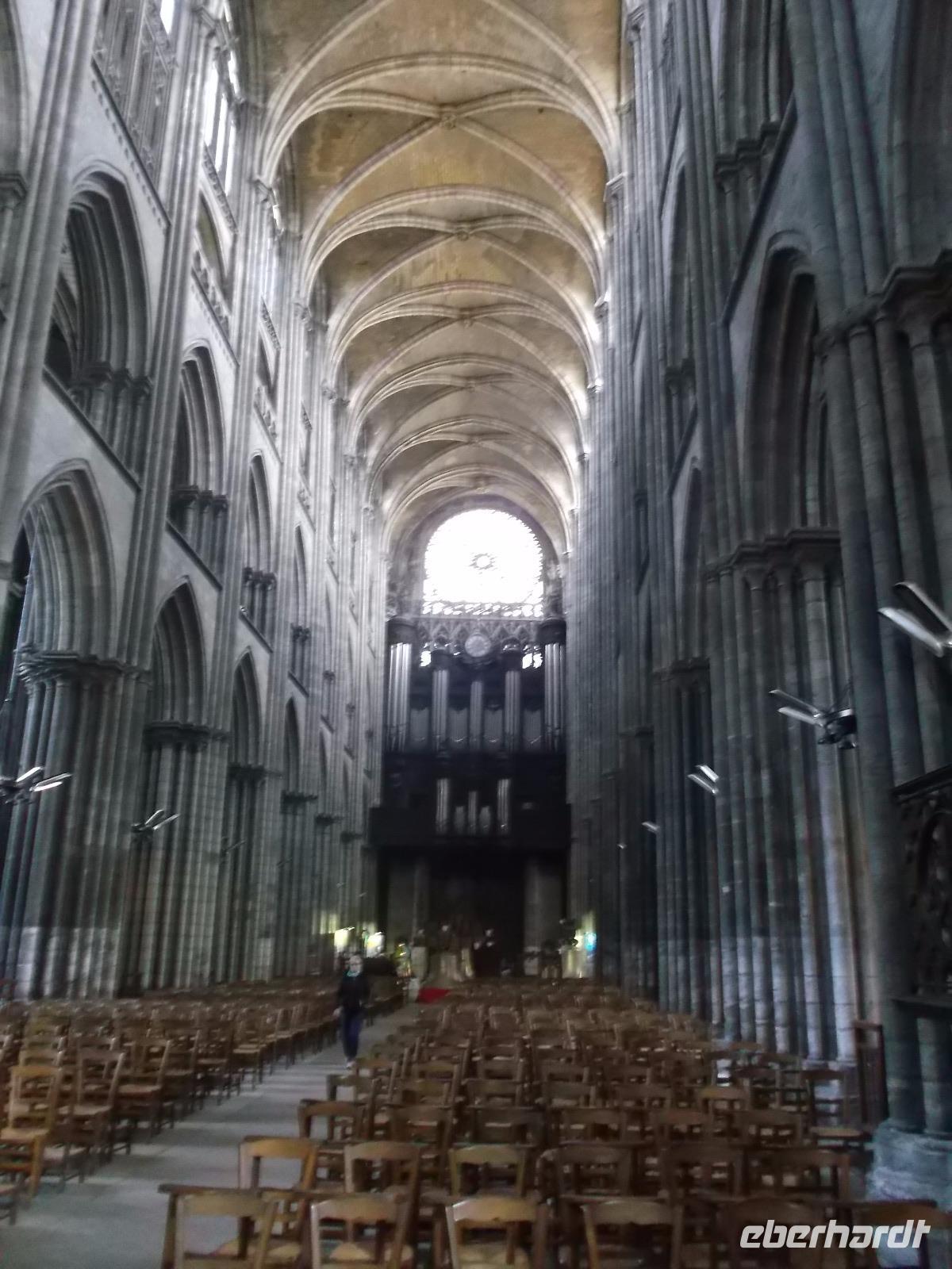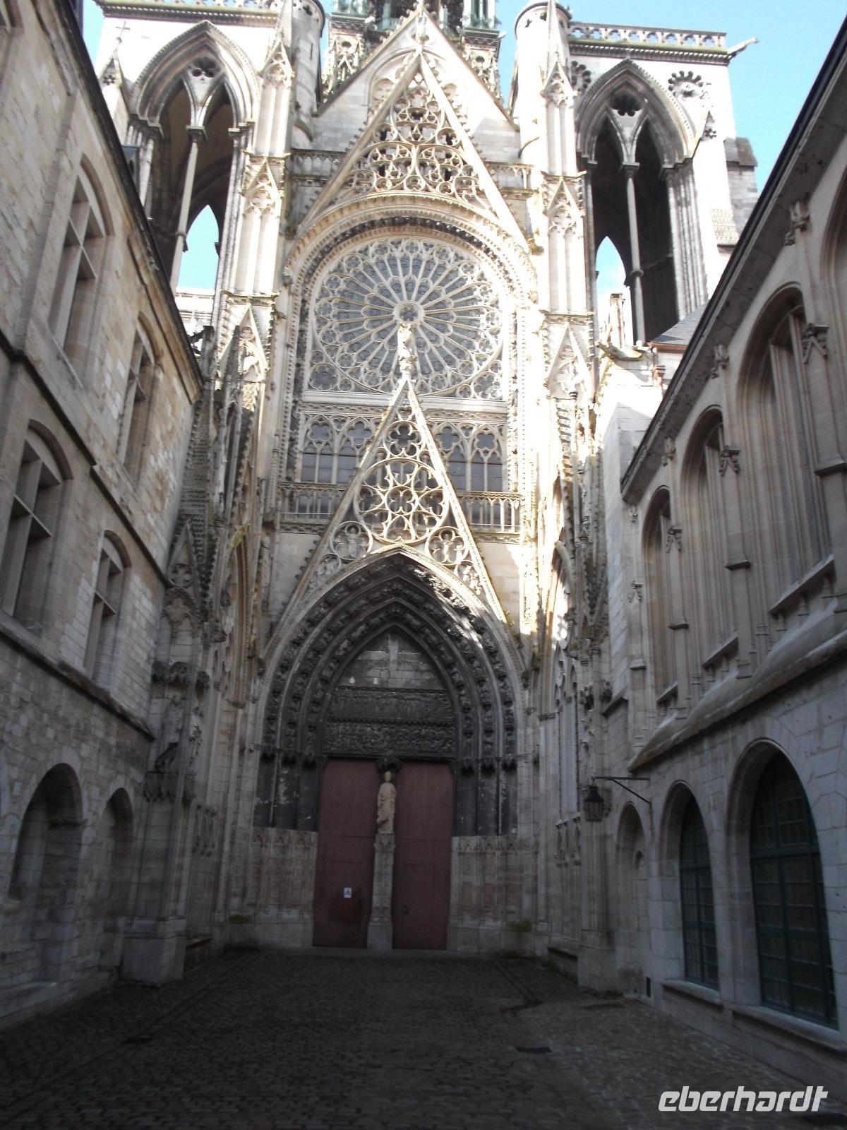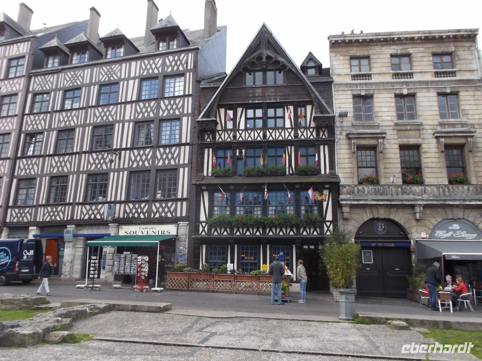Zu Beginn des Tages erwartete uns ein ausführlicher Stadtrundgang in der normannischen Hauptstadt Rouen. Er begann am Platz vor der herrlichen Kathedrale - wie die schon zwei Tage zuvor kurz besuchte von Metz eine der bedeutendsten und schönsten in Frankreich und ein weiteres Paradestück der französischen Gotik. Vom gegenüberliegenden Renaissancehaus, heute Tourismus-Amt, hat der Maler Claude Monet die herrliche Westfassade immer wieder gemalt und mit den entstandenen 33 Bildern eine der bekanntesten Motivreihen des Impressionismus geschaffen, die ihm letztlich zum künstlerischen Durchbruch verhalf. Die filigran wirkenden Strebewerke und Verzierungen der Seitenaufbauten, die beiden Türme der Kirche, Wimperge und verschwenderisches Maßwerk, eine Fensterrosette und vieles mehr gehören zu den Besonderheiten der Kathedrale von Rouen. Es begeistert der Figurenschmuck der westlichen Schaufassade zwischen den Türmen, von denen einer „Butterturm" genannt wird, da sein Bau aus Sonderzahlungen in der Fastenzeit, dem sogenannten „Butterpfennig" finanziert wurde: Das Innere nimmt - trotz niedrigerer Gewölbehöhe als in Metz - auch mit einer phantastischen Raumwirkung und dem Eindruck sich wahrlich inmitten der Gotik zu befinden, gefangen. Wir hatten etwas Zeit, den eindrucksvollen Kirchenraum zu erkunden, bevor wir ihn durch das nördliche Seitenportal - aussen verziert mit „Höllenbildern", die vor den Gefahren sündhaften Lebens warnen sollen, wieder verließen. An der Nordseite der Kirche finden beginnen die Viertel mit den uralten malerischen Fachwerkhäusern der Altstadt von Rouen und hier befindet sich auch - direkt an die Kirche gebaut - der nur noch als Ruine erhaltene alte Bischofspalastes. Hier war der Schauplatz des Prozesses gegen die französische Nationalheilige Jeanne d'Arc. Diese, bekannt als die „Jungfrau von Orleans" spielt eine bedeutende Rolle in der Geschichte. Sie hatte im 15. Jahrhundert im grausamen „hundertjährigen Krieg" Englands gegen Frankreich Partei ergriffen und als in Rüstung dem französischen Heer voranreitende Anführerin wohl die Wende des Krieges und damit wohl den Sieg Frankreichs herbeigeführt. Als 1430 die Engländer sie gefangen nahmen, veranstaltete man hier in Rouen einen Schauprozess wegen Ketzerei verurteilte sie 1431 genau in dem Gerichtssaal an der Kathedrale von Rouen zum Tode auf dem Scheiterhaufen.