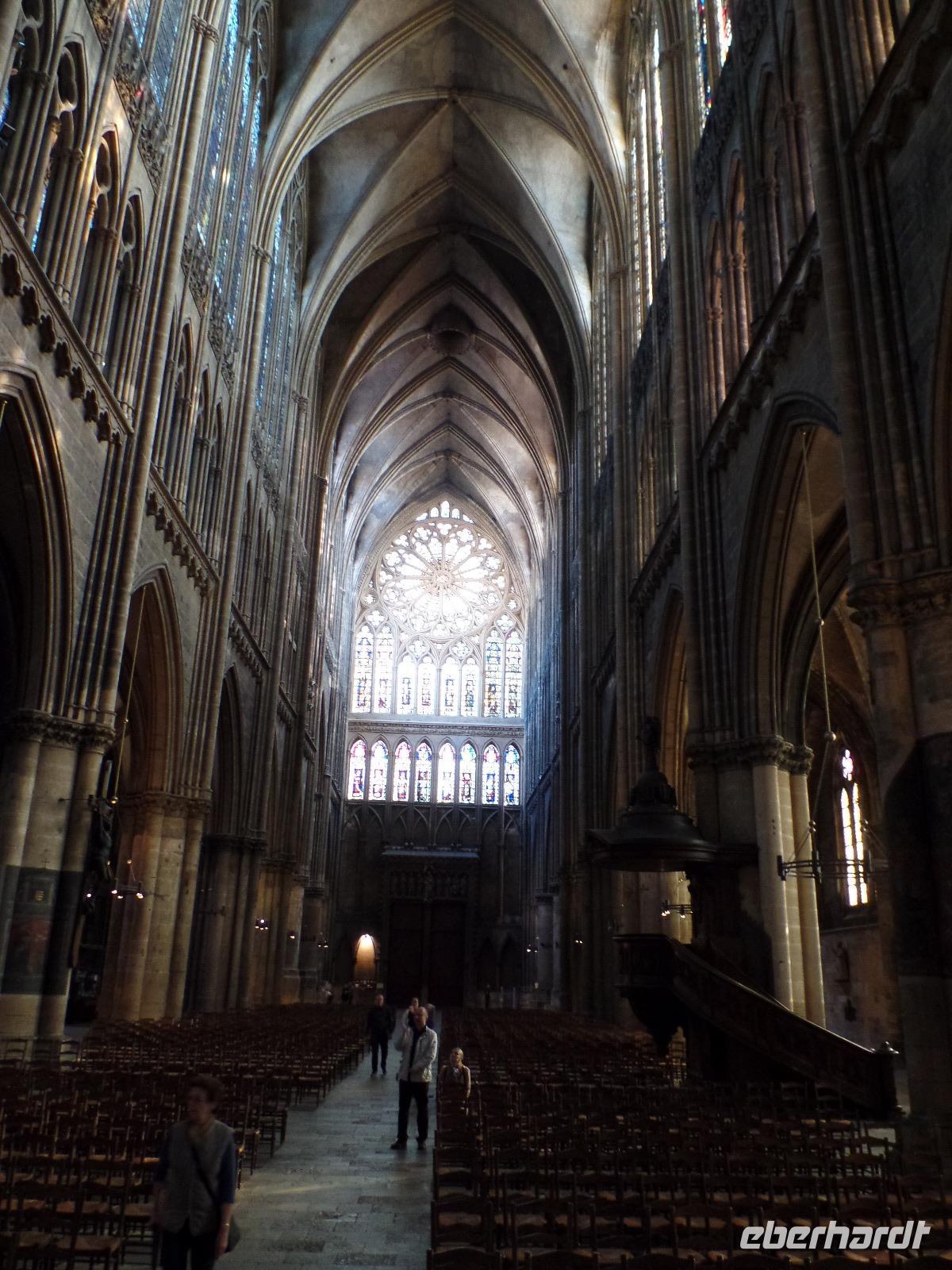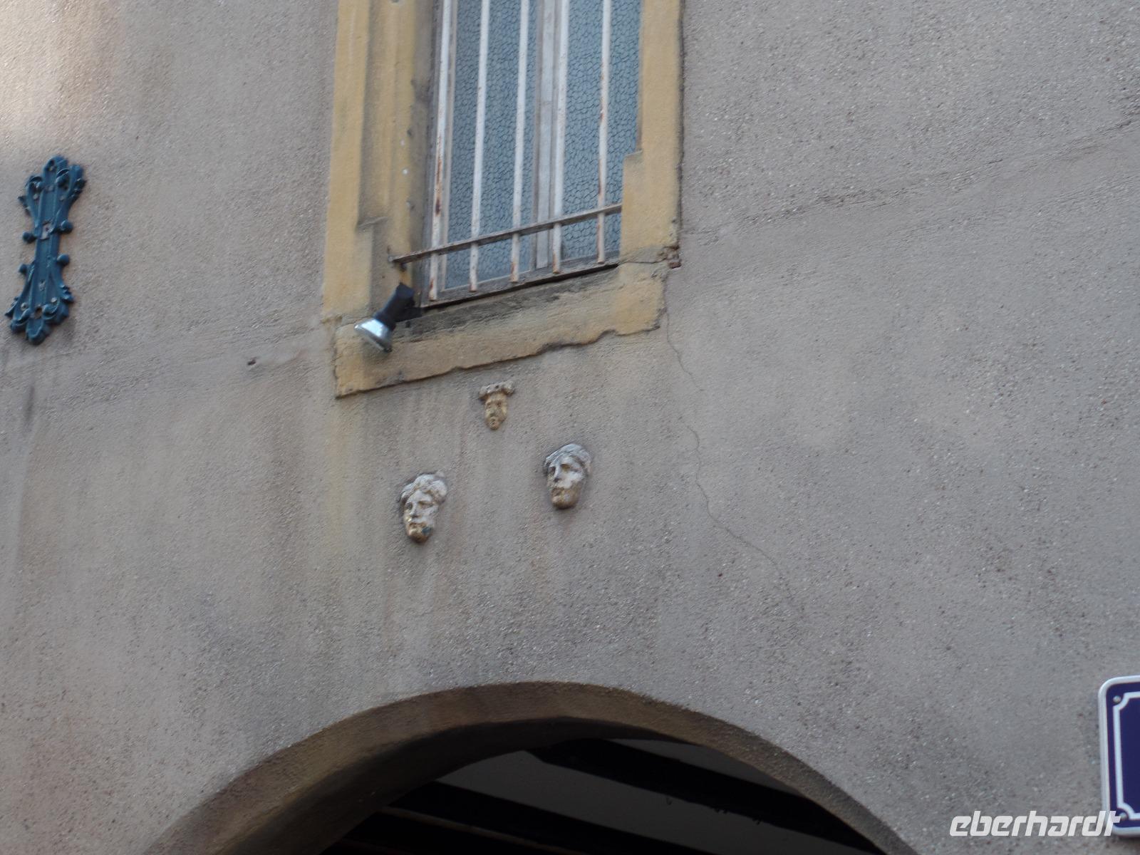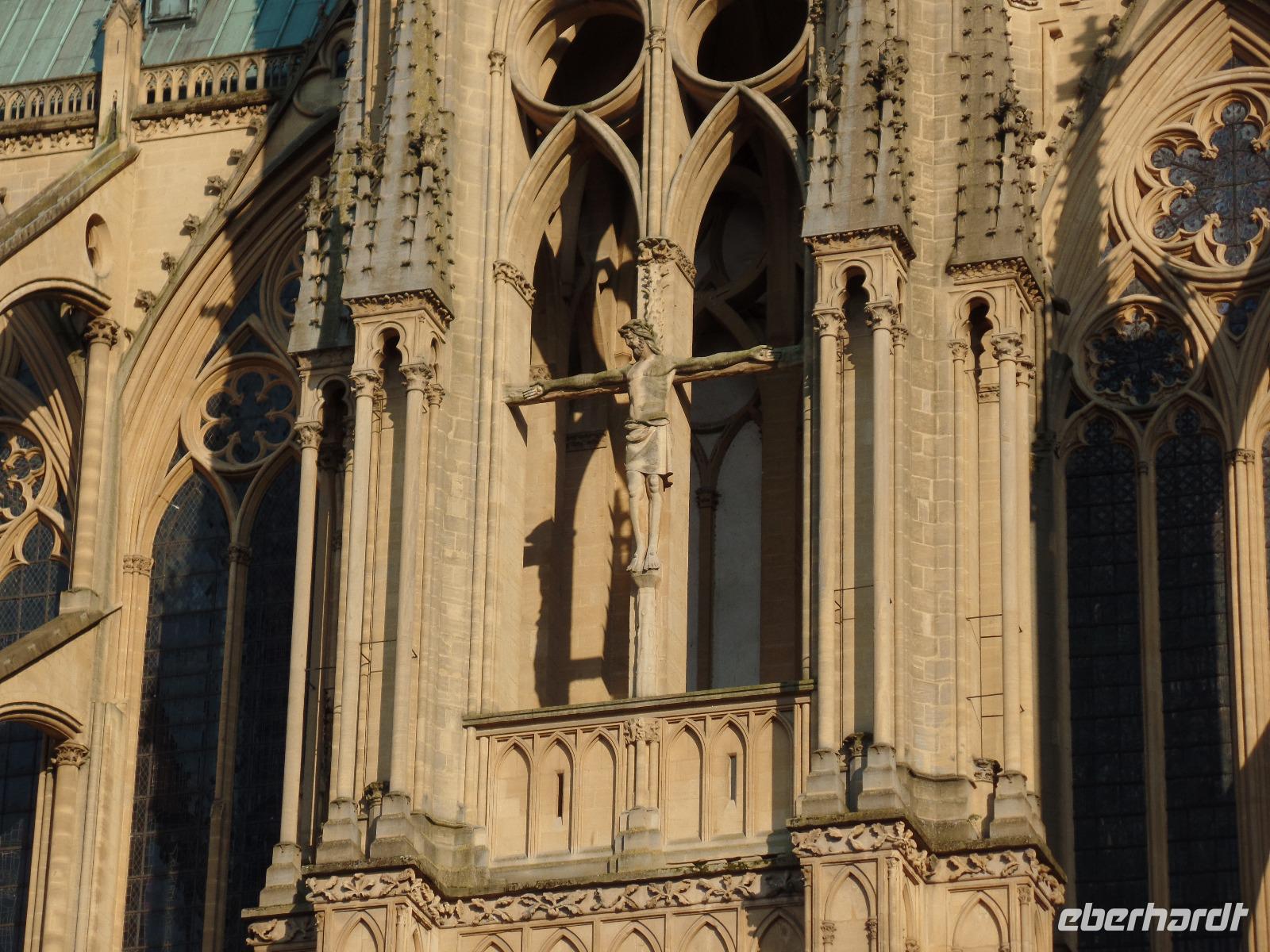 Die Zeit bis zum Abendessen nutzten wir hier in Metz noch zu einem kleinen Rundgang. Nicht allzuweit von unserem „Kyriad"-Hotel lag die recht hübsche Altstadt, wenn auch infolge des Feiertahges nicht allzu belebt. An einem der historischen Märkte führte unser Weg vorbei und am „Maison de Tete d'Or". Das alte Gebäude ist mit seltsamen, einst vergoldeten Köpfen verziert, die eine Legende andeuten, die von der Zerstörung der Stadt durch Attila, den Hunnenkönig, berichtet. Metz war Teilhauptstadt des fränkischen Reiches und ist schon sehr lange Bischofssitz. Diesem Umstand verdankt es auch seine bedeutende, herrliche Kathedrale Saint-Étienne. Nach Überquerung des großen Paradeplatzes der Garnisonsstadt Metz, dessen eine Längsseite die Kathedrale, die ändere das klassizistische Rathaus einnimmt und an dessen rechter Schmalseite die ebenfalls klassizistische Hauptwache steht, konnten wir die zwischen 1220 und 1520 errichtete gotische Kathedrale betreten. Staunen war angesagt über die ungewöhnliche Höhe des gotischen Mittelschiffs, die dieser Kirche eine gewaltige Raumwirkung beschert. Tatsächlich ist Saint-Étienne von Metz nicht nur einer der größten und schönsten Sakralbaten Frankreichs, sondern mit fast 42 m ist sein Gewölbe nach dem knapp einen Meter höheren von Amiens und dem fragil wirkenden Chor der Kathedrale von Beauvais (48,5 m), die aber nie fertiggestellt wirkte, das dritthöchste gotische Gewölbe der Welt. Außerdem prunkt das Bauwerk noch mit wundervollen farbigen Glasfenstern aus dem späten Mittelalter, wozu sich zwei sehr schöne Fenster gesellen, die der berühmte Maler Marc Chagall in den fünfziger Jahren des 20. Jh. gestaltete. Auf dem höchsten Punkt der Altstadt über der die Stadt durchfließenden Mosel gelegen beherrscht St.-Étienne auch bereits von weitem das Stadtbild - wie muss es vor der wesentlich später erfolgten Bebauung auf vorbeiziehende Händler, Pilger oder Reisende gewirkt haben, den von einer Terrasse gestützten Dombau von weitem zu sehen, der in der Mitteletage seines Turmes ein steinernes Bildnis des Gekreuzigten präsentierte...