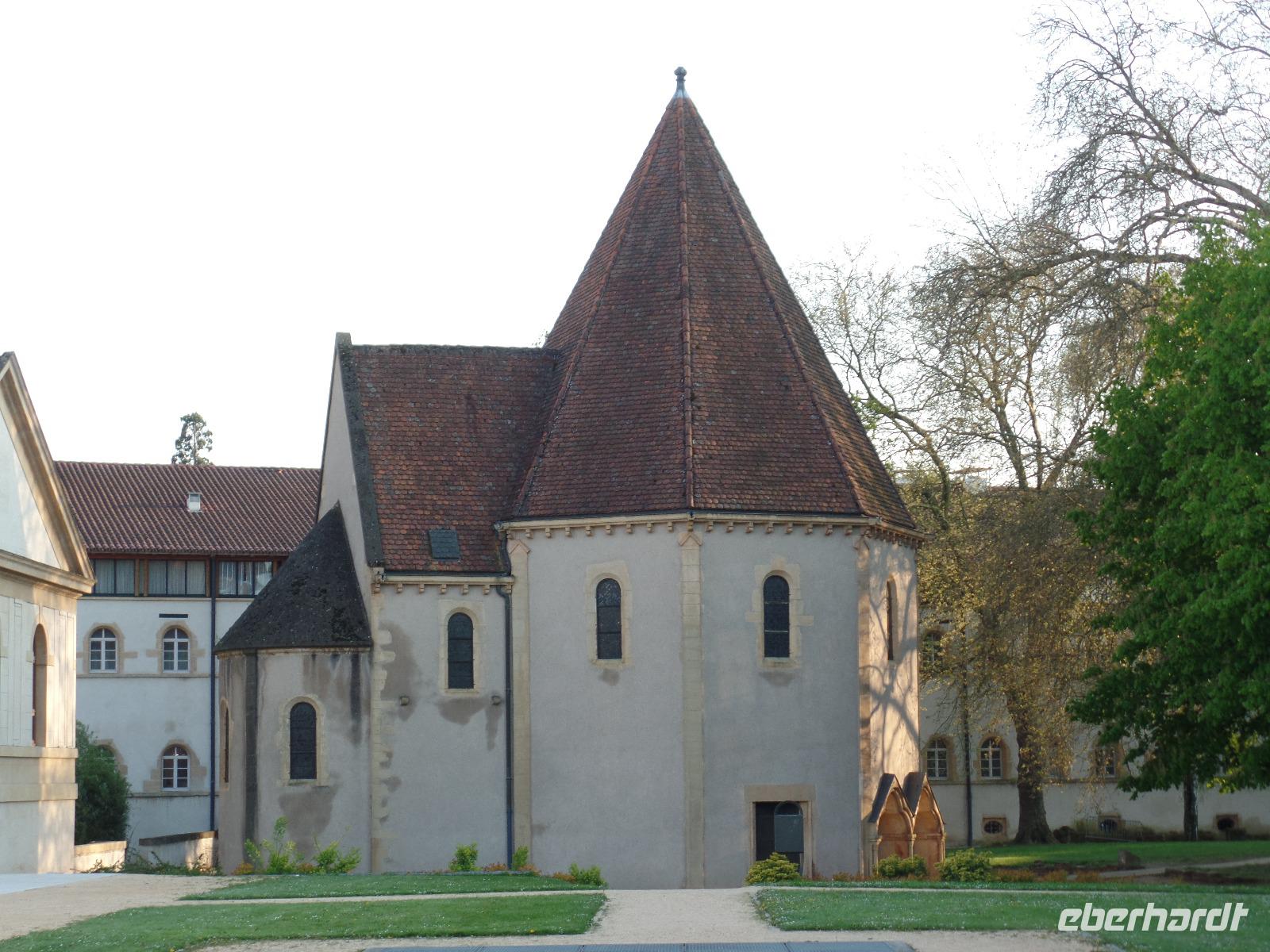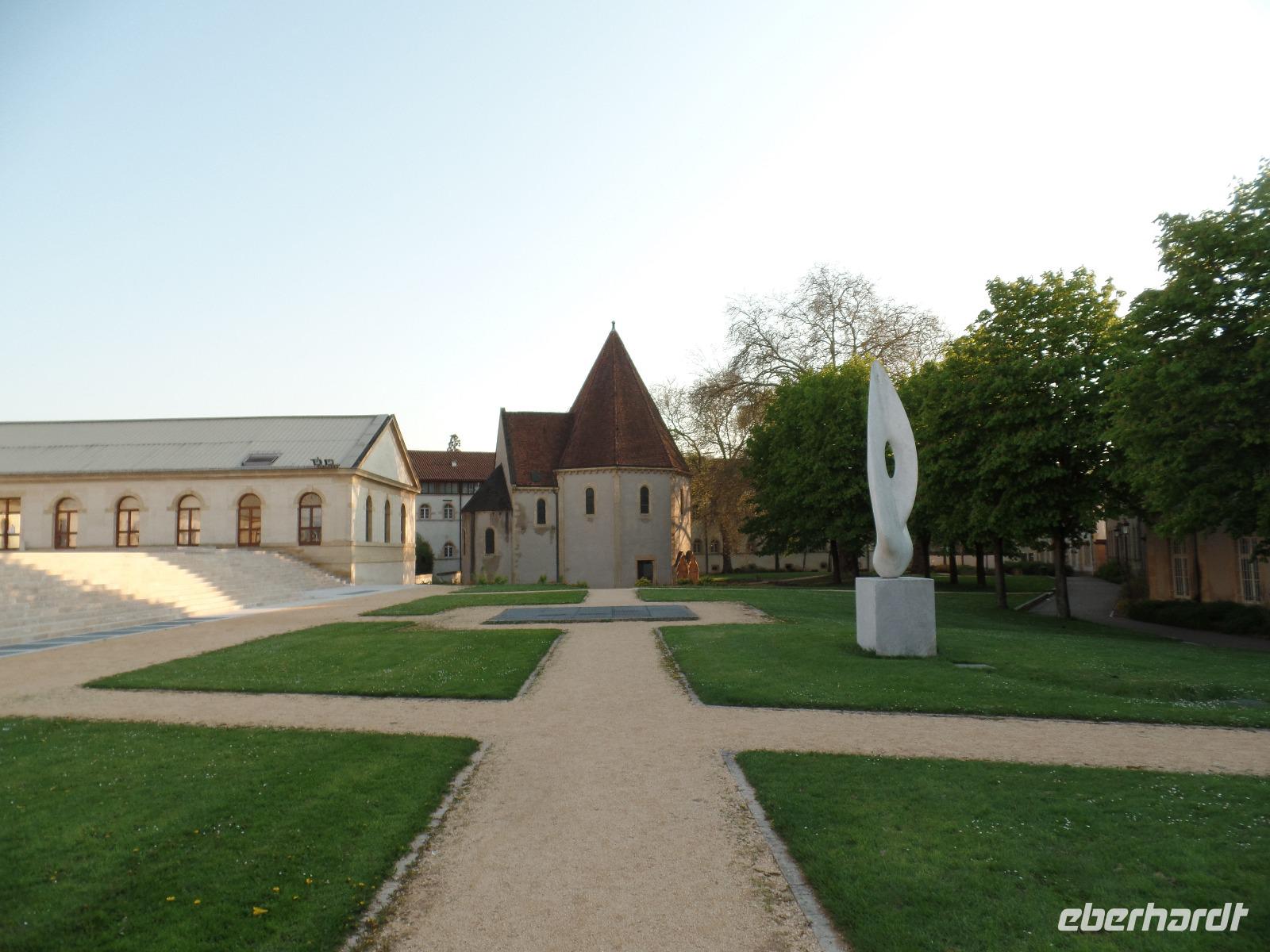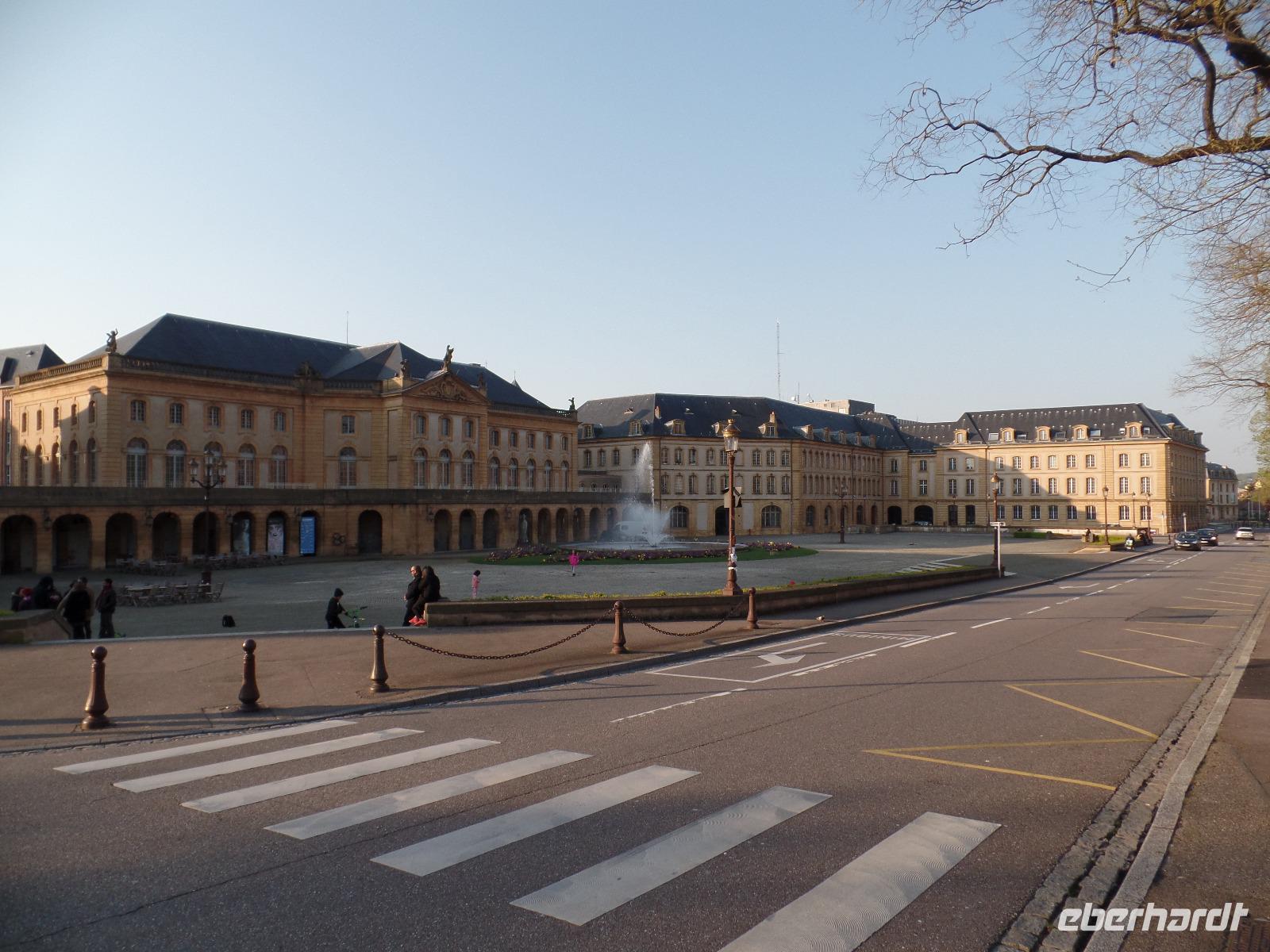 Nach kurzem Besuch in der Kathedrale führte uns ein kurzer Spaziergang über die hier durch eine Insel geteilte Mosel zum genau auf dieser liegenden Theaterplatz. Das vermutlich älteste original erhaltene Theater Frankreichs stammt aus der Zeit vor der Revolution 1789 und bildet ein Ensemble mit einer Anlage aus Brunnen und Blumenrabatten und der danebenliegenden Präfektur von Lothringen. Beim weiteren Gang zurück über die Mosel zur alten Zwingerbefestigung der Esplanade, wo gerade jahrelange Bauarbeiten abgeschlossen wurden, konnten wir dann noch einen Blick auf die berühmte spätromanische Templerkapelle werfen - errichtet nach dem Vorbild der Kapelle von Laon, vielleicht die zweitälteste ihrer Art und letzter Rest der einstigen Templerkomturei.