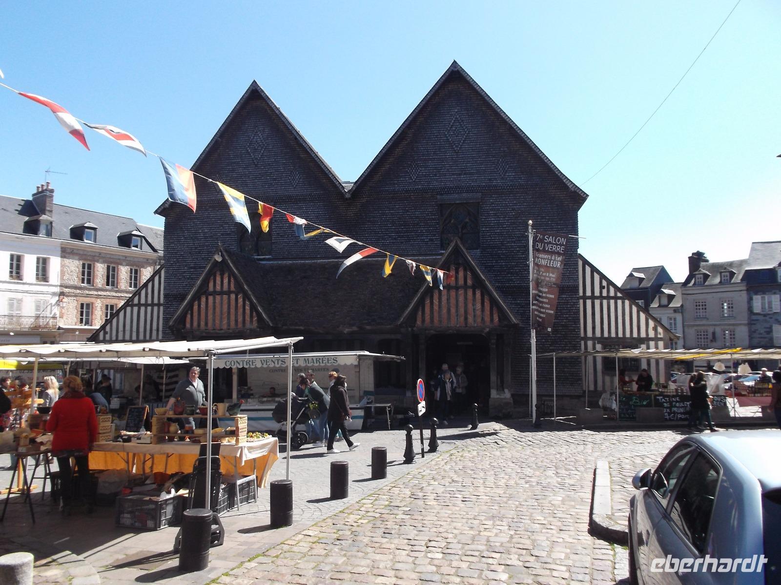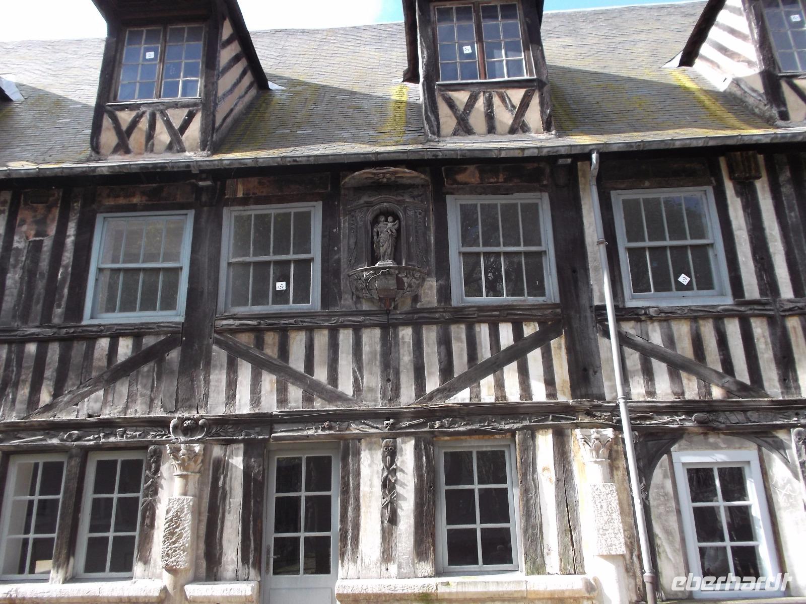 Unser nächster Besuch galt der pittoresken Hafenstadt Honfleur. Dass sie eine der bedeutendsten normannischen Touristenattraktionen ist und immer wieder bedeutende Künstler anzieht, verdankt sie vor allem dem von malerischen hohen, schiefergedeckten Häusern umstandenen alten Hafenbecken. Sein unverwechselbares Ambiente und die malerischen Gassen der Altstadt, die auf Stelzen stehenden hölzernen Kirchtürme, der kleine Markt und die danebenstehende, Ende des 15. Jh. von Schiffsbaumeistern aus Holz errichtete zweischiffige Kirche lässt ihn immer wieder zum Motiv namhafter Künstler werden - man behauptet, sogar die Stilrichtung und der Name der impressionistischen Malerei stammten von hier! Das älteste Gebäude, die „Lieutenanterie", das alte Haus des Hafengouverneurs, war leider komplett eingerichtet, aber die historische Katherinenkirche, ein einzigartiges Werk, konnten wir besuchen. Da sie kurz nach dem französischen Sieg im hundertjährigen Krieg erbaut wurde, fehlten überall nicht nur Geld, sondern auch Baumeister und Steinmetze fehlten. Die wenigen verbliebenen waren in den großen Städten zum Wiederaufbau der Kathedralen. In Honfleur besann man sich auf Vorhandenes: Schiffszimmerleute erbauten die zweischiffige Kirche mitsamt ihrem malerischen freistehenden Glockenturm angeblich aus dem Materialien abgewrackter Schiffe.