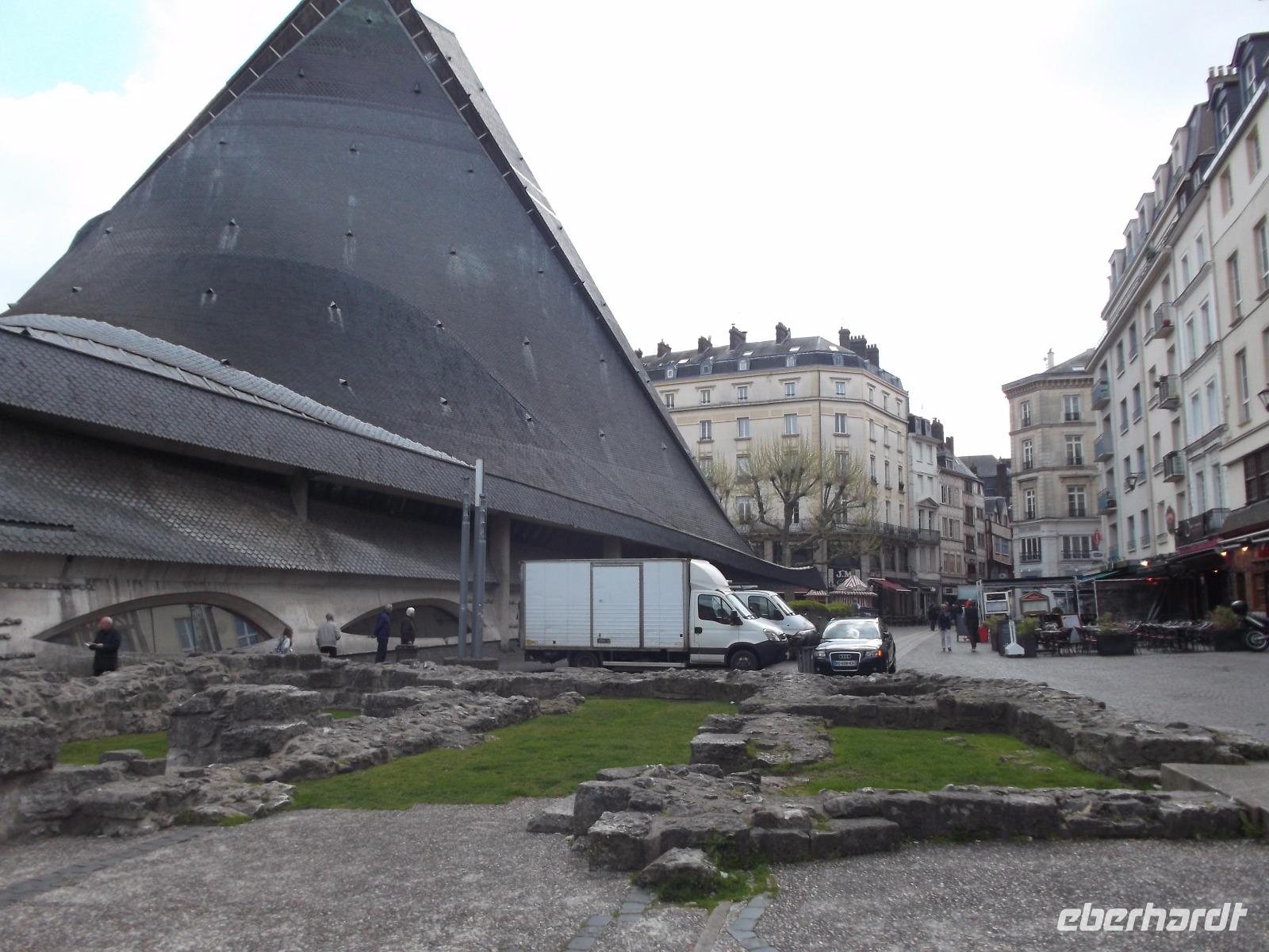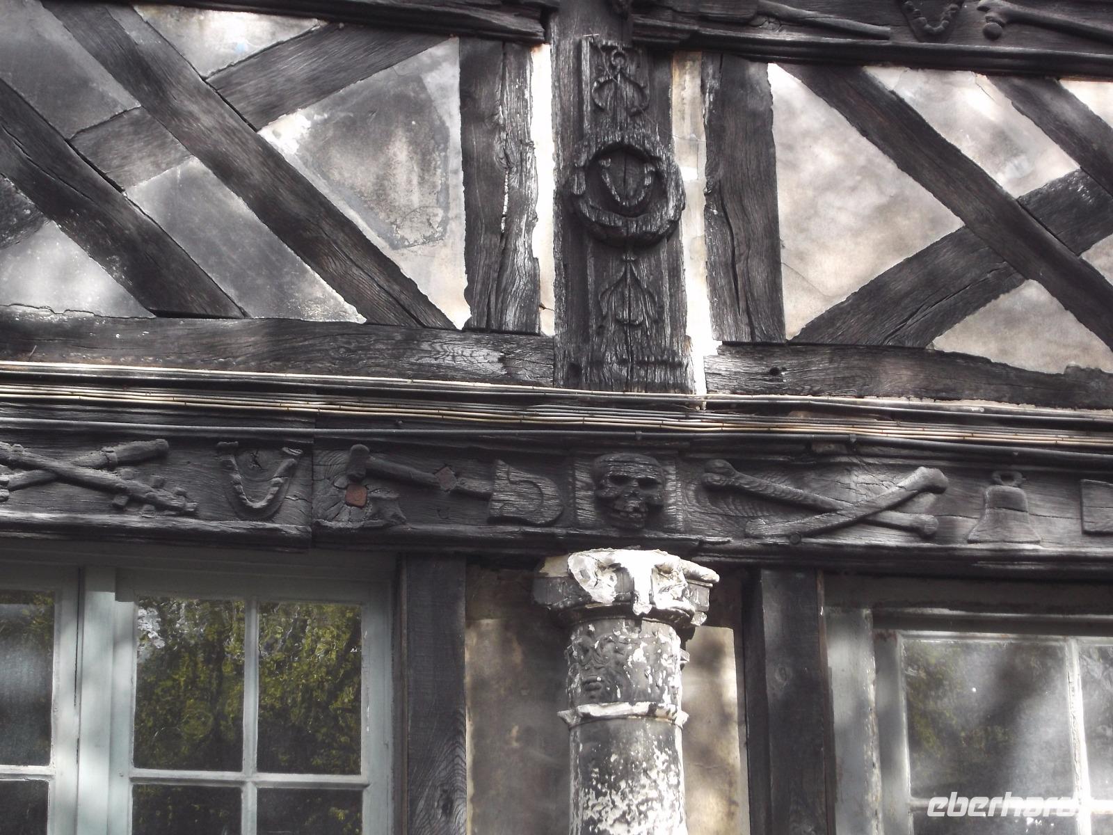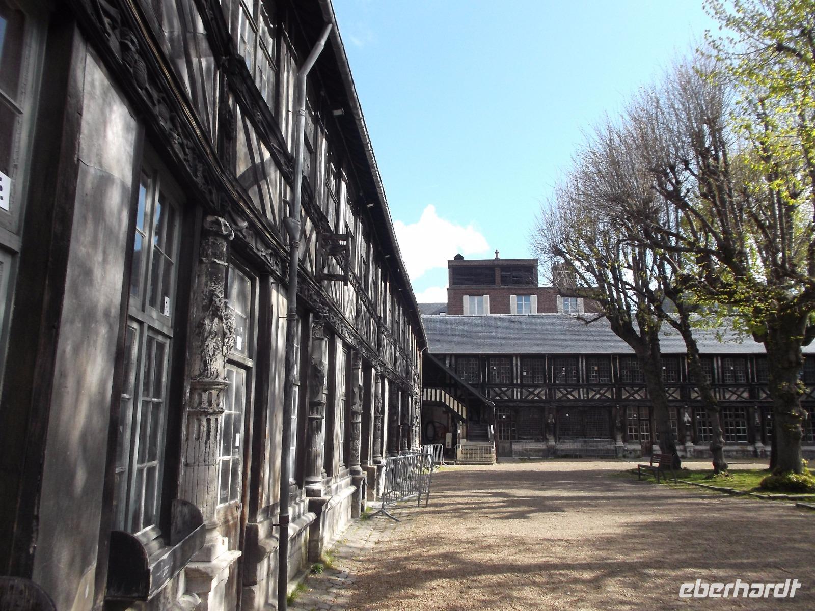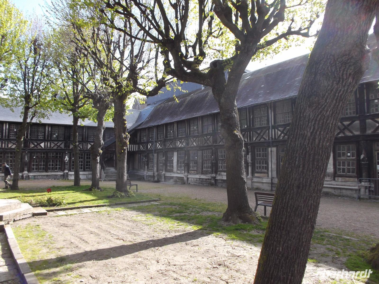 Mitten im Fachwerkviertel m die Maclou-Kirche liegt die vielleicht makaberste Sehenswürdigkeit in der Hauptstadt der Normandie. Das „Aitre de Maclou", ein versteckt liegender viereckiger Hof, ist ein alter Pestfriedhof. Von allen Seiten umgeben ihn zweistöckige, hübsche Fachwerkgebäude, die bei näherem Hinsehen mit teilweise uralten Verzierungen versehen sind: Schnitzereien, die Totenköpfe, menschliche Gebeine und Beerdigungswerkzeuge darstellen. Gleichzeitig stellt dieses Bauwerk eines der ältesten geschlossenen Fachwerkensembles in Europa dar und ist heute eine Kunstschule.
