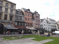 Bei unserem weiteren Rundgang durch die Altstadt sahen wir den herrlich verzierten historischen Parlamentsbau der Normandie, heute Justizpalast, in den Formen der Spätgotik bis zur Frührenaissance. Weiter ging es durch den Uhrturm mit seiner astronomischer Uhr neben dem hoch aufragenden Belfried - untergebracht im alten Torbau zur Geschäftsstraße der Altstadt. Unser Rundgang endete am alten Markt von Rouen, der, umstanden von historischen Fachwerkhäusern als wichtigstes Zentrum der Stadt neben dem Kathedralenplatz galt. Hier wurde 1431 die Nationalheldin Jeanne d'Arc verbrannt - die Stelle ihrer Hinrichtung markiert heute ein gewaltiges Gedenk-Kreuz aus Holz und Beton, an dem recht frische Blumen liegen ... Lange nach ihrem Tod ließ der französische König - der sie nach ihrer Gefangennahme im Stich gelassen hatte - ihren Prozeß neu aufrollen und sie an der Stelle ihrer Verurteilung 1455 rehabilitieren. Die katholische Kirche sprach die unschuldig Verurteilte 1920 heilig. Neben der Verbrennungsstätte wurde 1979 eine Kathedrale zu ihrem Gedenken errichtet. Der architektonisch bemerkenswerte - wenn auch im Geschmack der Einwohner nicht unumstrittene - Bau aus Stahlbetonbau hat die Form eines stilisierten Drachen - enthält aber als Höhepunkt 500 m² farbiger mittelalterlicher Glasfenster, die aus der im Weltkrieg zerstörten alten Marktkirche gerettet werden konnten.