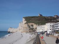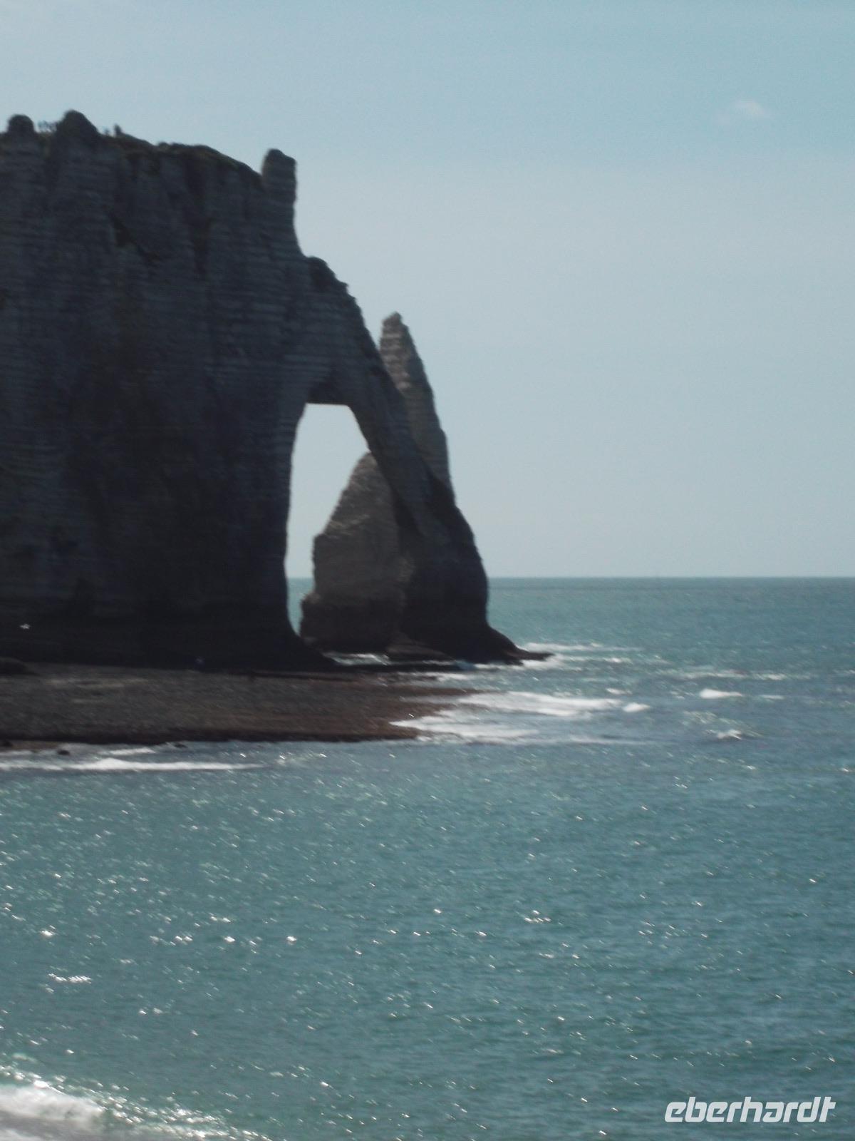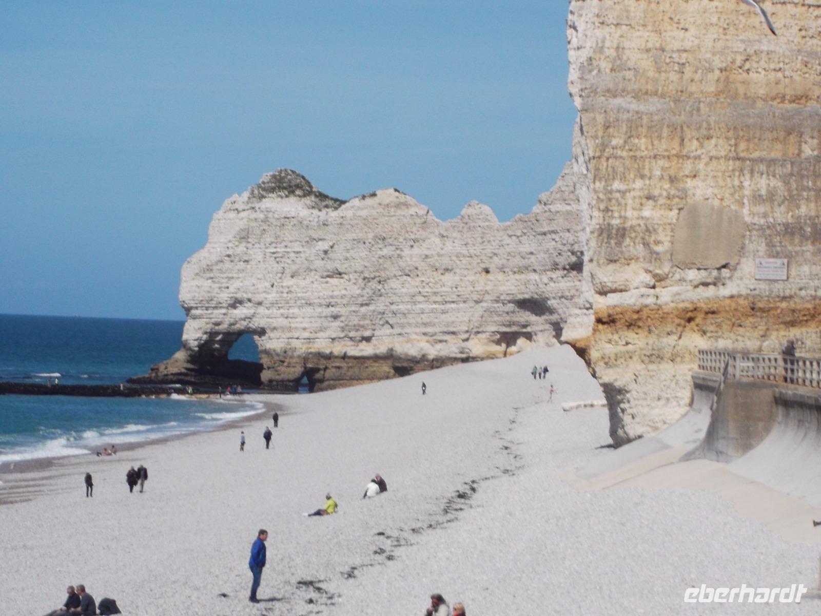 Unser nächster Programmpunkt war Ètretat, ein für seine umgebenden Felsformationen berühmtes normannisches Seebad. Bei einem kurzen Spaziergang vom Busparkplatz zum Strand durchquert man das malerische Städtchen. Dann erreicht man die Schotterküste und hat freien Blick auf die Kreidefelsen. Ihre wunderlichen Formen hat allein die Natur geschaffen und ihnen den Namen „Elefantenfelsen" eingebracht. Jedem Betrachter wird der Grund sofort klar, denn die Formen der vielfach durchbrochenen Steilküste erinnern von fern an im Wasser stehende Elefanten.