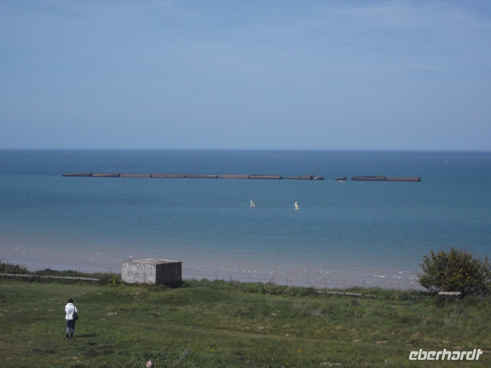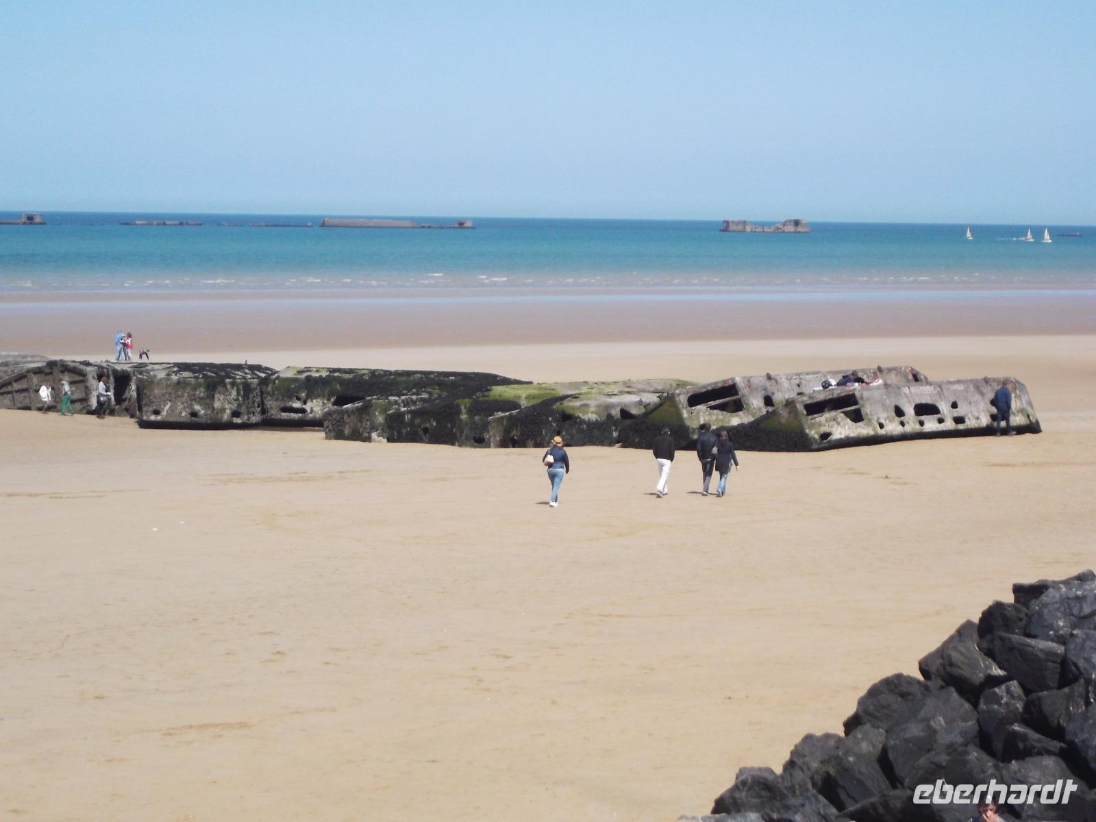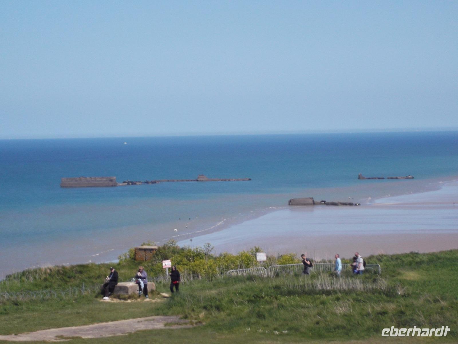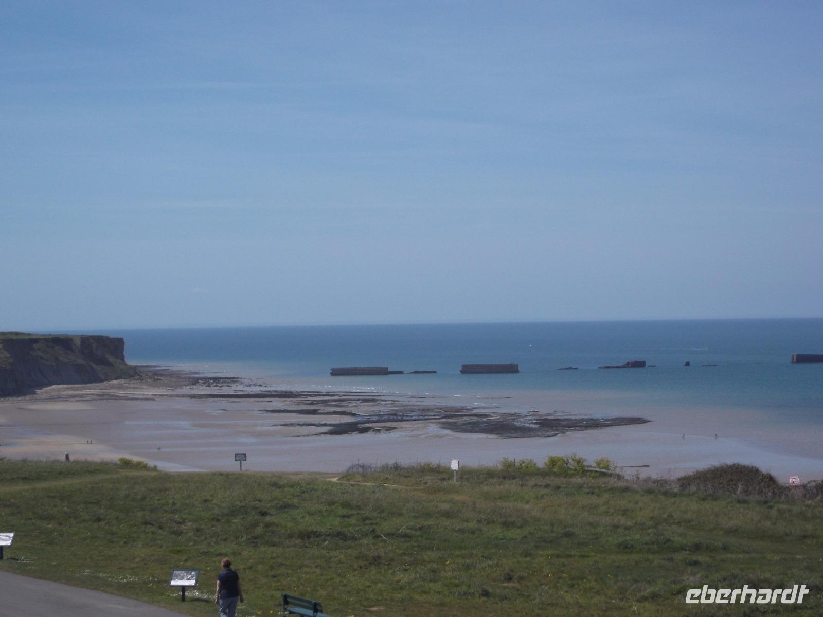 Als wir nach einer angemessenen Pause Honfleur verließen, machten wir uns auf den Weg über die Autobahn zur berühmten „Landungsküste". Nördlich der zweitgrößten normannischen Stadt Caen liegenden die Küstenabschnitte, an denen die wohl spektakulärste Aktion des 2. Weltkrieges stattfand, die letztlich das Kriegsende herbeiführte.: die Landung der Aliierten in der Normandie im Juni 1944. Mehr als 4000 Schiffe waren an der Operation „Overlord" beteiligt, die von England aus mit den Landungstruppen der Aliierten einen Überraschungsangriff auf die deutsche Westfront startete. Das Unglaubliche daran: die Küste war für eine Landung nicht geeignet und so brachten die Allierten ihre Häfen einfach mit - sie bauten Molen und Anlegeplätze mit Hilfe von betongefüllten riesigen Senkkästen, zunächst zwischen den Schiffen transportiert und dann an der Landungsküste zu Boden gelassen. Insgesamt 33 künstliche, sogenannte „Mulberry-Häfen" wurden errichtet und zumindest bei Ebbe sind fast alle bis heute zu sehen, zusammen mit den Resten der großen Schwimmpontons und Landungsflößen. Wir besuchten einen der zentralen Landungsorte: in Arromanches sieht man überall Spuren dieser bedeutsamen Ereignisse der jüngsten Geschichte. Zunächst von einem ehemaligen Bunker als Aussichtspunkt, dann aber direkt am Strand von Arromanches konnten wir alle Details gut überblicken - hatten sogar Zeit für einen kleinen Strandspaziergang oder einen Kurzbesuch im „Landungsmuseum".