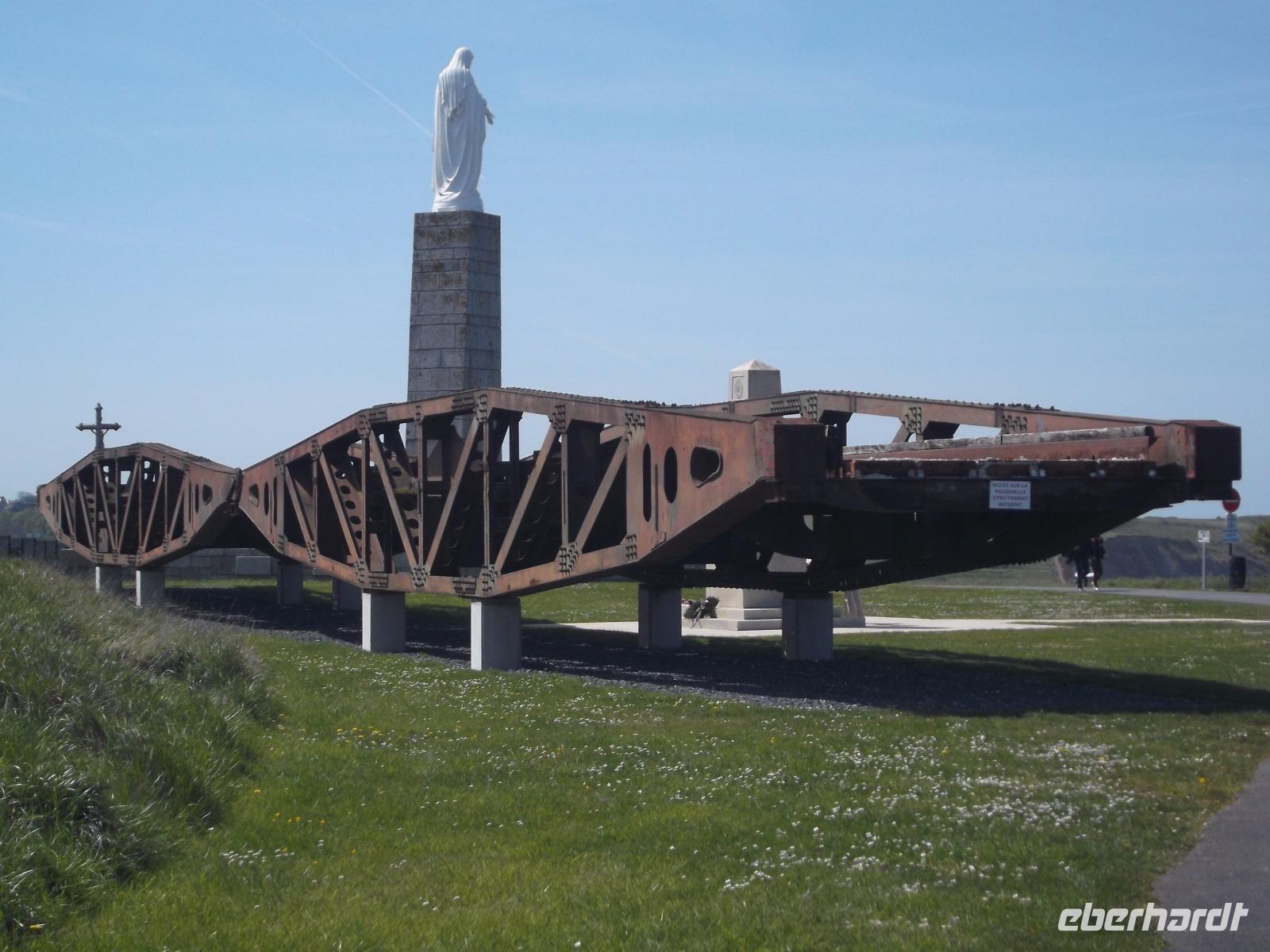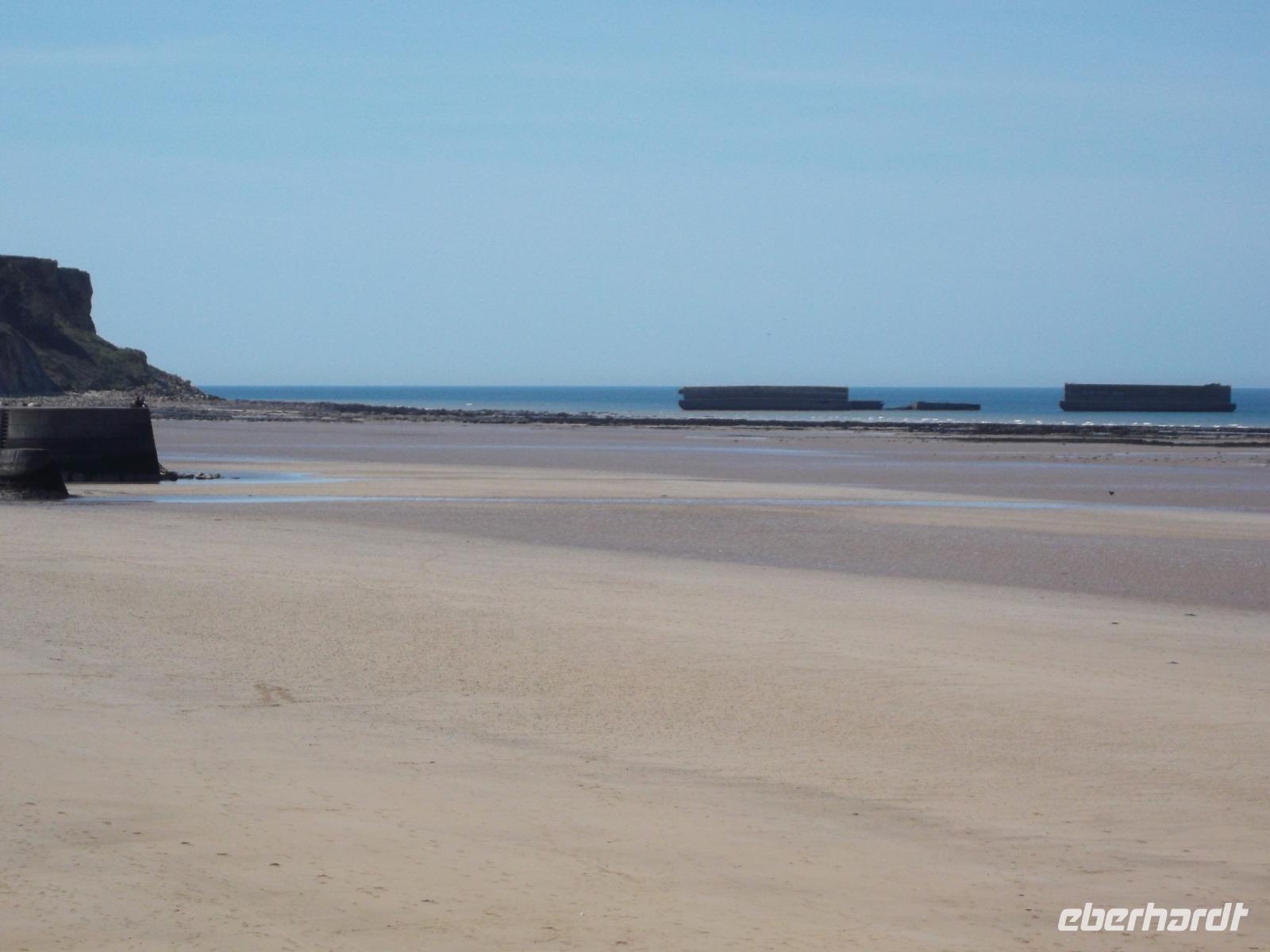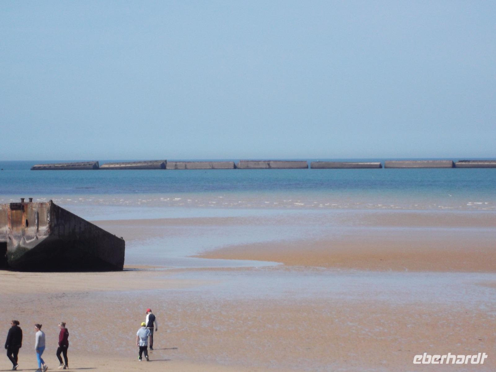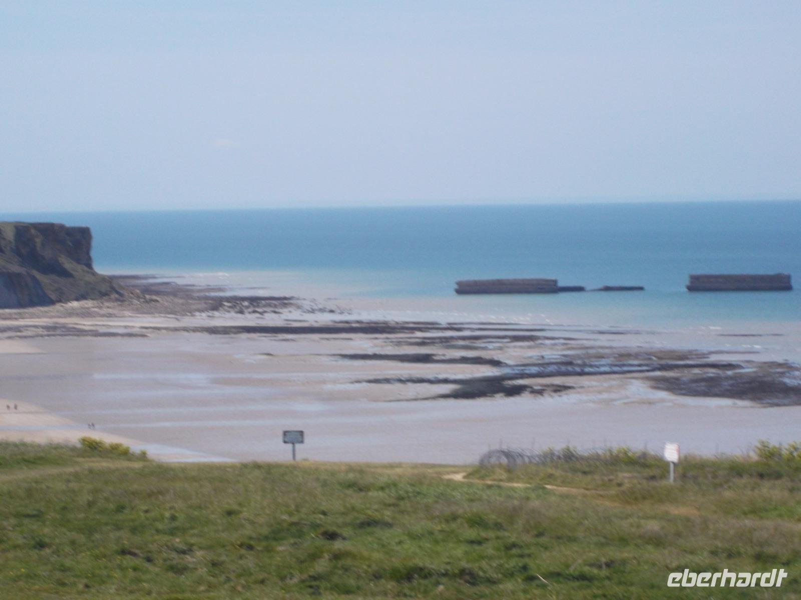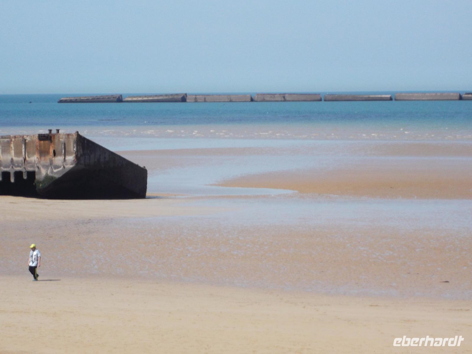 Als wir nach einer angemessenen Pause Honfleur verließen, machten wir uns auf den Weg über die Autobahn zur berühmten „Landungsküste". Nördlich der zweitgrößten normannischen Stadt Caen liegenden die Küstenabschnitte, an denen die wohl spektakulärste Aktion des 2. Weltkrieges stattfand, die letztlich das Kriegsende herbeiführte.: die Landung der Aliierten in der Normandie im Juni 1944. Mehr als 4000 Schiffe waren an der Operation „Overlord" beteiligt, die von England aus mit den Landungstruppen der Aliierten einen Überraschungsangriff auf die deutsche Westfront startete. Das Unglaubliche daran: die Küste war für eine Landung nicht geeignet und so brachten die Allierten ihre Häfen einfach mit - sie bauten Molen und Anlegeplätze mit Hilfe von betongefüllten riesigen Senkkästen, zunächst zwischen den Schiffen transportiert und dann an der Landungsküste zu Boden gelassen. Insgesamt 33 künstliche, sogenannte „Mulberry-Häfen" wurden errichtet und zumindest bei Ebbe sind fast alle bis heute zu sehen, zusammen mit den Resten der großen Schwimmpontons und Landungsflößen. Wir besuchten einen der zentralen Landungsorte: in Arromanches sieht man überall Spuren dieser bedeutsamen Ereignisse der jüngsten Geschichte. Zunächst von einem ehemaligen Bunker als Aussichtspunkt, dann aber direkt am Strand von Arromanches konnten wir alle Details gut überblicken - hatten sogar Zeit für einen kleinen Strandspaziergang oder einen Kurzbesuch im „Landungsmuseum".