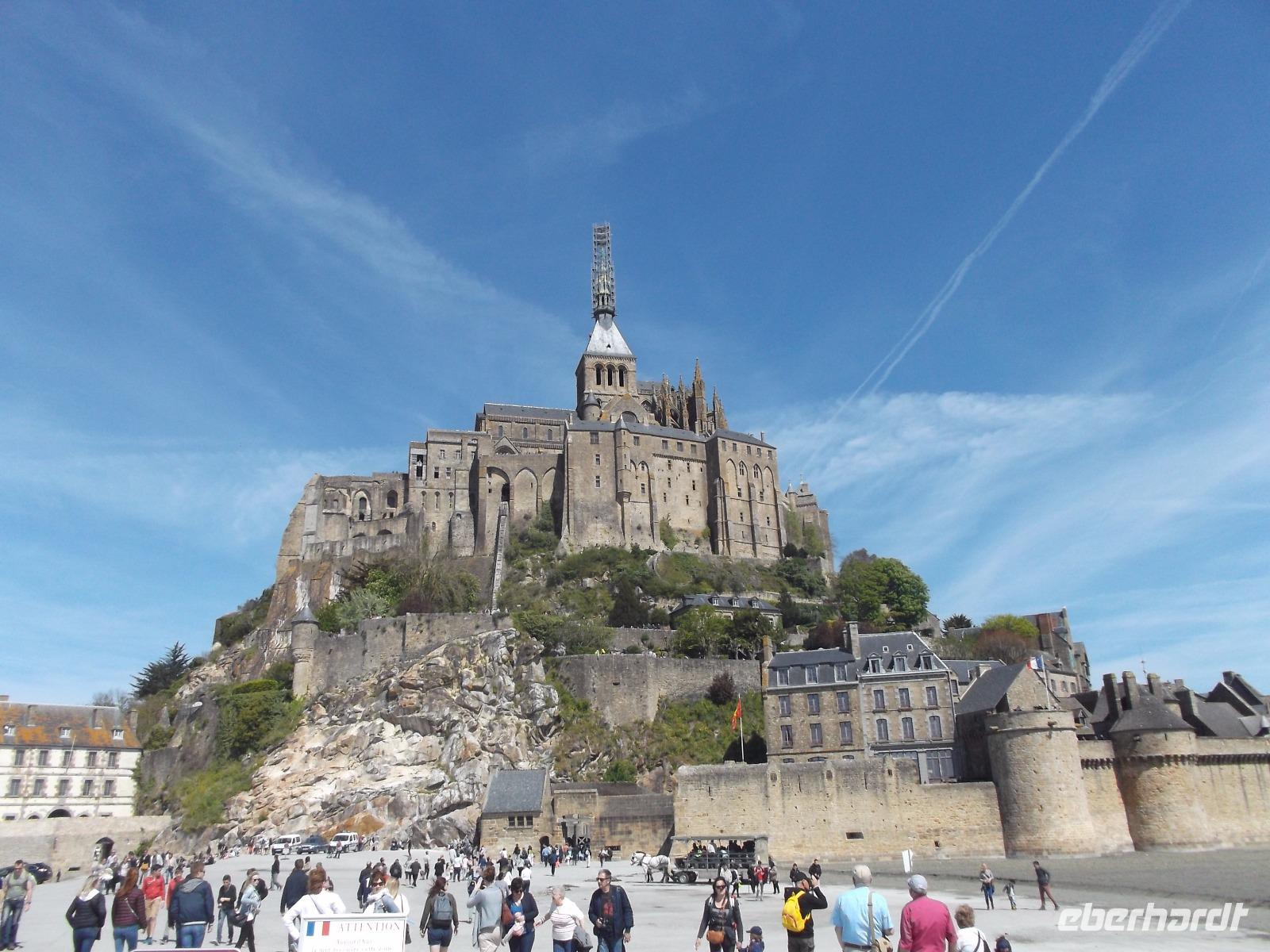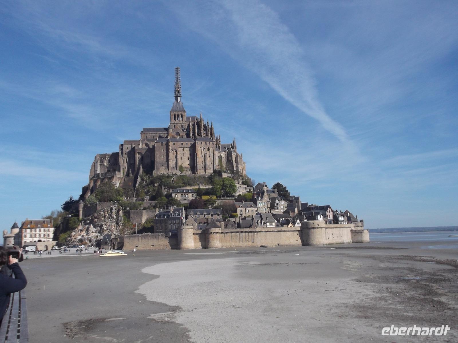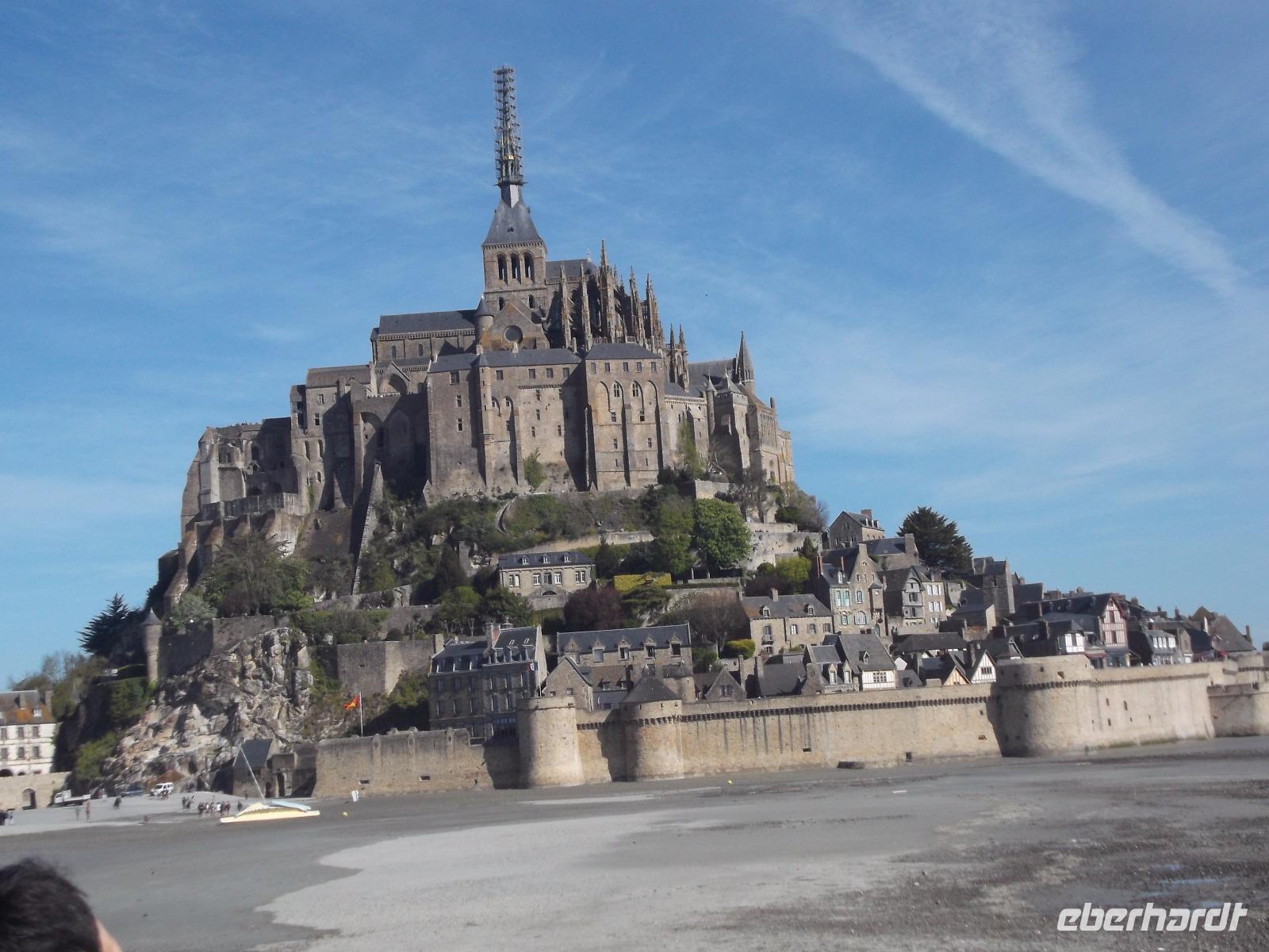 Bei herrlichem Wetter besuchten wir heute den Mont St.Michel - einer der Höhepunkte der Reise und eines der „europäischen Wunder", das man gesehen haben sollte. Nicht umsonst wurde das gewaltige, heute zum UNESCO-Weltkulturerbe gehörende Monument schon im Mittelalter „Wunder des Abendlandes" genannt. Auf einem 70 - 80 m hohen Felsen liegt der Klosterberg inmitten der Bucht von Mont St.Michael. Bei Ebbe trocken und bei Flut von Wasser umspült, hat der mit starken Befestigungsanlagen umgürtete Wallfahrtsort jahrhundertelange emsige Bautätigkeit erlebt. Die Verteidigungsanlagen, bei Flut auf Meereshöhe, umschließen gewaltige, massiv aufstrebende turmhohe Stützmauern verschiedener Bauepochen. Sie tragen die schier unglaubliche Last der Aufbauten zahlreicher Profangebäude, Schlossbauten, Kirchen und schließlich eines gewaltigen Klosters. Die Spitze der großartigen gotischen Kirchenanlage ragt heute über 150 m in den Himmel. Unverwechselbar und unvergleichlich ist der Anblick dieses vielleicht bekanntesten und bedeutendsten Gebäude-Ensembles aus der Vergangenheit Europas.