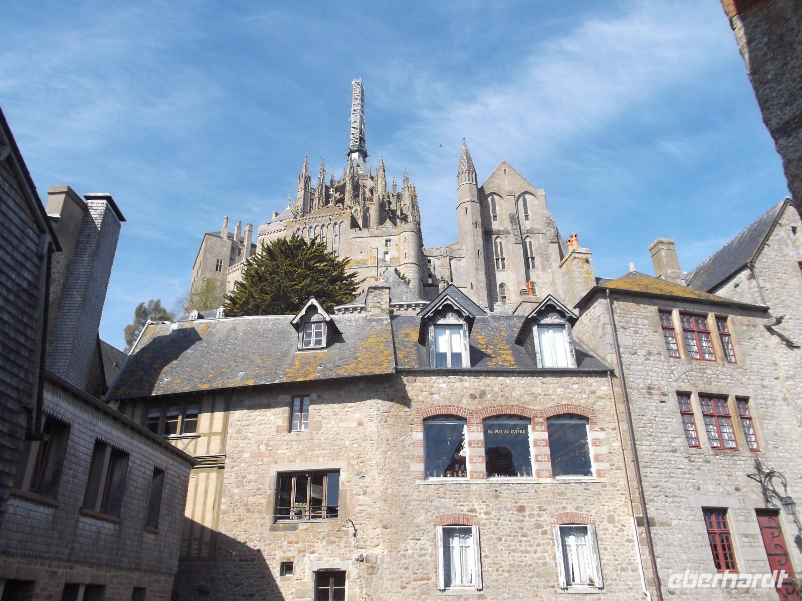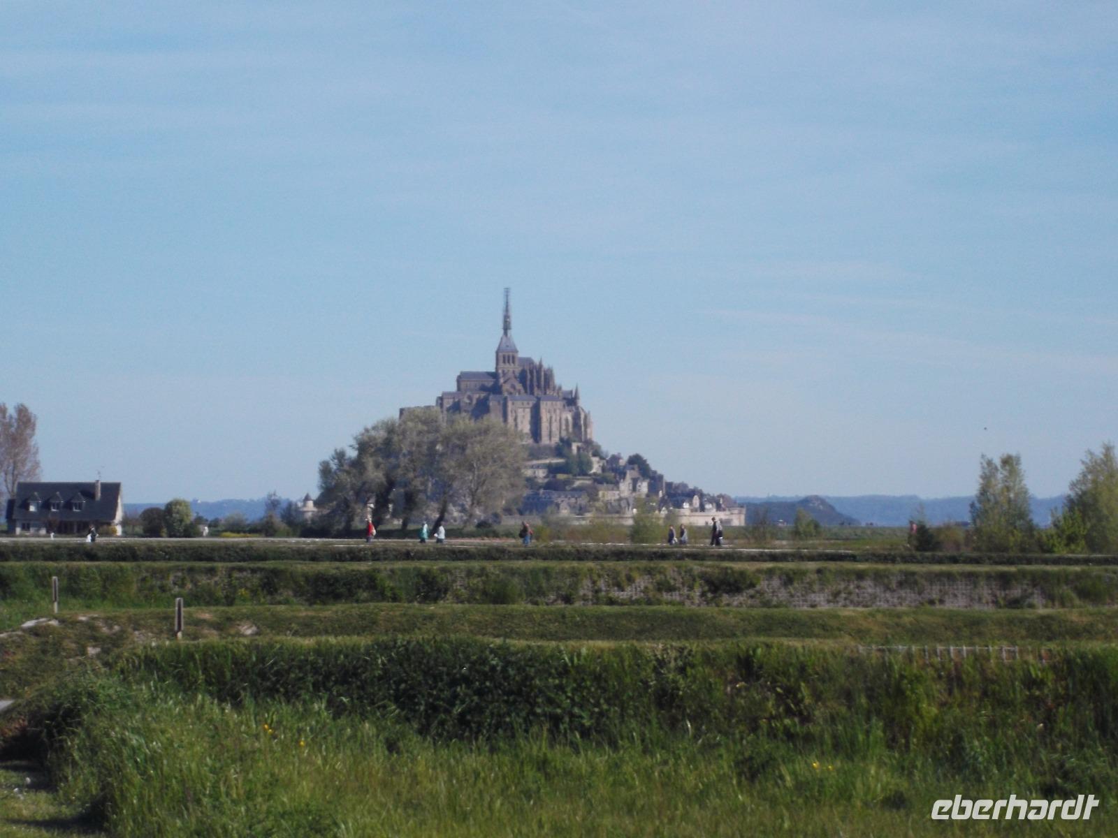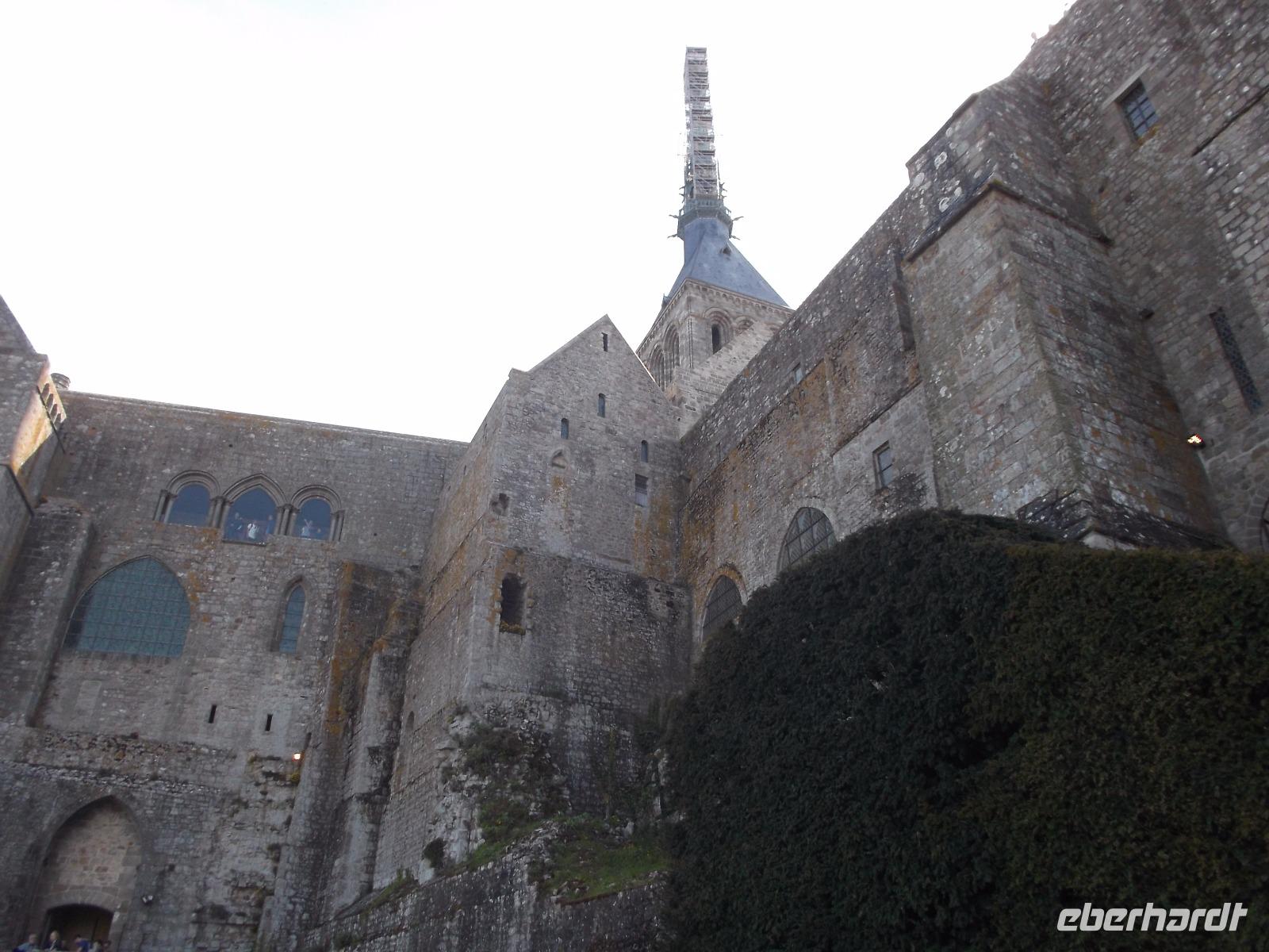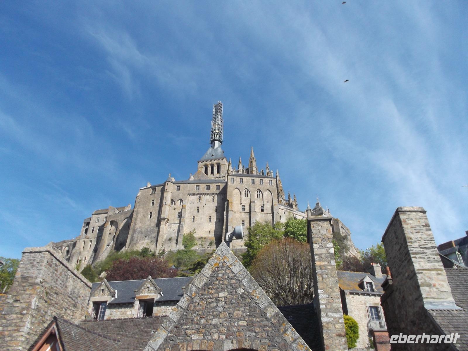 Bei herrlichem Wetter besuchten wir heute den Mont St.Michel - einer der Höhepunkte der Reise und eines der „europäischen Wunder", das man gesehen haben sollte. Nicht umsonst wurde das gewaltige, heute zum UNESCO-Weltkulturerbe gehörende Monument schon im Mittelalter „Wunder des Abendlandes" genannt. Auf einem 70 - 80 m hohen Felsen liegt der Klosterberg inmitten der Bucht von Mont St.Michael. Bei Ebbe trocken und bei Flut von Wasser umspült, hat der mit starken Befestigungsanlagen umgürtete Wallfahrtsort jahrhundertelange emsige Bautätigkeit erlebt. Die Verteidigungsanlagen, bei Flut auf Meereshöhe, umschließen gewaltige, massiv aufstrebende turmhohe Stützmauern verschiedener Bauepochen. Sie tragen die schier unglaubliche Last der Aufbauten zahlreicher Profangebäude, Schlossbauten, Kirchen und schließlich eines gewaltigen Klosters. Die Spitze der großartigen gotischen Kirchenanlage ragt heute über 150 m in den Himmel. Unverwechselbar und unvergleichlich ist der Anblick dieses vielleicht bekanntesten und bedeutendsten Gebäude-Ensembles aus der Vergangenheit Europas.