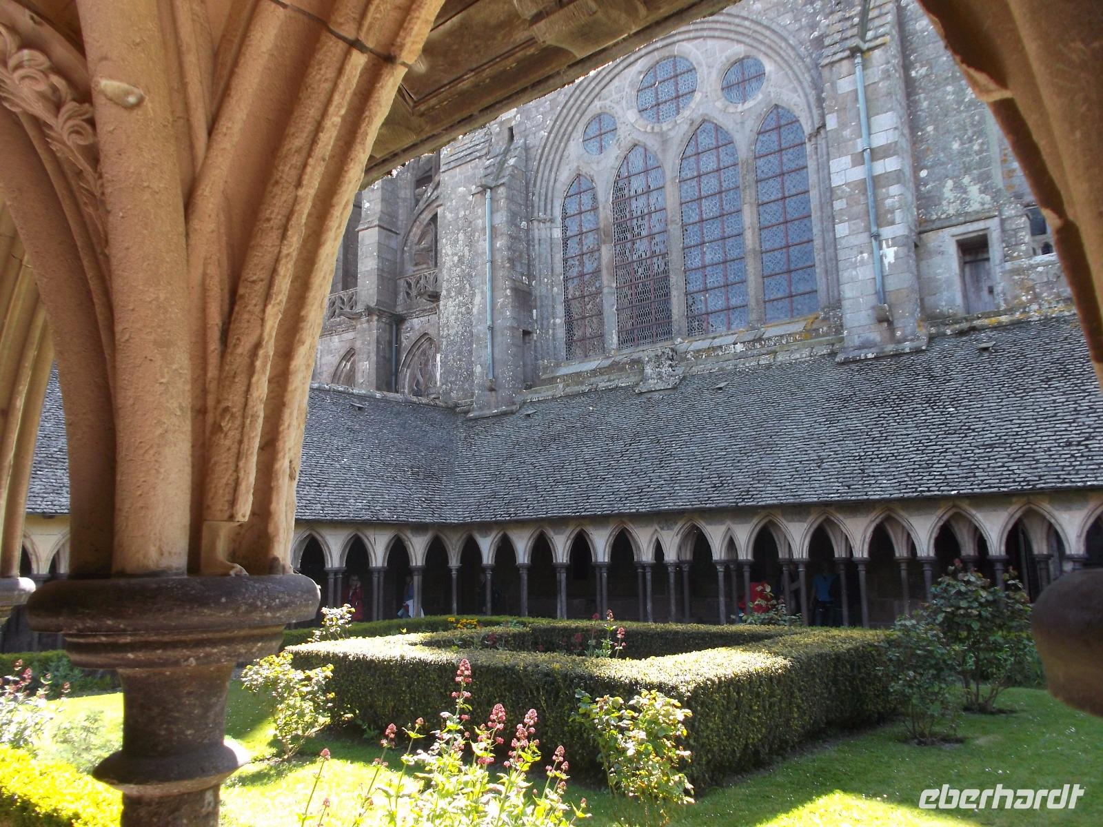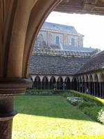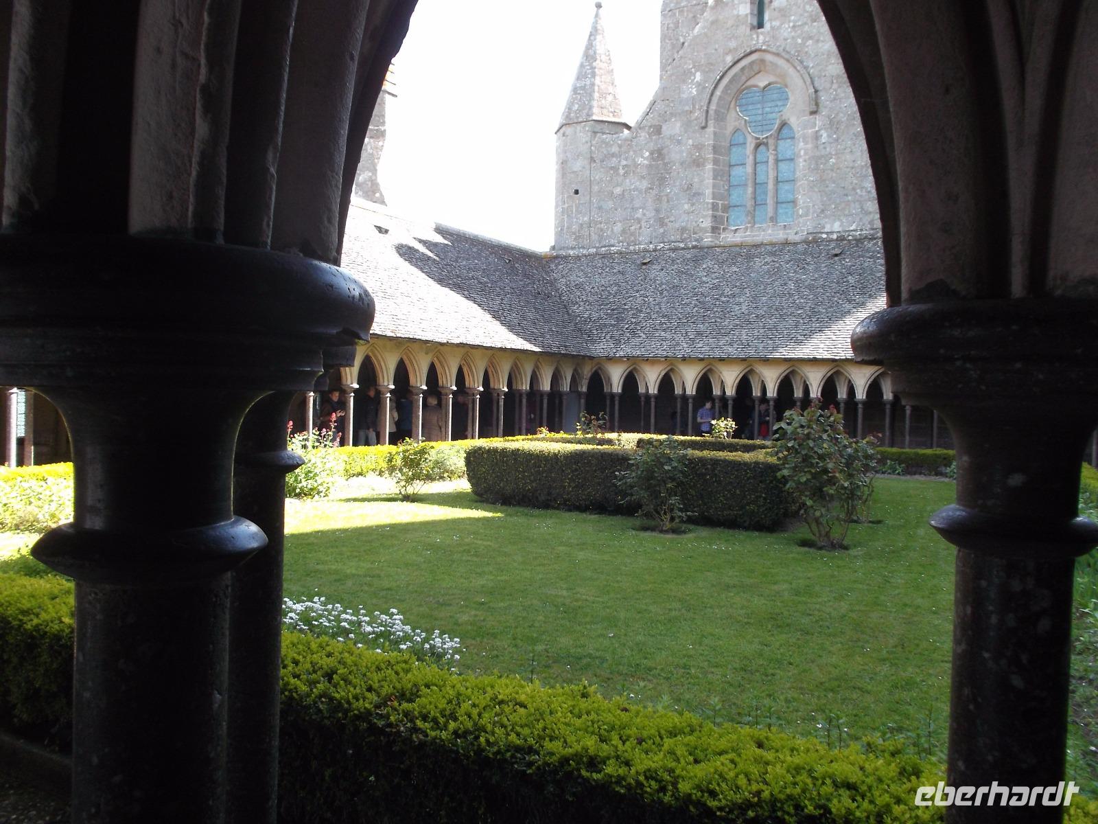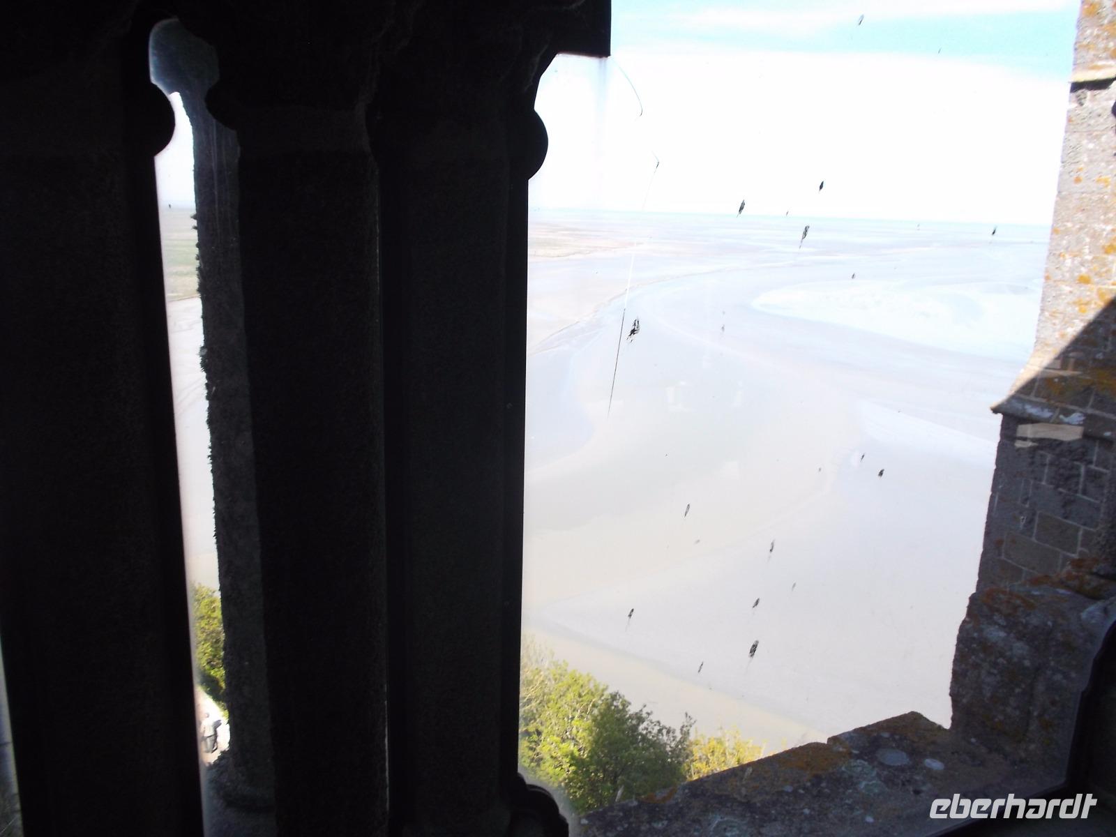 Umtost von den Strömungen der Gezeiten, von Wellen, Stürmen und dem Geschrei der Lachmöwen erstrahlt der Mont St.-Michel immer wieder anders durch das Spiel des Lichtes auf dem Wasser oder in den Strahlen der Sonne über Mittag oder in der Dämmerung. Atemberaubenden Architektur, die auf technische Meisterleistungen der Vergangenheit deutet, aber auch eine gewisse, durch die Einmaligkeit des Ortes und seiner Aufbauten hervorgerufene geheimnisvolle Aura oder Mystik lassen erahnen, warum er über Jahrhunderte ein bedeutender Wallfahrtsort war. Etwas entzaubert wurde der Ort allerdings durch die unglaublichen Menschenmassen, die sich heute zum Feiertag - es war Christi Himmelfahrt - hier drängten. Wir betraten durch den einzigen Eingang den wehrhaften Vorhof und erklommen sogleich die Wehrmauer. Zwar waren auch hier viele Menschen, aber deutlich weniger als auf dem Hauptweg. Ein schöner Blick über die Bucht von St. Michel, die gerade durch die Ebbe geleert wurde begleitete uns, als wir die Insel zur Hälfte umrundeten. Interessant war es durchaus, allerdings war der Aufstieg denn doch leicht ermüdend. Am Haupteingang konnte ich mich durch die Massen drängen. die Eintrittskarten lösen, Audioguides besorgen und dann mit der Gruppe zur eigentlichen Klosteranlage emporsteigen. Oben gab es einen herrlichen Ausblick von der Terrasse direkt neben der Kirche. Gleich zu Anfang gibt es als Besonderheit eines der „Wunder" vom Mont St.Michel: der „schwebende Kreuzgang" ruht auf filigranen Säulen und durch eine zur Bucht hin teilweise offene Seite (aus Sicherheitsgründen mit einer dicken Glasplatte verschlossen) scheint er verbindungslos in die Weite von Himmel und Meer überzugehen. Tatsächlich kann man sich mit etwas Phantasie in den Eindruck der mittelalterlichen Besucher hineinversetzen, von hier direkt in den Himmel überzugehen und gleichsam zu schweben... Der Abstieg durch die verschiedenen Räumlichkeiten des einstigen Klosters, mit einstigen Beherbergungsstätten für zahlreiche gekrönte Häupter, Kapellen, Speisesälen und Funktionsräumen des Klosters und des später hier eingerichteten Staatsgefängnisses wurde durch die Audioguides begleitet und erklärt.