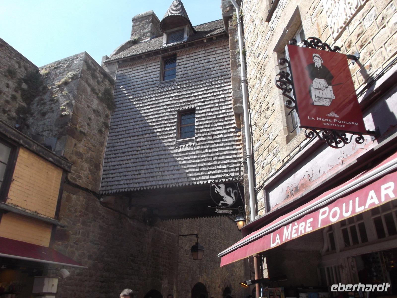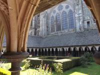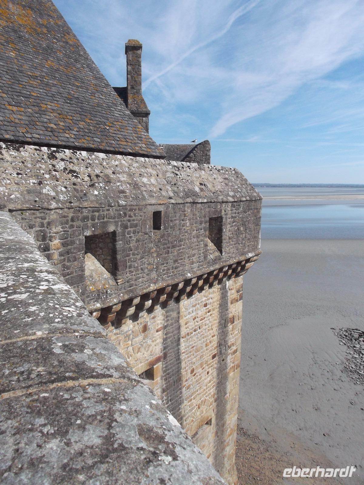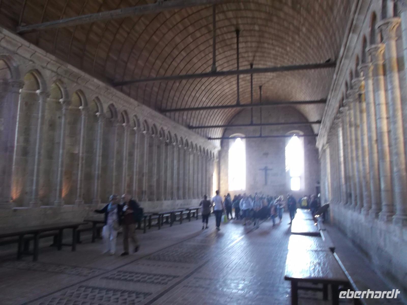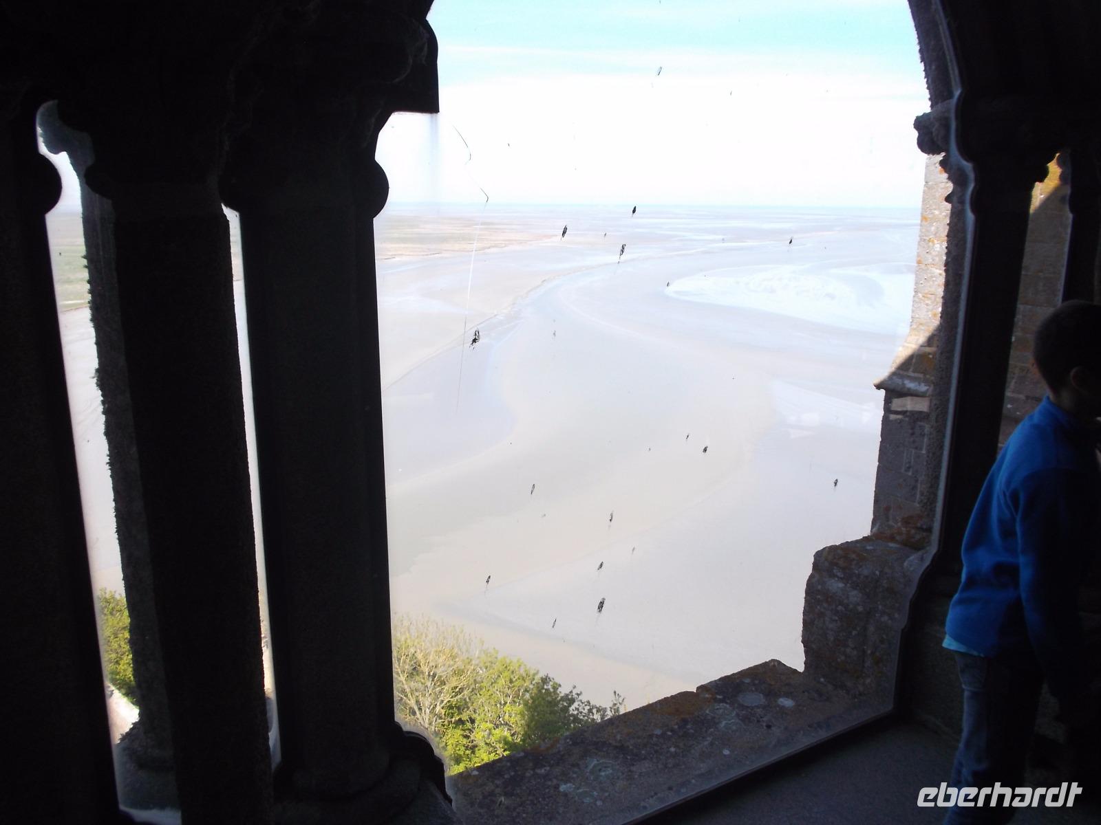 Umtost von den Strömungen der Gezeiten, von Wellen, Stürmen und dem Geschrei der Lachmöwen erstrahlt der Mont St.-Michel immer wieder anders durch das Spiel des Lichtes auf dem Wasser oder in den Strahlen der Sonne über Mittag oder in der Dämmerung. Atemberaubenden Architektur, die auf technische Meisterleistungen der Vergangenheit deutet, aber auch eine gewisse, durch die Einmaligkeit des Ortes und seiner Aufbauten hervorgerufene geheimnisvolle Aura oder Mystik lassen erahnen, warum er über Jahrhunderte ein bedeutender Wallfahrtsort war. Etwas entzaubert wurde der Ort allerdings durch die unglaublichen Menschenmassen, die sich heute zum Feiertag - es war Christi Himmelfahrt - hier drängten. Wir betraten durch den einzigen Eingang den wehrhaften Vorhof und erklommen sogleich die Wehrmauer. Zwar waren auch hier viele Menschen, aber deutlich weniger als auf dem Hauptweg. Ein schöner Blick über die Bucht von St. Michel, die gerade durch die Ebbe geleert wurde begleitete uns, als wir die Insel zur Hälfte umrundeten. Interessant war es durchaus, allerdings war der Aufstieg denn doch leicht ermüdend. Am Haupteingang konnte ich mich durch die Massen drängen. die Eintrittskarten lösen, Audioguides besorgen und dann mit der Gruppe zur eigentlichen Klosteranlage emporsteigen. Oben gab es einen herrlichen Ausblick von der Terrasse direkt neben der Kirche. Gleich zu Anfang gibt es als Besonderheit eines der „Wunder" vom Mont St.Michel: der „schwebende Kreuzgang" ruht auf filigranen Säulen und durch eine zur Bucht hin teilweise offene Seite (aus Sicherheitsgründen mit einer dicken Glasplatte verschlossen) scheint er verbindungslos in die Weite von Himmel und Meer überzugehen. Tatsächlich kann man sich mit etwas Phantasie in den Eindruck der mittelalterlichen Besucher hineinversetzen, von hier direkt in den Himmel überzugehen und gleichsam zu schweben... Der Abstieg durch die verschiedenen Räumlichkeiten des einstigen Klosters, mit einstigen Beherbergungsstätten für zahlreiche gekrönte Häupter, Kapellen, Speisesälen und Funktionsräumen des Klosters und des später hier eingerichteten Staatsgefängnisses wurde durch die Audioguides begleitet und erklärt.