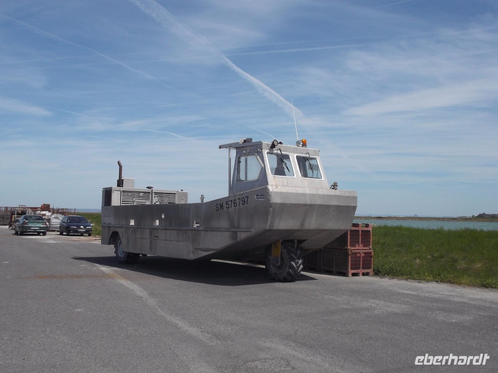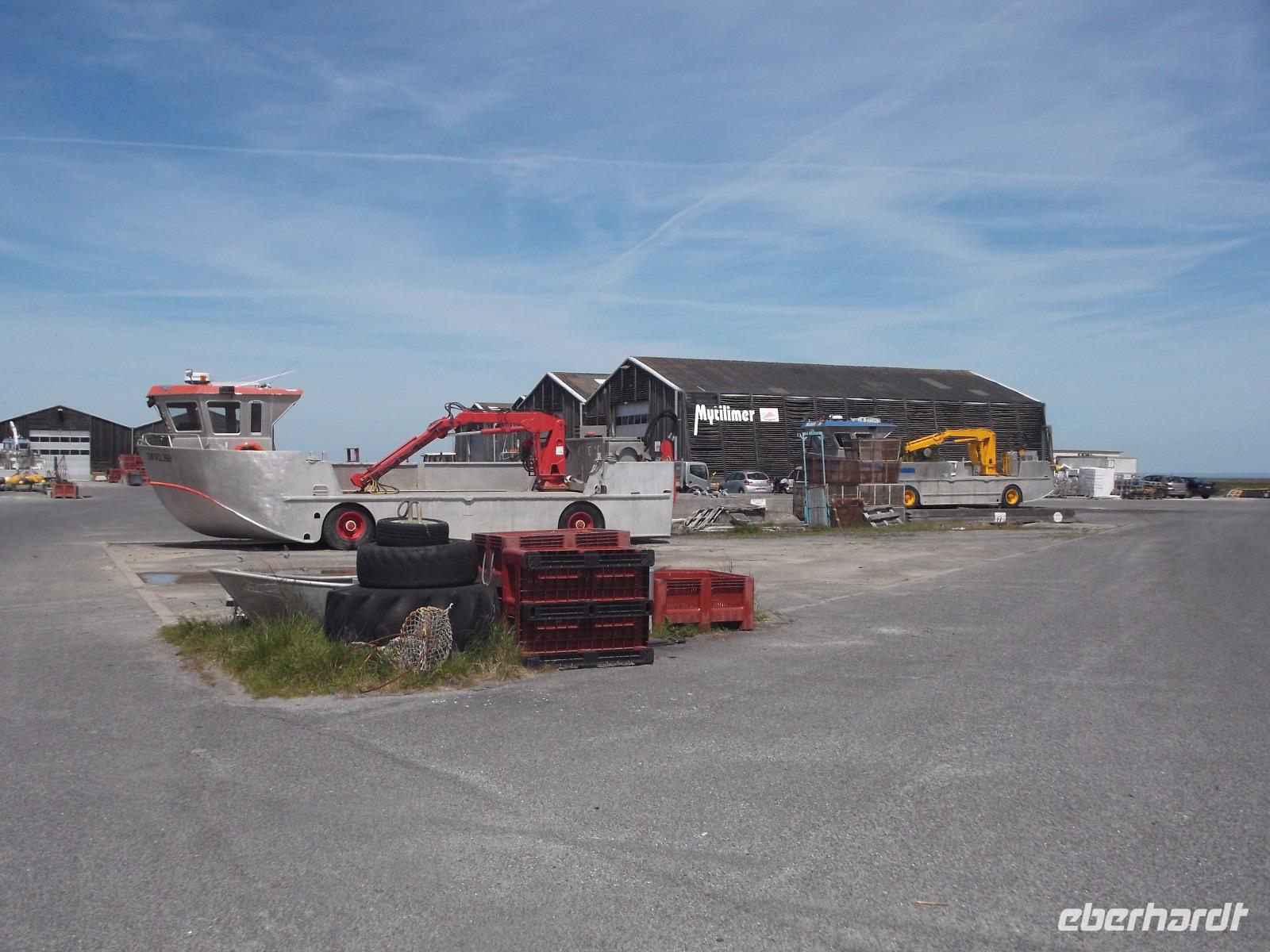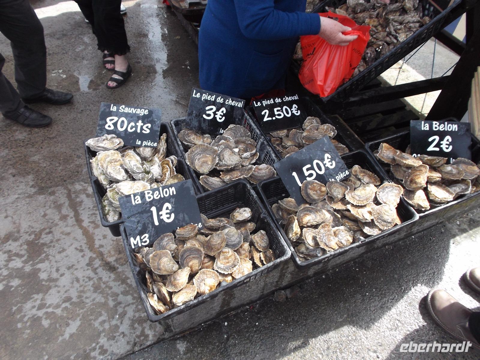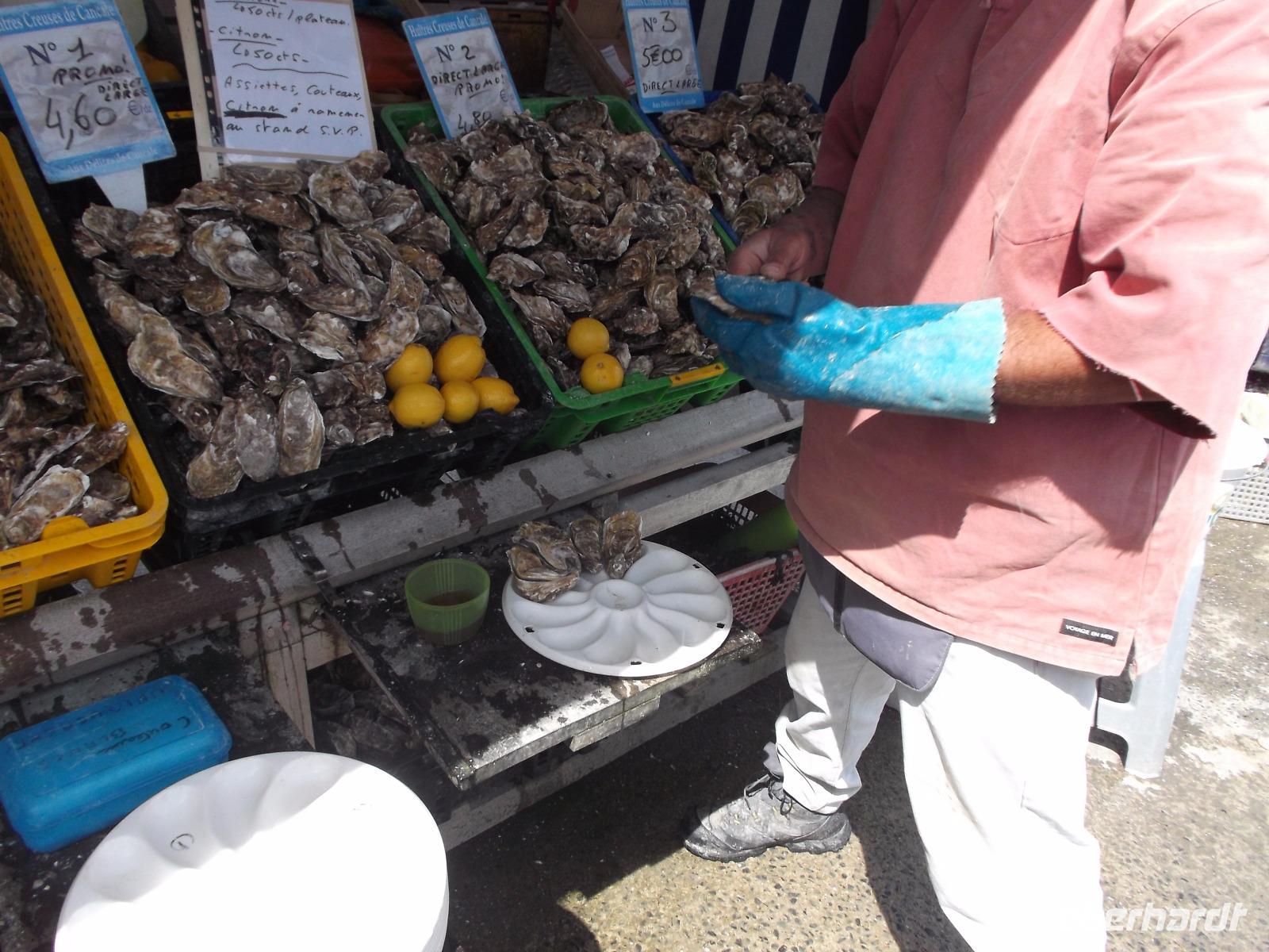 Nach längerer Freizeit trafen wir uns wieder am Bus - was umgekehrt verlief wie beim Ankommen: Der Berg ist nur per Shuttlebus oder zu Fuß zu erreichen, der Parkplatz für Busse und PKW liegt mehrere Kilometer entfernt. Durch die Polder, dem Meer abgewonnenes und jetzt landwirtschaftlich genutztes Land, ging es zur Küstenstraße. In einem der Orte, die für Austernzucht, Krabben- und Hummerfischerei bekannt sind konnten wir im Wirtschaftshafen einige „Austernboote" fotografieren. Wir erfuhren, dass die Austern, die weltweit als teure Delikatessen gelten, nur über größere Entfernungen in Feinschmeckerlokale verschickt werden können, indem man sie vor der „Ernte" an einen veränderten Ebbe-und-Flut-Rhythmus gewöhnt. Da nur geschlossene Austern genießbar sind, bringt man sie in einer „Austernschule" dazu, sich länger als in der Natur üblich geschlossen zu halten. Unmittelbar darauf konnten wir uns in Cancale, einem der berühmtesten Austernorte weltweit, vom Geschmack der Meerestiere überzeugen. Wir parkten zentral im Ort und liefen dann zum kleinen Markt am Hafenende, wo frische Austern verkauft werden. Hier kaufte ich ein paar Dutzend der so begehrten Meeresfrüchte frisch vom Händler - nirgendwo wird man sie so authentisch und köstlich bekommen wie hier. Ein Blick rundum zeigte uns die bei Ebbe gut sichtbaren Austernbänke, zwischen denen sich zahlreiche Traktoren mit Austernwagen bewegten, die gerade die großen Felsenmuscheln ernteten. Nachdem ich kurz das Schlürfen, Kauen und Schlucken einer lebenden Auster - nur so ist es stilecht (aber nicht jedermanns Sache.) vorgeführt hatte, konnten sich alle Gäste, die wollten, an den frischen Austern gütlich tun. Tatsächlich haben alle mitgemacht, ich musste sogar noch Austern nachbestellen! Nach der Austernschlürferei fuhren wir zurück nach St. Malo.