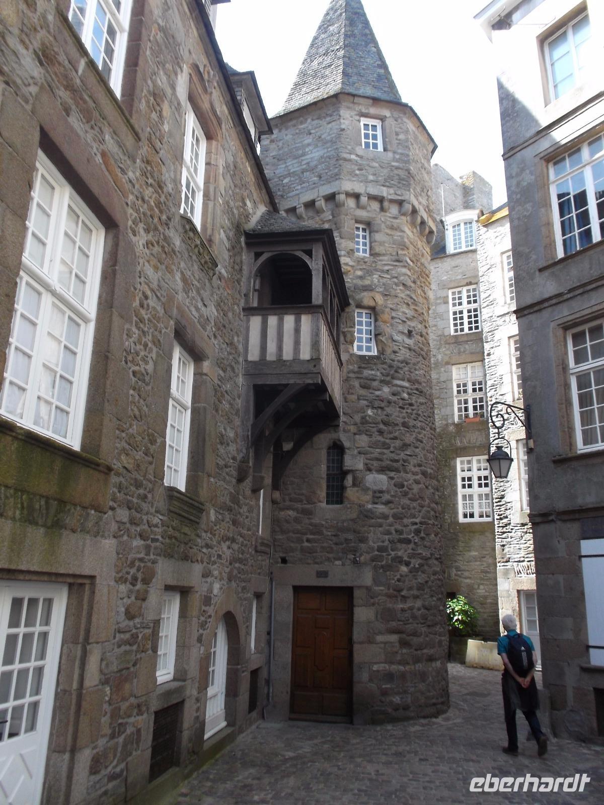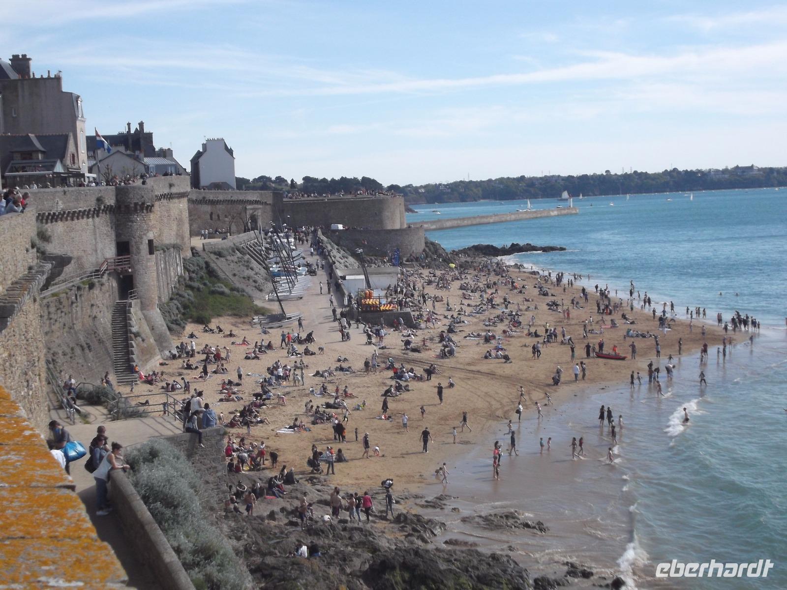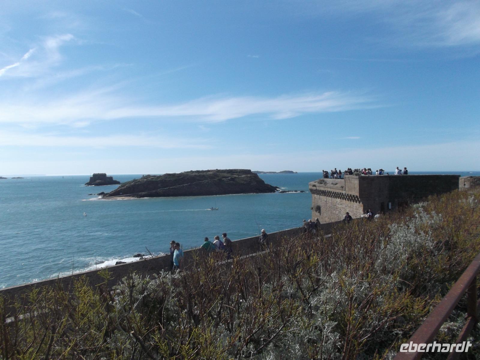 An der Burg des einstigen „Seeräubernestes", das zeitweilig ein selbständiger Stadtstaat inmitten der Bretagne war, stiegen wir aus. Hier ist das Tor zur Altstadt und auch hier drängten sich zahllose Besucher. Bekannt waren der Ort und seine Altstadt „Intra muros" für wagemutige Seehelden und als Schulort für Kaperkapitäne. Die Stadtbefestigung und Festungen auf den vorgelagerten Inseln stammen aus dem Mittelalter, wurden aber später vom königlichen französischen Festungsbaumeister Vauban verändert. Wir spazierten vom „Donjon" - dem Hauptturm der einstigen Burg von St.Malo, die heute Rathaus und Museum ist - vorbei am Haus der Herzogin Anna von Bretagne bis zu den Wehrgängen, die uns schöne Ausblicke aufs Meer, aber auch auf die Stadt boten.