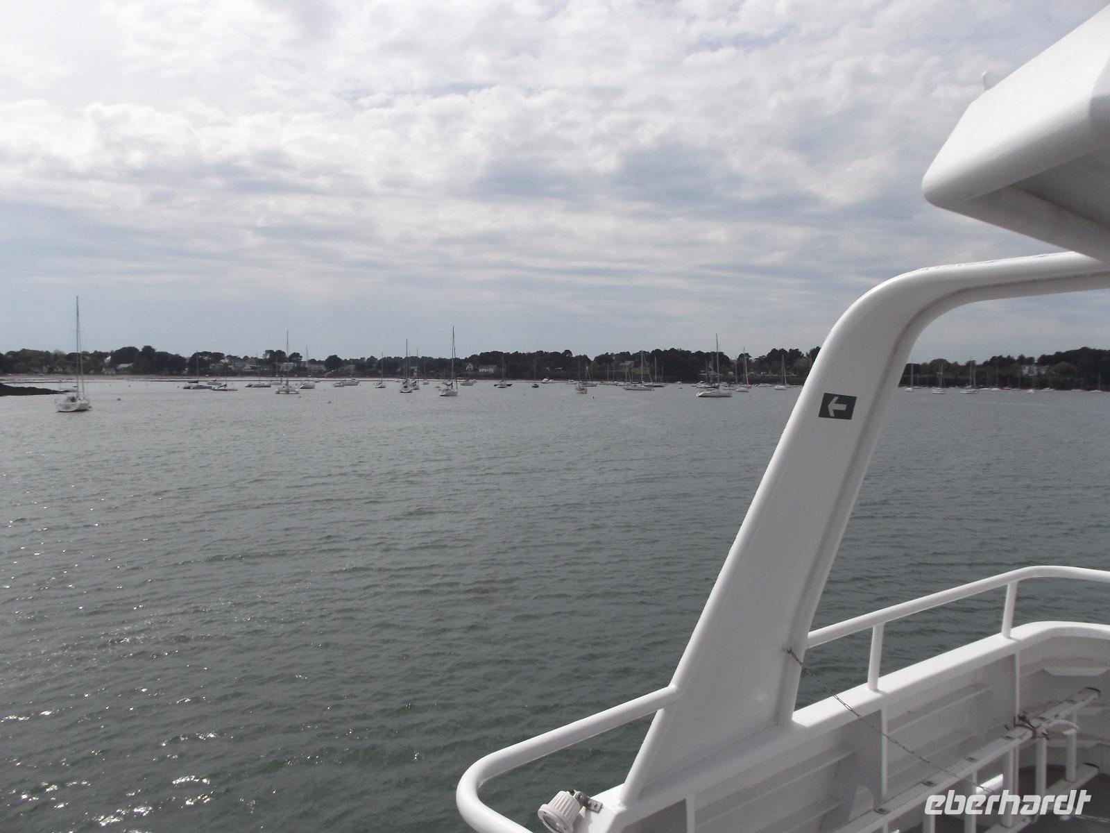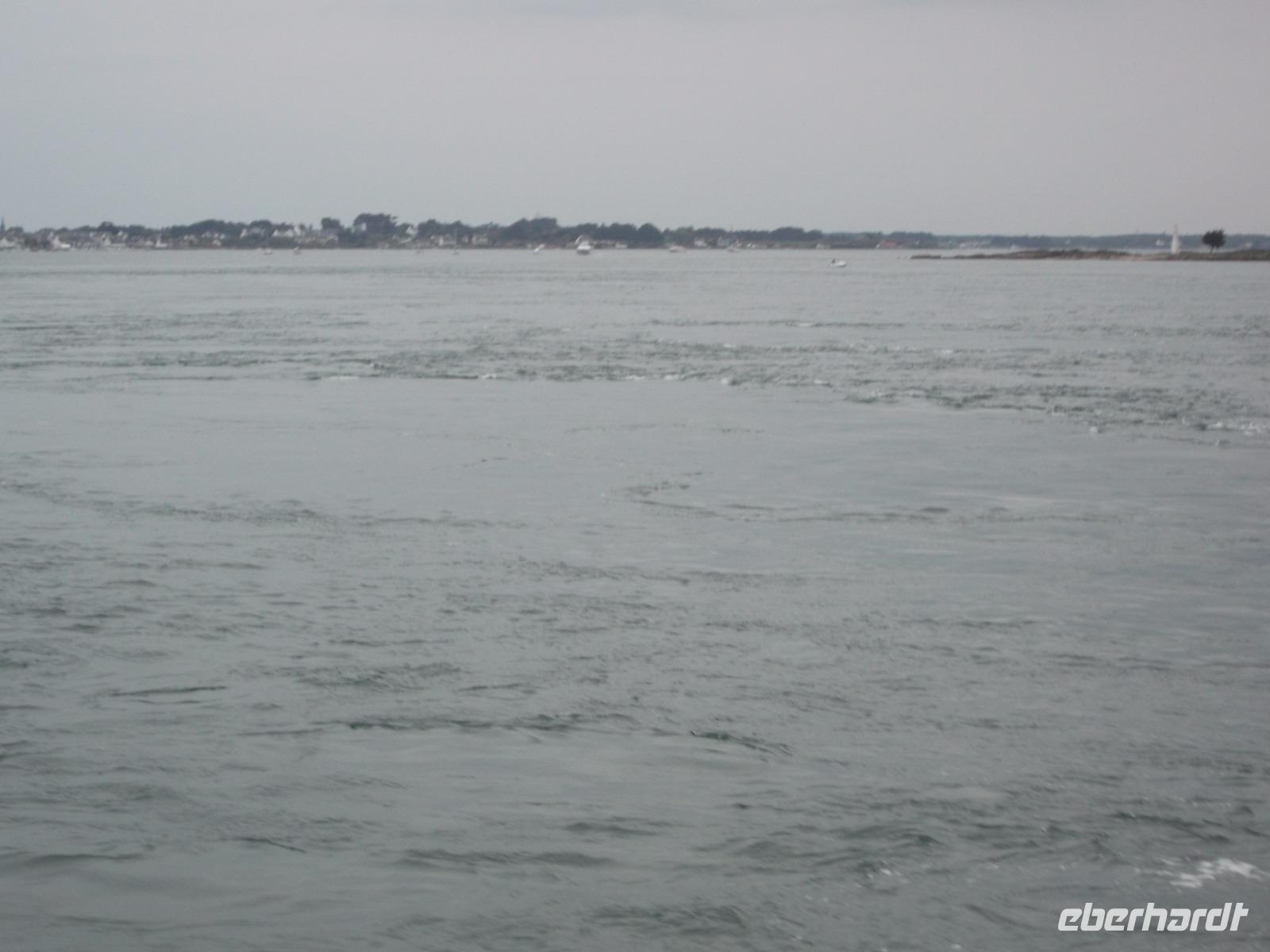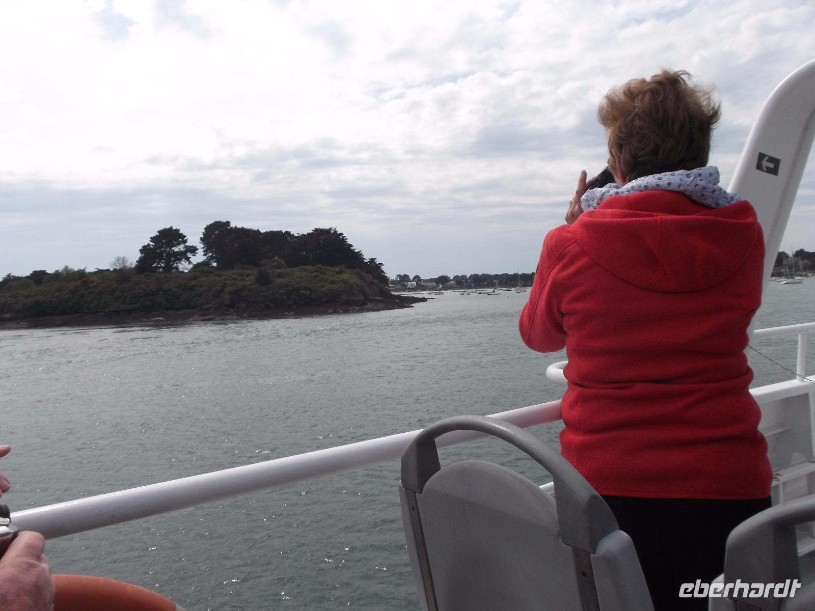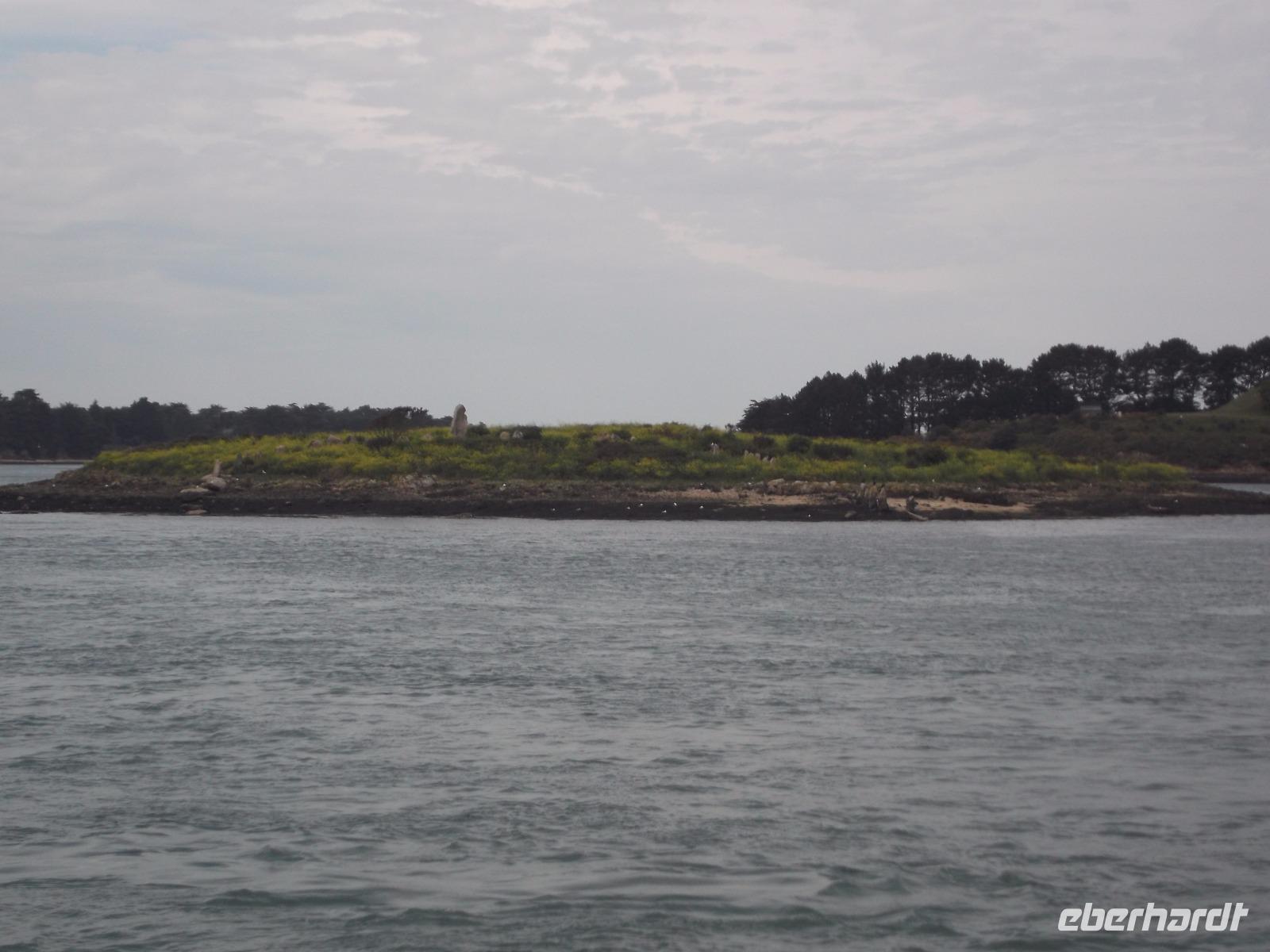 Unser weiteres Tagesprogramm wurde durch eine ausgiebige Bootsfahrt über den Golf von Morbihan bestimmt. Deren Start war im Hafen von Vannes und so fuhren wuir in die alte Stadt, in der früher das Parlament der Bretagne tagte. Im Hafen von Vannes holte ich die Tickets für die Bootsfahrt und schon wenige Minuten später befanden wir uns an Bord und schipperten über die Wellen. Golf von Morbihan lautet der Name der größten Meeresbucht der Bretagne. Das bedeutet soviel wie „kleines Meer" und bezeichnet das fast 300 km² große Binnenmeer, komplett bis auf einen schmalen Meereszugang von Land umschlossen und, mit Dutzenden Inseln und Inselchen übersät. Der knapp einen Kilometer breite Atlantikkanal zum Meer aber sorgt dafür, dass der „Golf" immer noch komplett Ebbe und Flut ausgesetzt ist, die allerdings bis zu einer Stunde zeitverzögert auf- und auslaufen.
