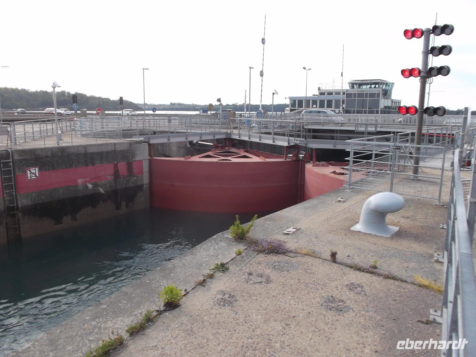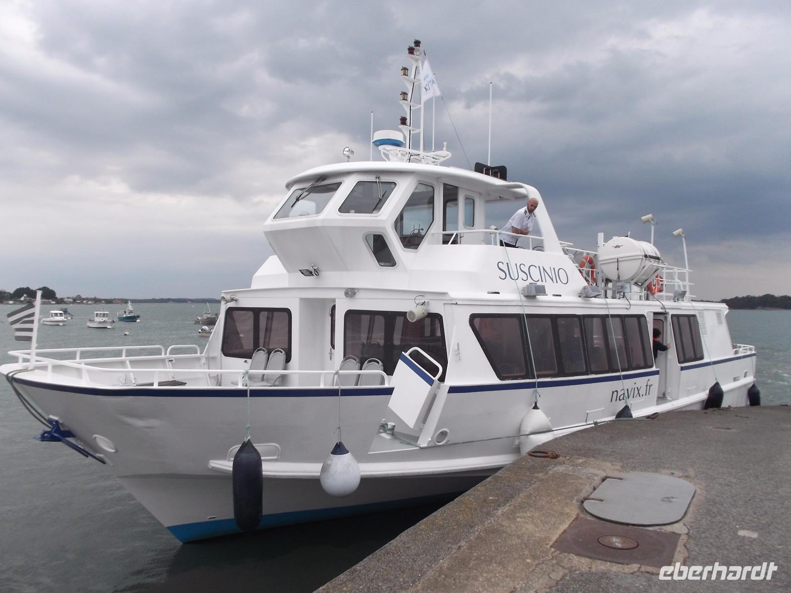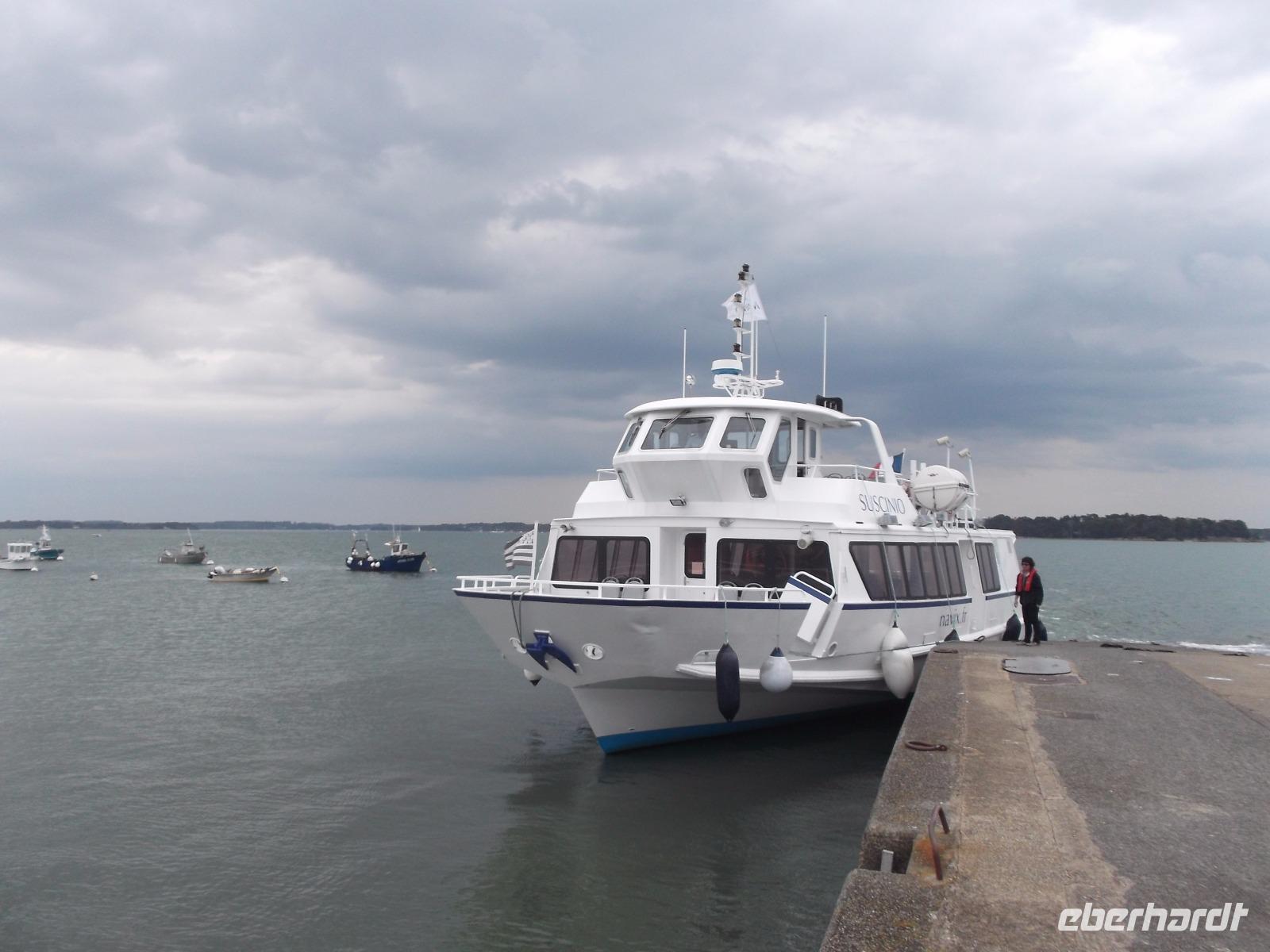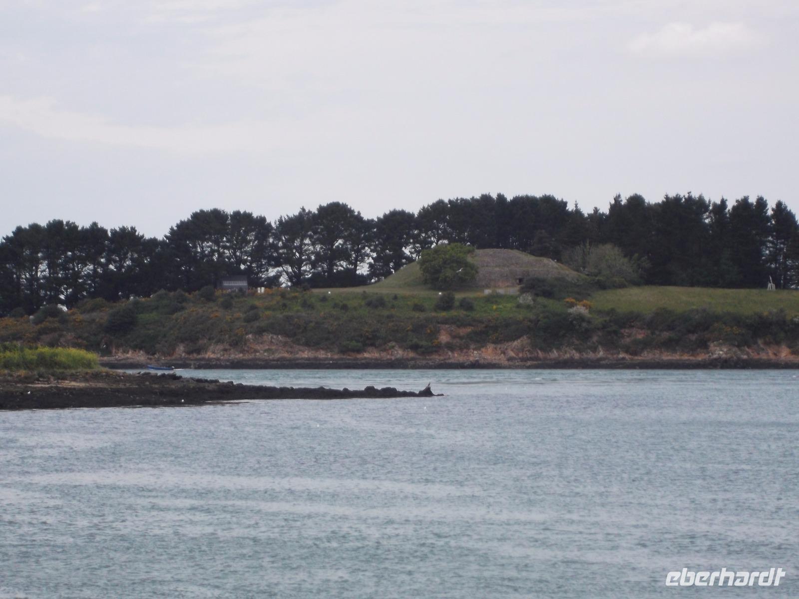 Unser weiteres Tagesprogramm wurde durch eine ausgiebige Bootsfahrt über den Golf von Morbihan bestimmt. Deren Start war im Hafen von Vannes und so fuhren wuir in die alte Stadt, in der früher das Parlament der Bretagne tagte. Im Hafen von Vannes holte ich die Tickets für die Bootsfahrt und schon wenige Minuten später befanden wir uns an Bord und schipperten über die Wellen. Golf von Morbihan lautet der Name der größten Meeresbucht der Bretagne. Das bedeutet soviel wie „kleines Meer" und bezeichnet das fast 300 km² große Binnenmeer, komplett bis auf einen schmalen Meereszugang von Land umschlossen und, mit Dutzenden Inseln und Inselchen übersät. Der knapp einen Kilometer breite Atlantikkanal zum Meer aber sorgt dafür, dass der „Golf" immer noch komplett Ebbe und Flut ausgesetzt ist, die allerdings bis zu einer Stunde zeitverzögert auf- und auslaufen.