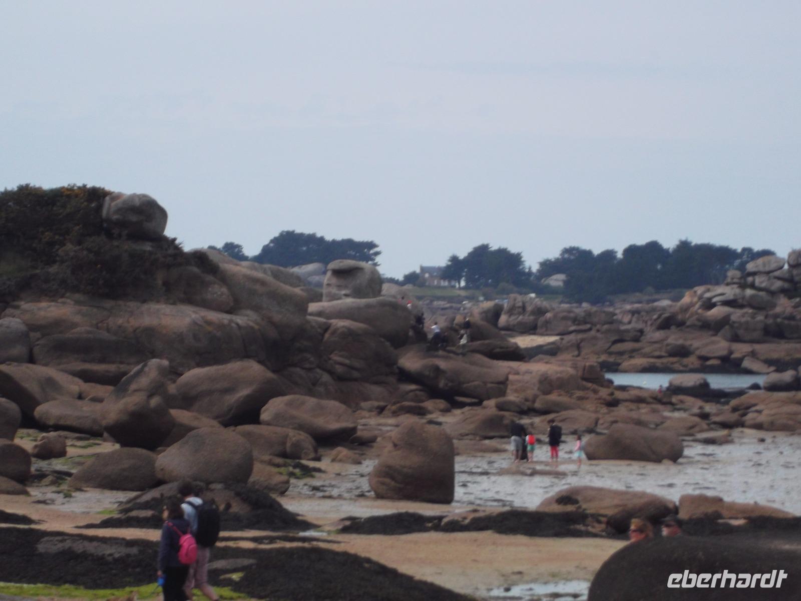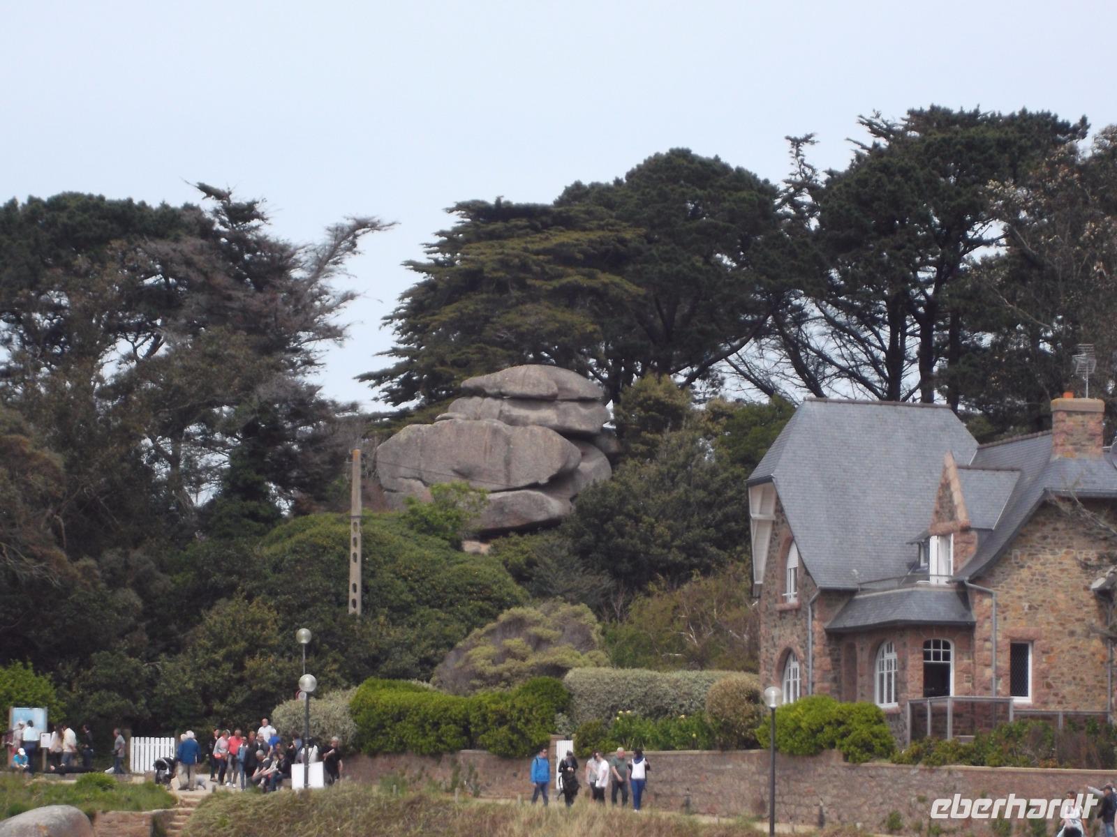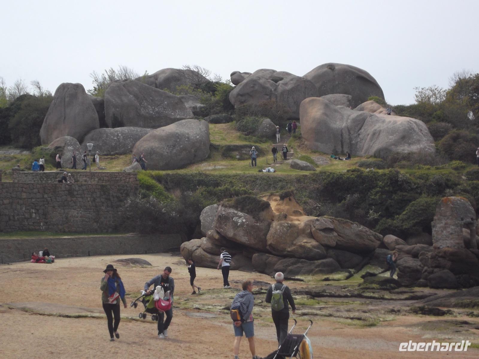 Die landschaftliche Schönheit der Bretagne würde heute den Hauptinhalt des Reiseprogramms bilden. Gleich nach dem Frühstück gab es einen Fotostopp auf dem Weg zum Kap Frehel, nachdem wir die Mündung des Flusses Rance überquert hatten. Das Gewässer trennt die Städte St. Malo und Dinard und in seinem Mündungstrichter sieht man die Höhenunterschiede der Gezeiten besonders gut. An dieser Stelle nutzt man seit den 60er Jahren des 20. Jh. die gewaltige Energie von Ebbe und Flut zur Stromerzeugung. Vom Gezeitenkraftwerk selbst sieht man nur wenig, lediglich die Schleusenanlagen und einige der Wassereinlässe für die insgesamt 24 Turbinen kann man sehen. Sie sind in der Staumauer verborgen untergebracht und nutzen die Kräfte sowohl des herausfließenden wie auch des hineindrückenden Wassers zur Energieerzeugung nutzen. Die Weiterfahrt führte uns zum Kap Frehel. Über 70 m über die Meeresfluten ragen die hohen Klippen und Felsenflanken des Kaps auf und zeigen als grandioses Naturschauspiel, wie die Wellen des türkisfarbenen Wassers die Felsküste, bestehend aus rotem, schwarzem und grauem Gestein, umtosen. Wer wollte, konnte auf einem kleinen Rundwanderweg um den 1950 erbauten steinernen Leuchtturm die Naturschönheiten dieses Ortes entdecken. Noch auf große Entfernung soll vom Meer aus das Leuchtfeuer bei schönem Wetter zu sehen sein. Nach ausgiebigem Stopp an den mit Heidekraut und Ginster bewachsenen und von Möwen und Kormoranen bevölkerten Klippen ging es schon weiter zum nächsten landschaftlichen Höhepunkt. Vor ungefähr 300 Millionen Jahren entstand die rosa Granitküste. Die Farbe, die die kurze „Cote de granit rosé" besonders anziehend macht, entstand durch bestiummte Mineralien im Gestein. Die folgenden Jahrmillionen mit ihren Veränderungen des Wasserspiegels und den verschiedensten Formen der Erosion schließlich sorgten für die Entstehung der bizarren Felsformationen, für die diese rosa Granitküste neben ihrer Färbung so bekannt und als Touristenattraktion beliebt ist. Schon beobachten kann man sie beim Rundweg und am Anfang des berühmten „Zöllnerpfades", der im Städtchen Ploumanach seinen Anfang nimmt. Ob es nur ein Fotostopp am kleinen Hafen mit seinen bizarren Formationen oder gleich eine längere Wanderung zu den Felsenkuppen sein sollte - wir hatten hier Zeit, um die Schönheiten der Küste, des Ortes und des Zöllnerpfades aufzunehmen.