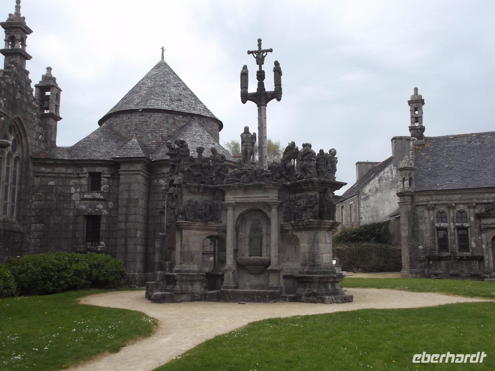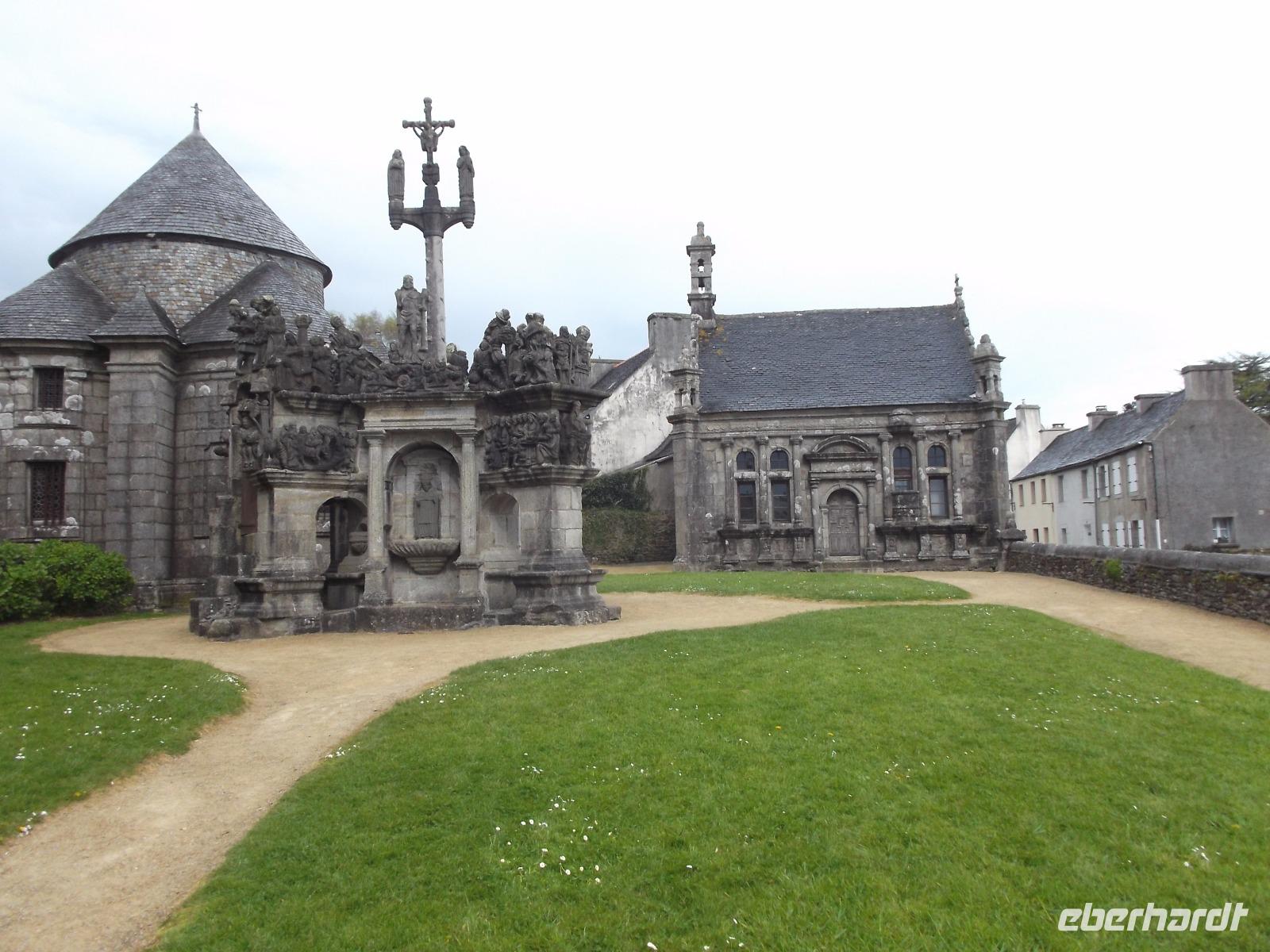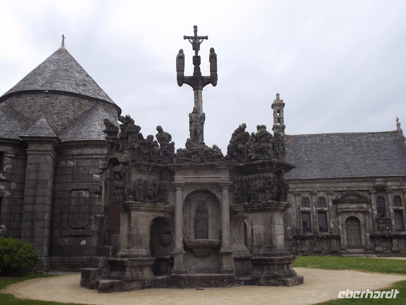 Der „Bauernaltar" von Guimiliau gilt als einer der schönsten und am reichsten verzierten „calvaire" - jene steinerne Podeste mit üppigem Figurenschmuck, die in der Mitte zumeist eine Kreuzigungsgruppe aufweise. Die Bauernkünstler arbeiteten hier aus dem harten Granit über zweihundert Figuren aus der biblischen Geschichte als Skulpturen und Reliefs heraus. Kalvarienberge sind in der Bretagne sehr zahlreich und man findet sie in unterschiedlichsten Erhaltungszuständen. Sie stammen fast alle aus dem 16. oder 17.Jahrhundert, fast alle wurden nicht von weithin bekannten Bildhauern, sondern von Bauern aus der Umgebung gestaltet. Sie sind so etwas wie Lehrbücher oder „Bibel-Illustrationen": da viele Gottesdienste im Freien stattfanden, haben die Prediger während ihrer Ausführungen neben dem Kalvarienberg gestanden und das Gesagte durch Hinweise mit der Hand oder dem Zeigestock auf die dargestellten Figuren und Ereignisse unterstrichen. Dadurch wurden die Predigten und Bibelerklärungen volkstümlich, leicht verständlich und blieben gut im Gedächtnis.