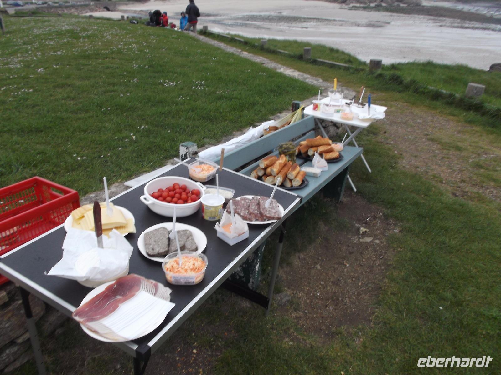 Während Chauffeur Frank die Gäste am vereinbarten Treffpunkt abholte, konnte ich an der Bucht von Primelin an einem hübschen Platz, der das Meer überblickt, ein zünftiges Picknick vorbereiten - mit Wurst- und Käsespezialitäten der Region und ganz frischem Baguette. Dazu sollte es Rotwein geben - als dann Frank mit den Gästen eintraf, war ich gerade fertig!