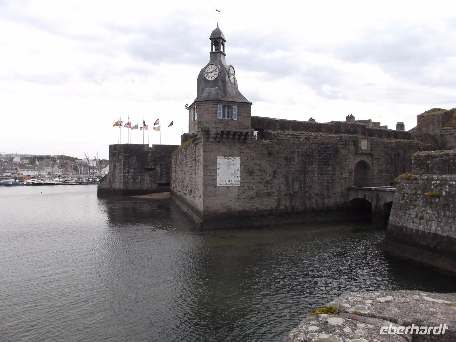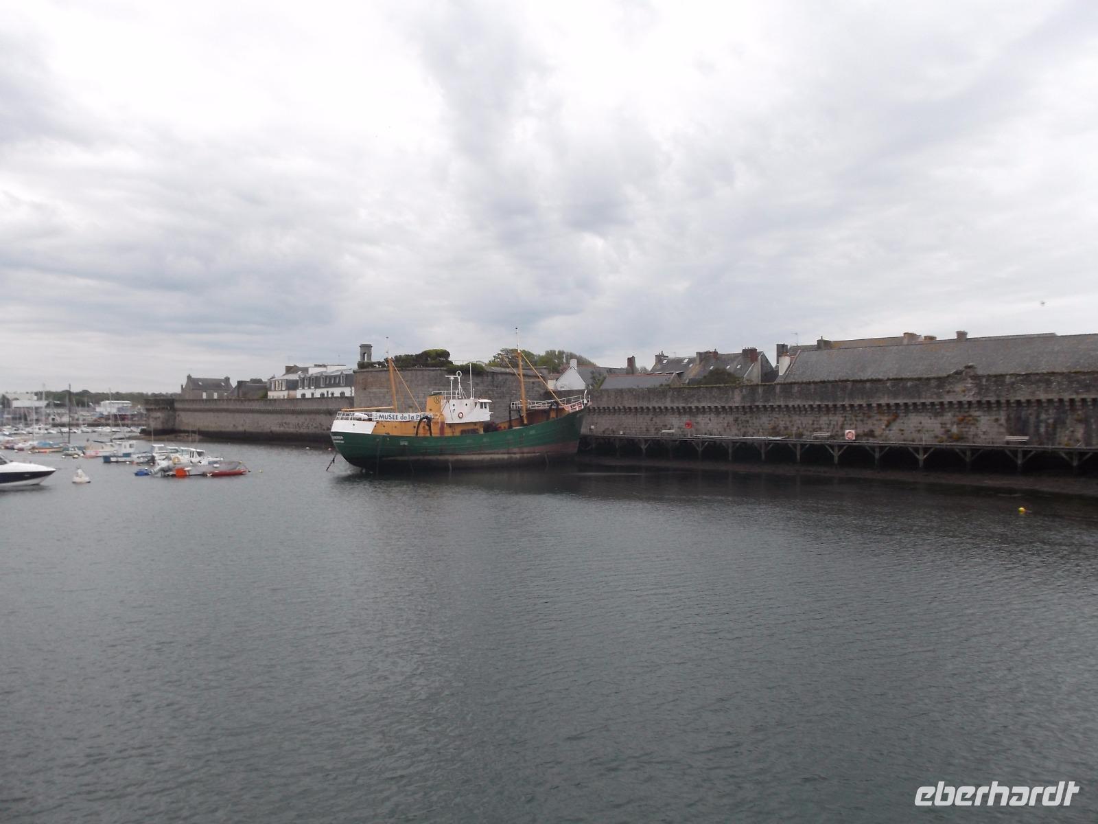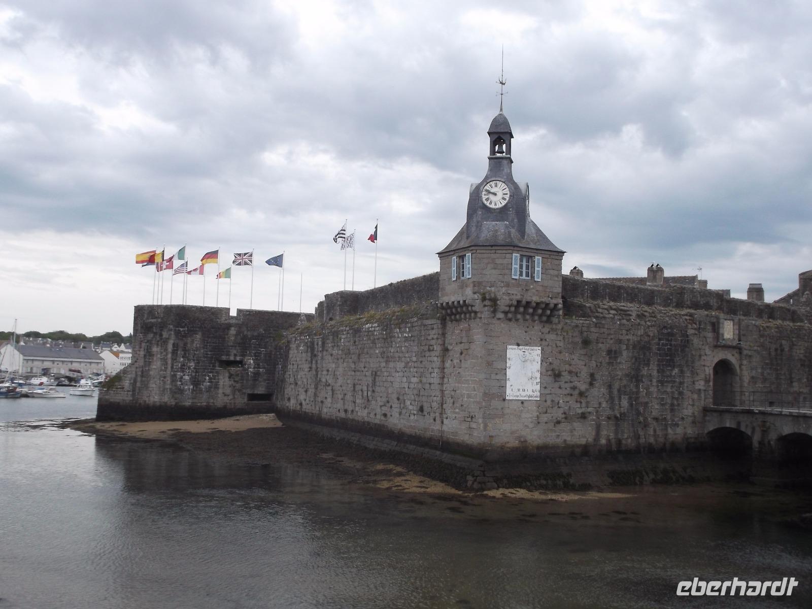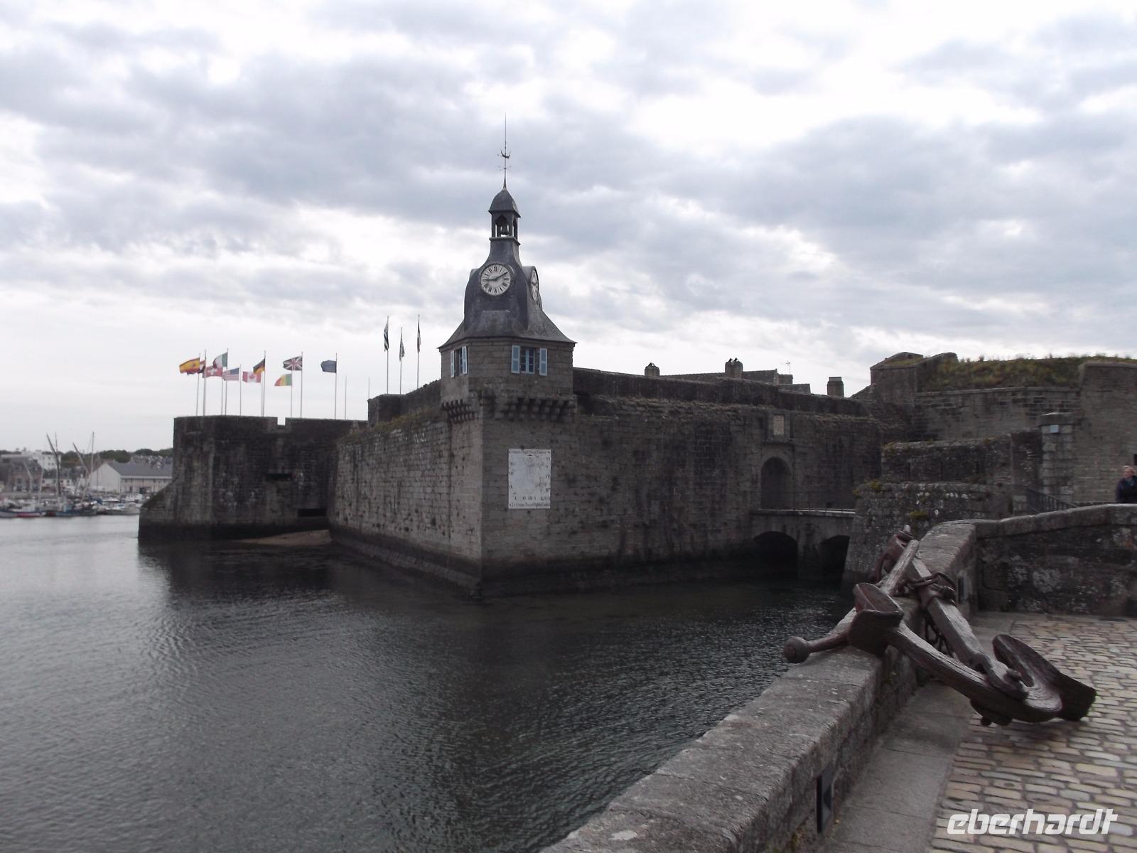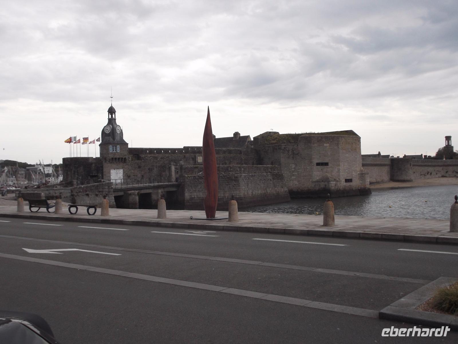Den ersten Aufenthalt hatten wir in der Fischereistadt Concarneau. Deren Altstadt liegt auf einer leicht zu verteidigenden Gezeiteninsel und sieht fast aus wie ein steinernes Schiff. „La Ville close", die geschlossene Stadt wird sie genannt und ihr heutiges Bild prägte kein Geringerer als Sebastien de Prestre Le Vauban, der Festungsbaumeister Ludwigs XIV. Die Vauban-Festungswerke umschließen komplett die kleine, etwa 350 lange und 150 m breite Insel neben dem Fischereihafen. Eine fast wie ein Bug geformte Sperrfestung, mit ungewöhnlichem Uhrturm und ausladenden Kanonenbastionen sperrt den zusätzlich durch eine Vorburg und zwei Zugbrücken gesicherten einzigen Zugang zur Stadt. Nur von hier gelangt man in Vaubans Garnisons- und Artilleriestadt, die von nur zwei Hauptstraßen, durch wenige Quergassen verbunden, durchzogen wird - eine typische Seefestungsstadt des 17. Jahrhunderts. Wir konnten in der Freizeit etwas herumbummeln, bevor wir zur Autobahn zurückkehrten und zunächst unterwegs waren zum „Gebiet der großen Steine".