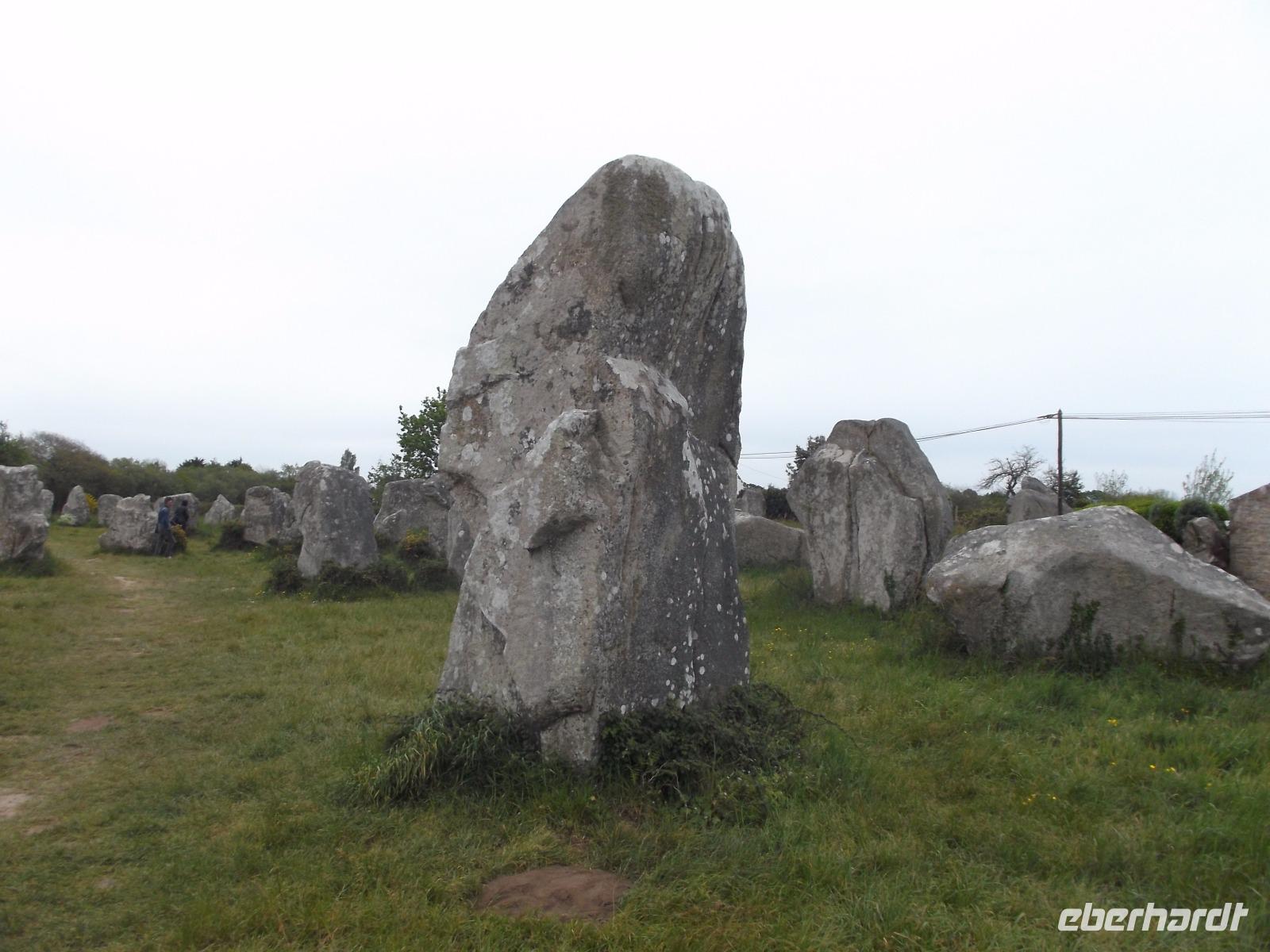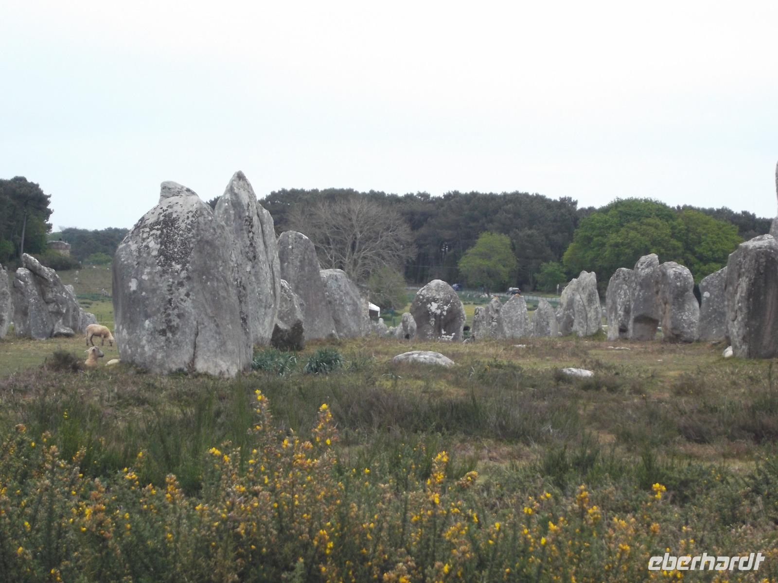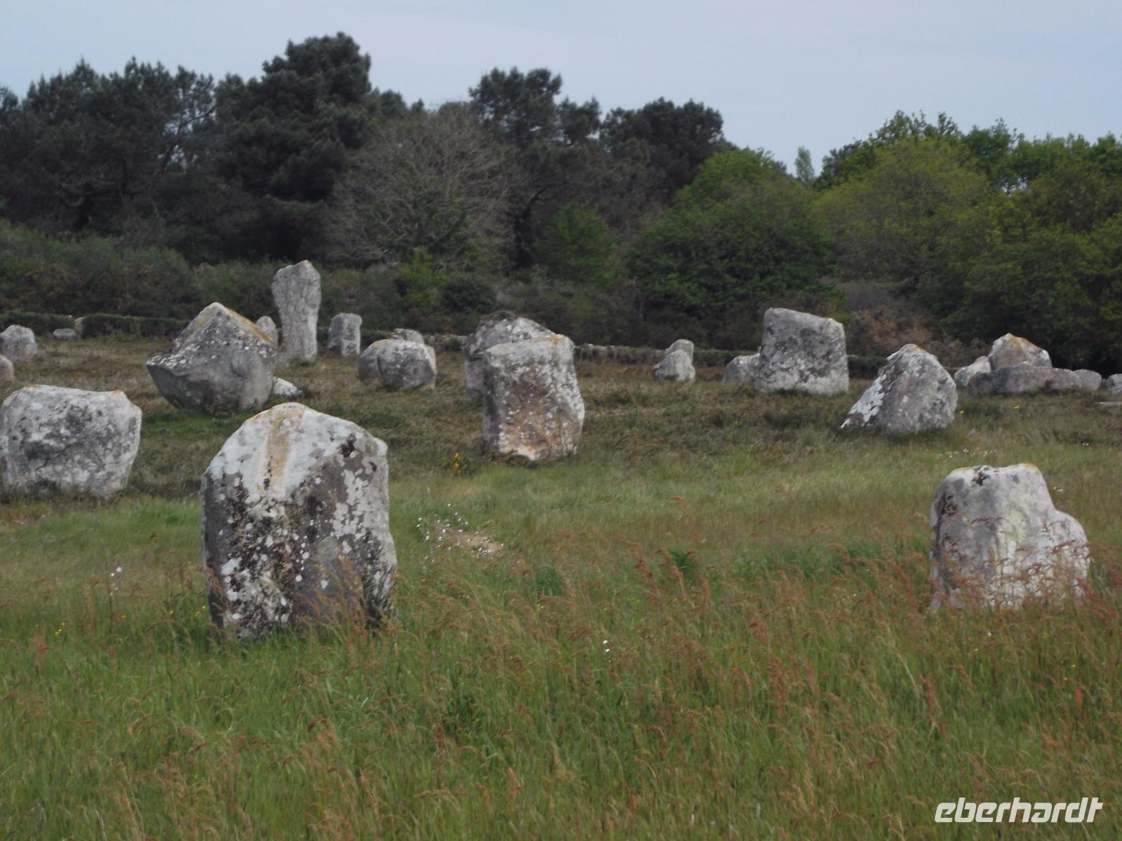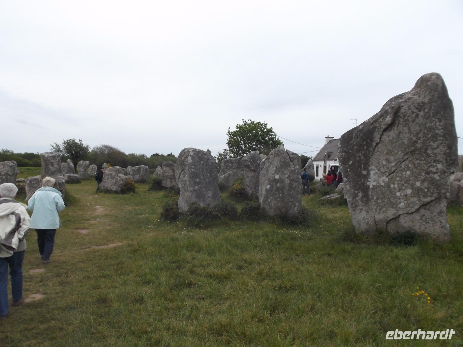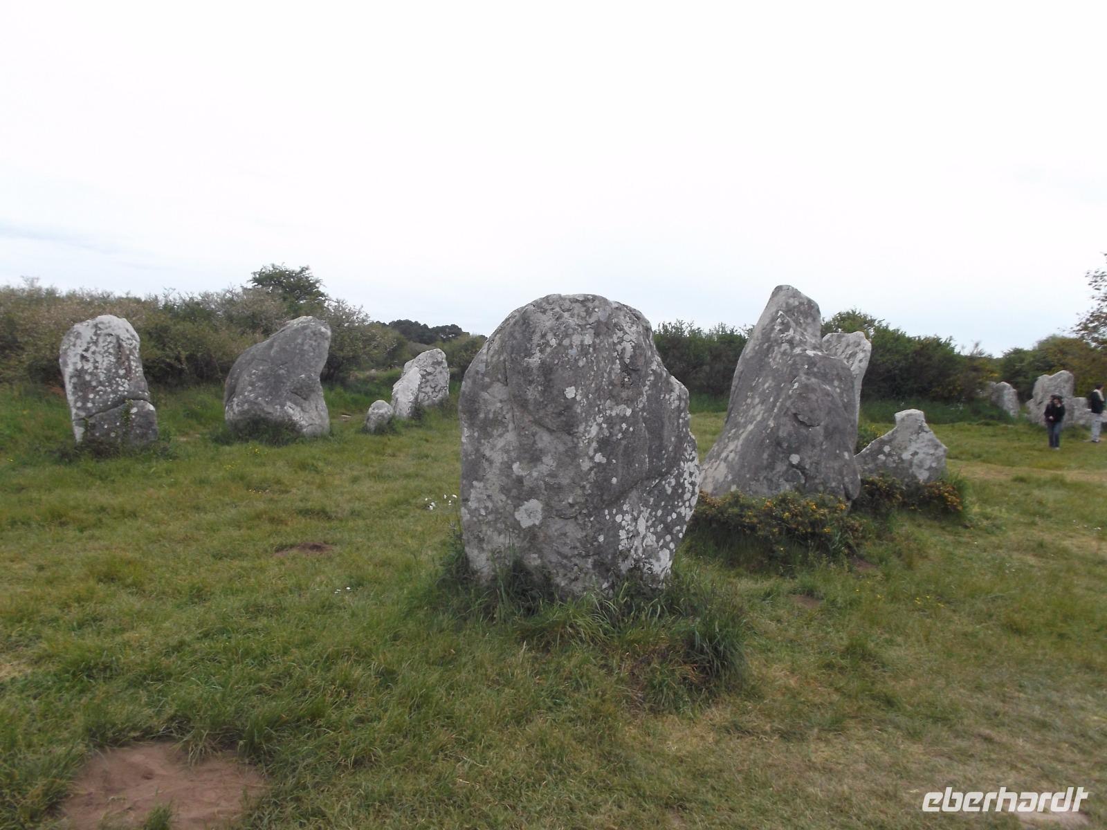 Zeugnisse und Überreste der Megalithkultur sind in vielen Ländern Europas zu finden, an einigen Punkten häufen sich ihre steinernen Zeugen, wie in Norddeutschland die hier „Hünengräber" genannten Dolmen oder in Großbritannien die Steinkreise. Auf engstem Raum konzentriert sich hier in der südlichen Bretagne neben den stehendenden Steinen, den Menhiren, eine ganz besondere Art von Großsteinmonumenten: die Alignements. Das sind parallele Setzungen riesiger Steine, oft kilometerlang in mehreren Reihen nebeneinander. Den ersten Kontakt mit diesen Alleen aus tonnenschweren Felsbrocken, die immer noch etwas Mystisches ausstrahlen, hatten wir bei einem Fotostopp an den Alignements von Kerzhero, wo man noch direkt zwischen den stehenden Kolossen herumlaufen kann. Später in Carnac, wo die bekanntesten dieser Steinalleen liegen, sind sie leider abgeschirmt und eingezäunt. Doch gleich nach unserem Eintreffen in Carnac, wo es vier weltweit bekannte Alignements gibt, hatten wir die Möglichkeit, auch die größten von ihnen - Le Menec und Kermario mit jeweils weit über 1000 stehenden Steinen - aus der Nähe zu fotografieren. Uns blieb genug Zeit, ein wenig von außen an den eingezäunten Reihen entlang zu bummeln und bei Kermario auch den fast unzerstörten Dolmen, ein gewaltiges Großsteingrab aus tonnenschweren Findlingsblöcken zu bestaunen.
