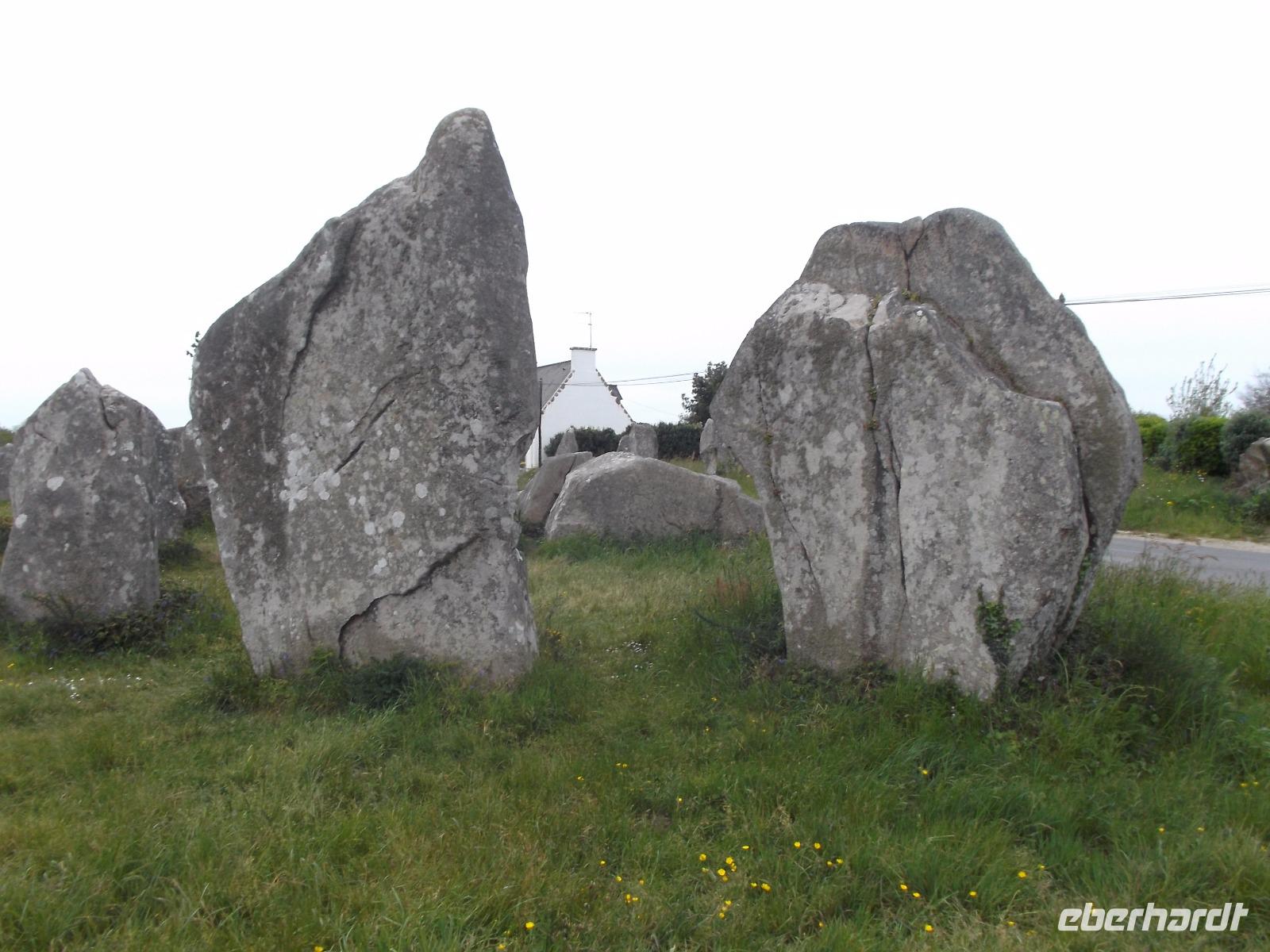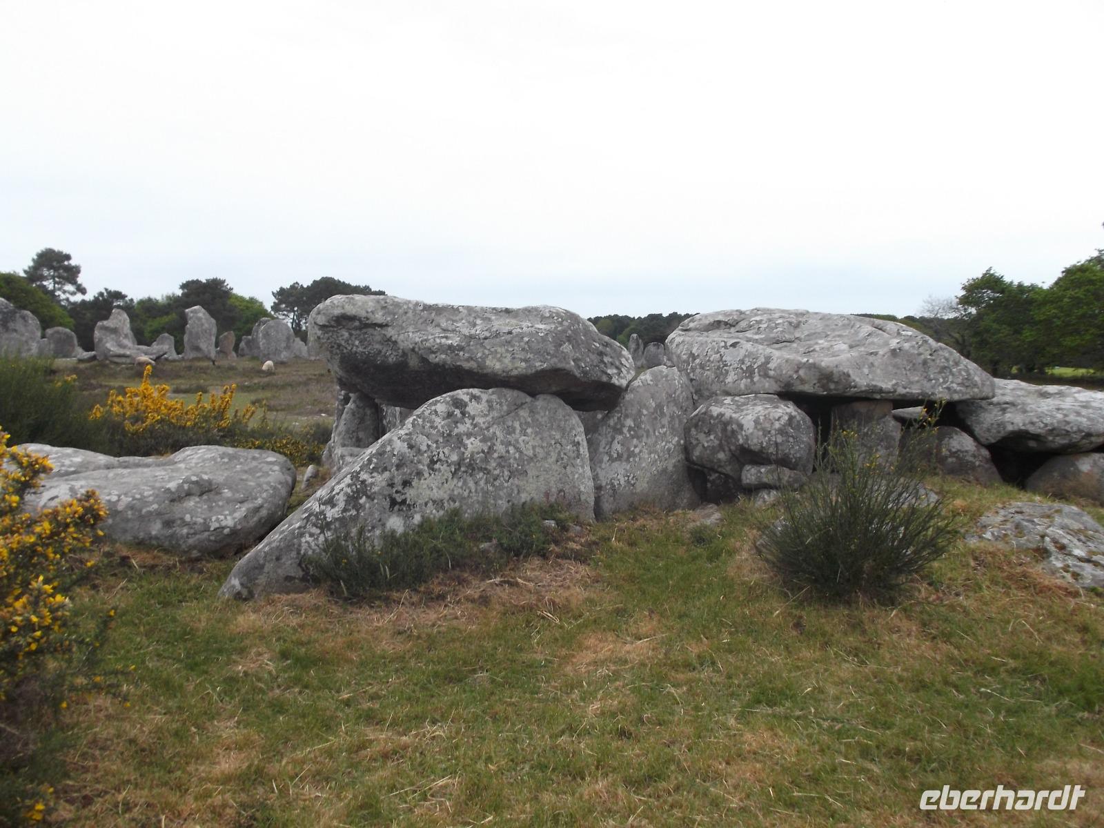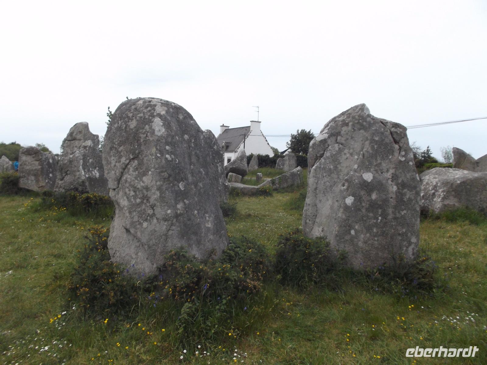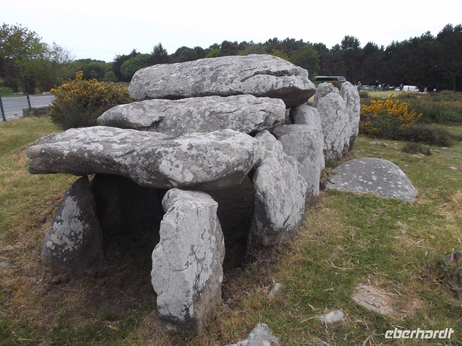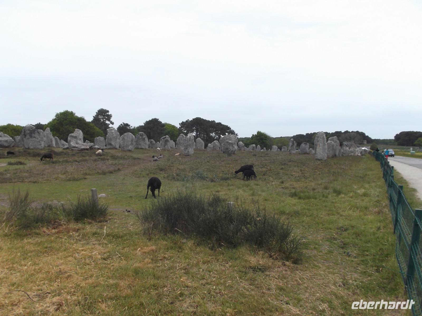 Zeugnisse und Überreste der Megalithkultur sind in vielen Ländern Europas zu finden, an einigen Punkten häufen sich ihre steinernen Zeugen, wie in Norddeutschland die hier „Hünengräber" genannten Dolmen oder in Großbritannien die Steinkreise. Auf engstem Raum konzentriert sich hier in der südlichen Bretagne neben den stehendenden Steinen, den Menhiren, eine ganz besondere Art von Großsteinmonumenten: die Alignements. Das sind parallele Setzungen riesiger Steine, oft kilometerlang in mehreren Reihen nebeneinander. Den ersten Kontakt mit diesen Alleen aus tonnenschweren Felsbrocken, die immer noch etwas Mystisches ausstrahlen, hatten wir bei einem Fotostopp an den Alignements von Kerzhero, wo man noch direkt zwischen den stehenden Kolossen herumlaufen kann. Später in Carnac, wo die bekanntesten dieser Steinalleen liegen, sind sie leider abgeschirmt und eingezäunt. Doch gleich nach unserem Eintreffen in Carnac, wo es vier weltweit bekannte Alignements gibt, hatten wir die Möglichkeit, auch die größten von ihnen - Le Menec und Kermario mit jeweils weit über 1000 stehenden Steinen - aus der Nähe zu fotografieren. Uns blieb genug Zeit, ein wenig von außen an den eingezäunten Reihen entlang zu bummeln und bei Kermario auch den fast unzerstörten Dolmen, ein gewaltiges Großsteingrab aus tonnenschweren Findlingsblöcken zu bestaunen.