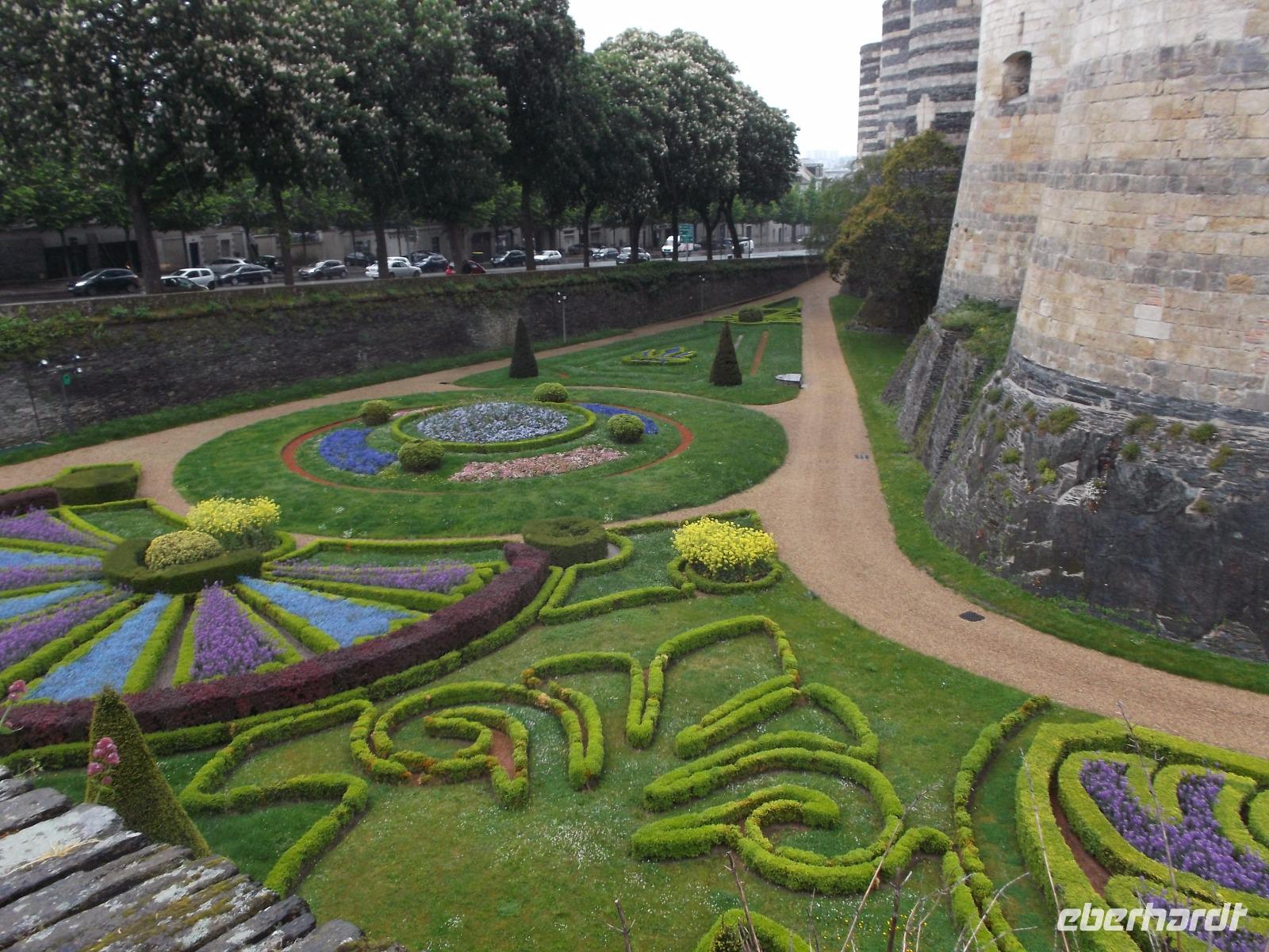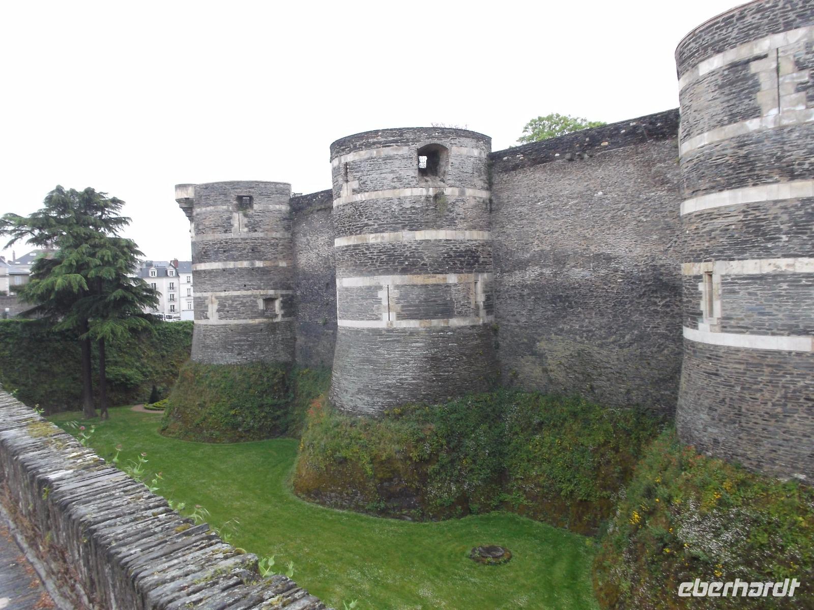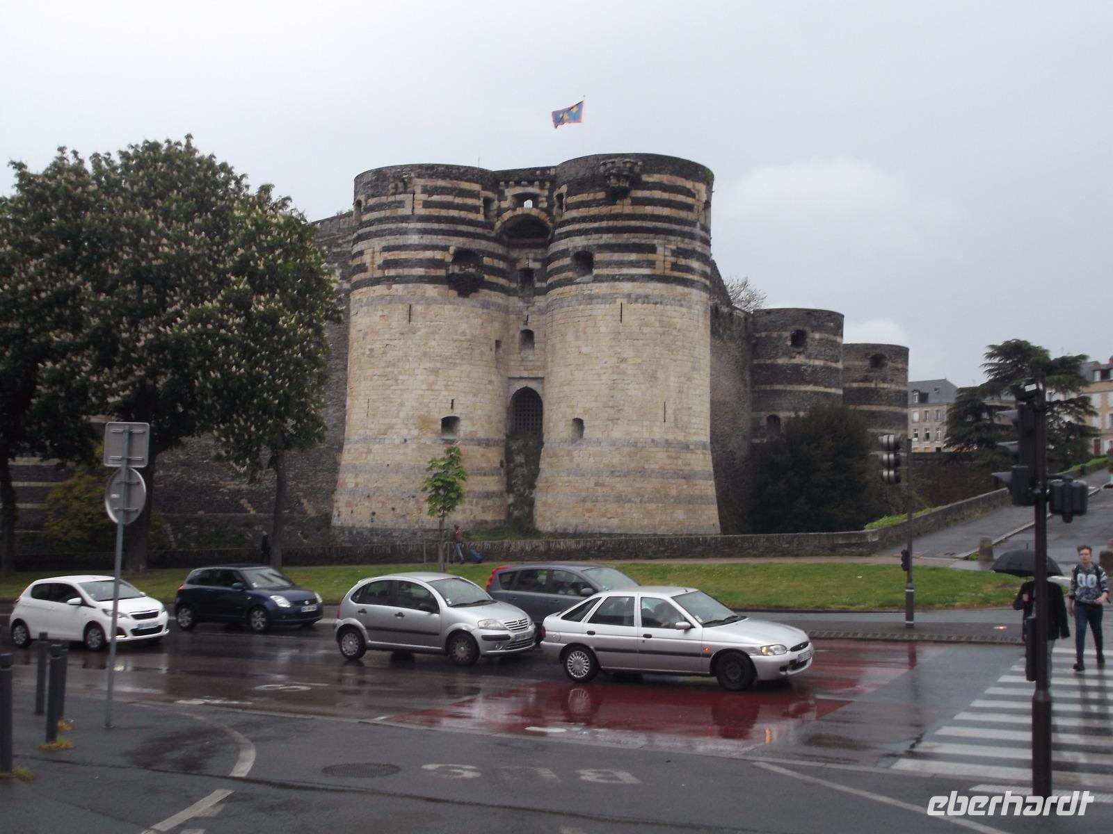 Bei für einen Montag recht entspannter Verkehrssituation kamen wir heute, auf der ersten Etappe unserer Heimreise, recht gut voran. So hatten wir genügend Zeit für Angers, die alte Hauptstadt des Anjou und ihr höchst wehrhaft wirkendes Schloss. Man sieht es schon von weitem, wie es sich über die Maine, den hier kurz vor seiner Mündung befindlichen Nebenfluss der Loire, erhebt. Es war Sitz der einstigen Herrscher von Anjou, die zunächst die Grafen- und seit dem hundertjährigen Krieg gegen England auch die Herzogswürde besaßen und beherbergt bis heute deren größtenteils nur als Ruinen vorhandene Residenz. Zudem gibt es hier aber einen der größten Kunstschätze Frankreichs. Während des hundertjährigen Krieges gab der Herzog von Anjou einen „köstlichen Bildteppich" in Auftrag. Der aus mehreren Teilen bestehende „Teppich der Apokalypse", gewebter und gewirkter Bildteppich-Zyklus, stellt Motive aus den Offenbarungen des Johannes dar. Als Gesamtkunstwerk ist er mit einer Länge von 100 m und einer Höhe von 4,50 m das größte Textilkunstwerk des Mittelalters. Einen weiteren Superlativ erreicht er durch seine Fertigstellung um 1382 - damit ist er auch das älteste erhaltene Kunstwerk seiner Art aus dem Mittelalter. Ängste und Aberglauben der mittelalterlichen Menschen, die Schrecken eines Weltunterganges aus den Traumphantasien des Evangelisten Johannes sind das Bildmotiv - drücken aber wohl auch die Situation zur Zeit der Entstehung des Teppichs mitten im hundertjährigen Krieg aus. Die beeindruckenden Teppiche werden in einer eigens für ihre Zur-Schau-Stellung und ihren Schutz erbauten Galerie gezeigt - und wir hatten die Zeit und Muße, das einzigartige Kunstwerk zu genießen.
