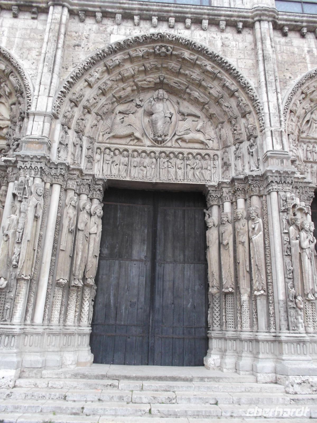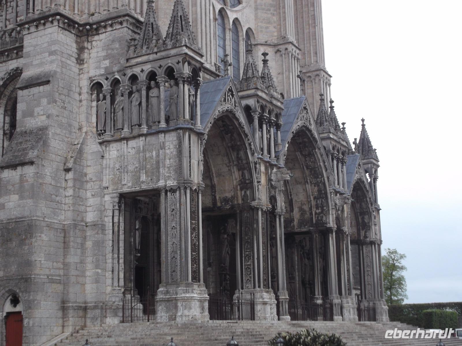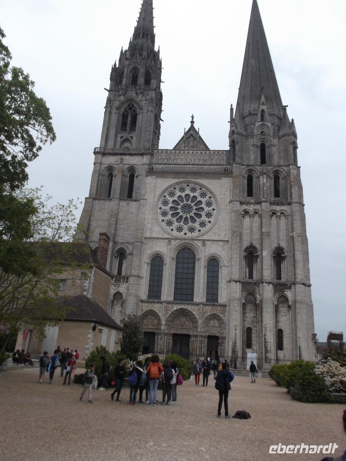 Von Angers ging es wieder auf die Autobahn, aber wir unterbrachen unsere Fahrt zur letzten Übernachtung im Raum Paris noch einmal, denn den Höhepunkt der Kathedrale von Chartres konnten wir uns nicht entgehen lassen. Sie ist eines der bekanntesten gotischen Sakralbauwerke weltweit und steht schon lange als UNESCO-Weltkulturerbe unter besonderem Schutz. Ihre Westfassade mit ihren flankierenden, ungleich hohen Türmen aus unterschiedlichen Bauzeiten wird dominiert von einer herrlichen Fensterrose, unter der drei Fenster und die berühmte filigrane Portalanlage die Dreifaltigkeit symbolisieren. Das sogenannte Königsportal wurde zwischen 1145 und 1150 geschaffen und hat den Brand der ersten gotischen Kathedrale überlebt. Ihre Statuen sind damit die ältesten erhaltenen gotischen Skulpturen der Kunstgeschichte!
