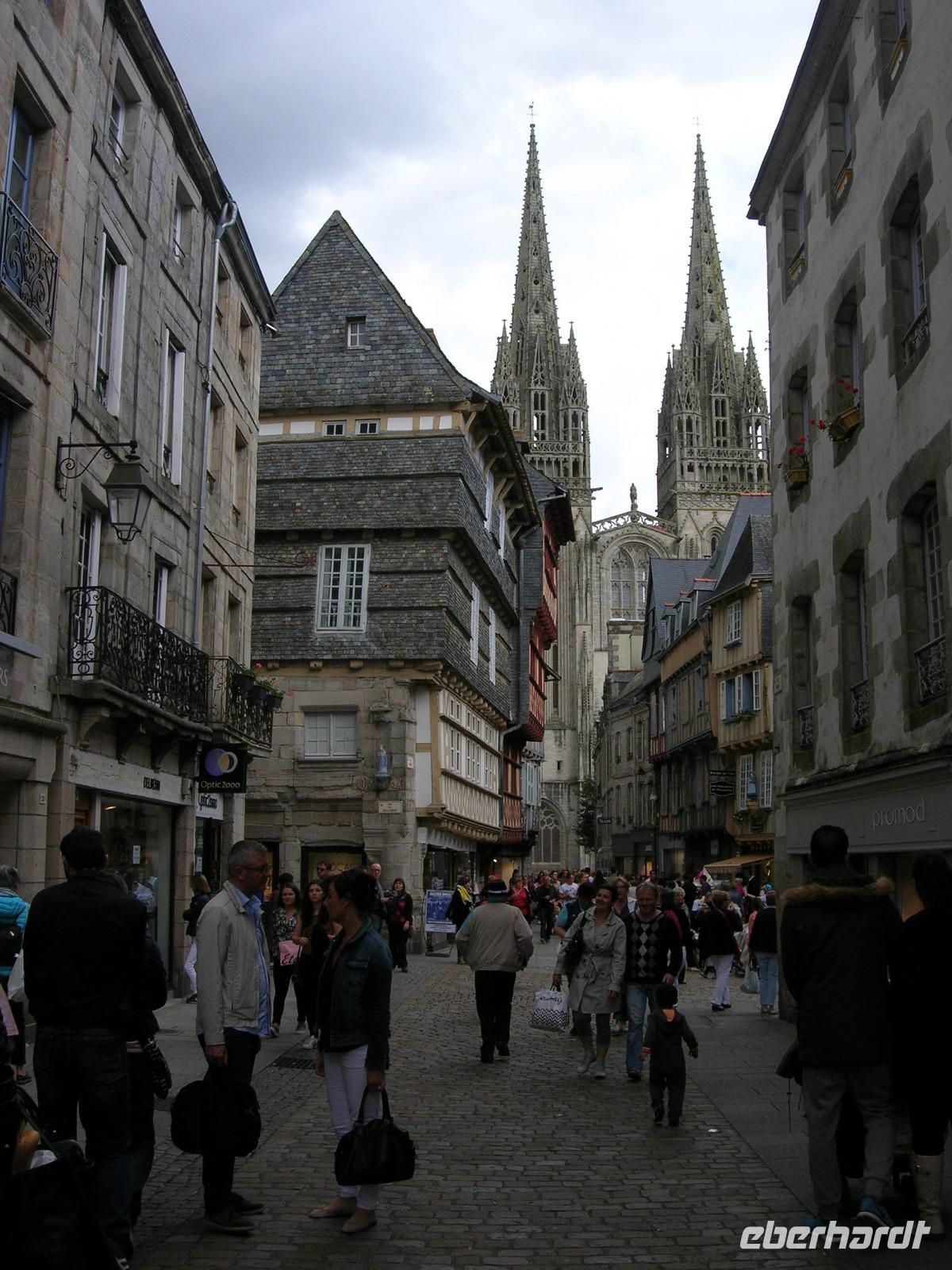 Unser fakultativer Ausflug in die historische Landschaft der Cornouaille führte unsere Gruppe am Samstagmorgen zunächst nach Locronan. Das Dorf wurde benannt nach dem Heiligen Ronan, einem im 7. Jahrhundert aus Irland in die Bretagne gekommenen Mönch, der in der Kirche von Locronan begraben ist. Im ausgehenden Mittelalter und in der Renaissance spezialisierte sich der Ort auf die Herstellung von Segeltuch und stattete damit nicht nur bretonische Segler sondern auch die Schiffe der Königlichen Marine Frankreichs aus. Seit dieser Blütezeit blieb Locronan nahezu unverändert erhalten und gilt seitdem mit seinen malerischen Renaissance-Gebäuden aus Granitstein und seinem stimmungsvollen Marktplatz als schönstes Dorf der Bretagne. Kein Wunder also, dass Locronan vor einigen Jahren als Drehort entdeckt wurde - z.B. für den Film "Tess" von Roman Polanski mit Nastassja Kinski in der Hauptrolle. Anschließend ging es an Douarnenez mit seinem bedeutenden Fischereihafen vorbei auf das Cap Sizun. Die extrem zugespitzte Landzunge reicht ca. 30 km in den Atlantischen Ozean hinein und trennt die Iroise See im Norden von der Keltischen See. Unser Ziel hieß Pointe du Raz - der spektakuläre westlicher Ausläufer des Caps. Mit ihren starken Gezeitenströme und zahlreiche Klippen bildete sie einst eine lebensgefährliche Passage für die Schiffahrt. Heute erreichen die Schiffe in einem großen Bogen die ca. 8. km westlich liegende Ile de Sein. Nach diesem großartigen Naturschauspiel unter blauem Himmel an der Pointe du Raz fuhren wir entlang der südlichen Küste des Cap Sizun zurück nach Quimper, um am Nachmittag noch die Hauptstadt der Cornouaille mit ihrer Cathédrale Saint Corentin und ihren stimmungsvollen Gassen und Plätzen zu erkunden.