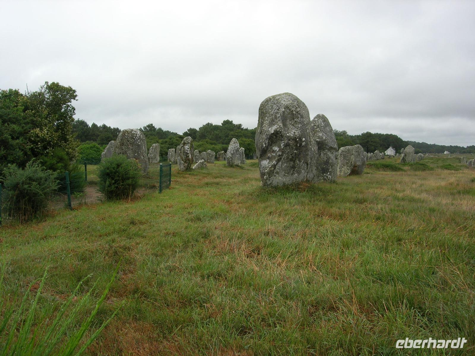 Bei leichtem Regen verließen wir am Morgen Quimper, der bis zu unserer Ankunft in der Festungsstadt Concarneau, eine der wichtigsten Festungen der Bretagne, andauerte. Sie liegt mitten im Fischereihafen und ist seit dem 12. Jahrhundert durch eine Brücke mit dem Festland verbunden. Seit 1905 als die Sardinenschwärme plötzlich ausblieben, feiert man hier jedes Jahr Mitte August das "Festival der blauen Netze" (Fête des Filets Bleus). Nach einer kleinen Besichtigung der Festungsstadt setzten wir Reise auf der Schnellstraße A 165 in Richtung Vannes fort. Unterwegs kommen wir an Pont-Aven vorbei, wo sich ab 1886 um Paul Gauguin und Émile Bernard die sogenannte "Schule von Pont-Aven" gründete. In Abkehr vom Impressionismus wurde seinerzeit in dem bretonischen Dorf die wesentlichsten Grundlagen der für die Moderne Kunst geschaffen, die der inneren Welt des Malers unabhängig von der Wirklichkeit dem Vorrang gab und seine malerischen Mittel auf das Wesentliche reduzierte. Unser nächstes Ziel lag heute im Departement Morbihan und führte uns jahrtausende zurück in die Jungsteinzeit. Die Steinreihen (Alignements) von Carnac entstanden zwischen dem 5. und dem 3. Jahrtausend v. Chr.. In Le Ménec umfassen sie 1050 Steine, die sich über eine Länge von 950 m erstrecken. Hier enden die 11 Reihen der bis zu 4 Meter hohen Menhire. Die Deutung der gesamten Megalitanlage von Carnac liegt noch immer im Dunkeln. Sicher ist jedoch, dass es sich hier um eine der ältesten Kultstätten der Menschheitsgeschichte handelt. Am Nachmittag erreichten wir die Bootsanlegestelle von Locmariaquer, wo wir nach einem stärkenden Getränk an der Hafenkneipe unsere zweistündige Bootsfahrt auf dem Golfe von Morbihan begann. Bei wechselhaften Wetter zog uns die malerische Inselwelt des "Kleinen Meers" (= Mor-bihan) in ihren Bann. Der Golf ist 20 km breit und bis zu 15 m tief. Der 1 km breite Durchlass zum offenen Meer vor Port-Navalo ermöglicht durch den Gezeitenwechsel die ständige Erneuerung des Wasser im Golf.