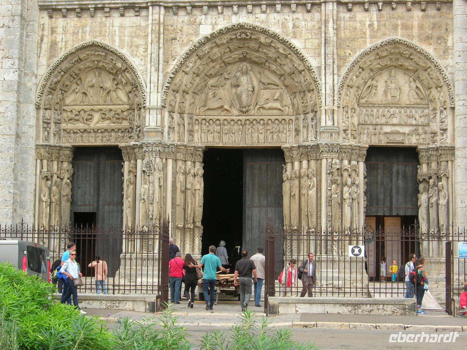 Am Montag hieß es nun leider Abschied nehmen von der Bretagne. Bei la Roche-Bernardt fuhren wir über den Fluss Vilaine, der jahrhundertelang lang die Grenze der Bretagne bildete und heute die Grenze zur Region Pays de la Loire markiert. Wir kamen an der alten bretonischen Residenz- und Handelsstadt Nantes, heute Hauptstadt dieser Region, vorbei und erreichten bald darauf Angers. Die Stadt an der Maine war einst Hauptstadt des Anjou, deren Blütezeit im 12. Jahrhundert unter den mächtigen Herzögen von Plantagenet begann und 1480 mit dem Tod von König Réne, des letzten Herzogs des Anjou, endete. Aus der Zeit der Regentschaft der Blanka von Kastilien und ihres Sohnes Karl von Anjou blieb bis heute eine beeindruckende Festung erhalten, die das Herzogtum von Angriffen der Bretonen schützen sollte. Auf dem Gelände dieser Festung befindet sich heute in einem Anfang der 50ger Jahre errichteten Museum der Teppichzyklus zur Apokalypse, einem Text aus dem Johannesevangelium des Neuen Testaments. Er wurde im Auftrag von Herzog Ludwig I. von Anjou nach Entwürfen von Jean de Bruges 1373-1380 in der Pariser Werkstatt von Nicolas Bataille gewebt und gilt als einer der ältesten erhaltenen und qualitätvollsten Bildzyklen dieser Größe überhaupt. Während sich einige aus unserer Gruppe der Festung und der Ausstellung des Wandtteppichs zu wandten, nutzten andere die Zeit, um durch die schöne Altstadt von Anjou zu spazieren bzw. dort eine Mittagspause einzulegen. Auf unserer Weiterfahrt in Richtung Paris wartete noch eine großartige Sehenswürdigkeiten auf uns: Chartres mit seiner weltberühmten Kathedrale, die Vorbild für viele später erbauten Kathedralen, vor allem in Deutschland, wurde. Leider war ein Teil des Mittelschiff teilweise noch ein gerüstet und auch das Stein-Labyrinth im Fußboden verdeckt. Gesehen und bewundert haben wir jedoch die ältesten Zeugnisse gotischer Bauplastik am Westportal, die formvollendete Architektur des Bauwerks, die als Summe aller frühgotischen Entwicklungen den Ausgangspunkt für die hochgotische Kathedralbaukunst lieferte und nicht zuletzt die Glasfensterzyklen in den Seitenschiffen und im Chor, die zu den ältesten und qualitätvollsten Zeugnissen der französischen Glasmalerei gehören. Anschließend bot sich noch einmal ein Gelegenheit für eine Kaffee auf dem Kathedralplatz, einem der schönsten Plätze in Frankreich, oder einen kleinen Rundgang durch die Altstadt. Am Abend erreichten wir dann das letzte Hotel unserer Reise im Pariser Vorort Créteil.