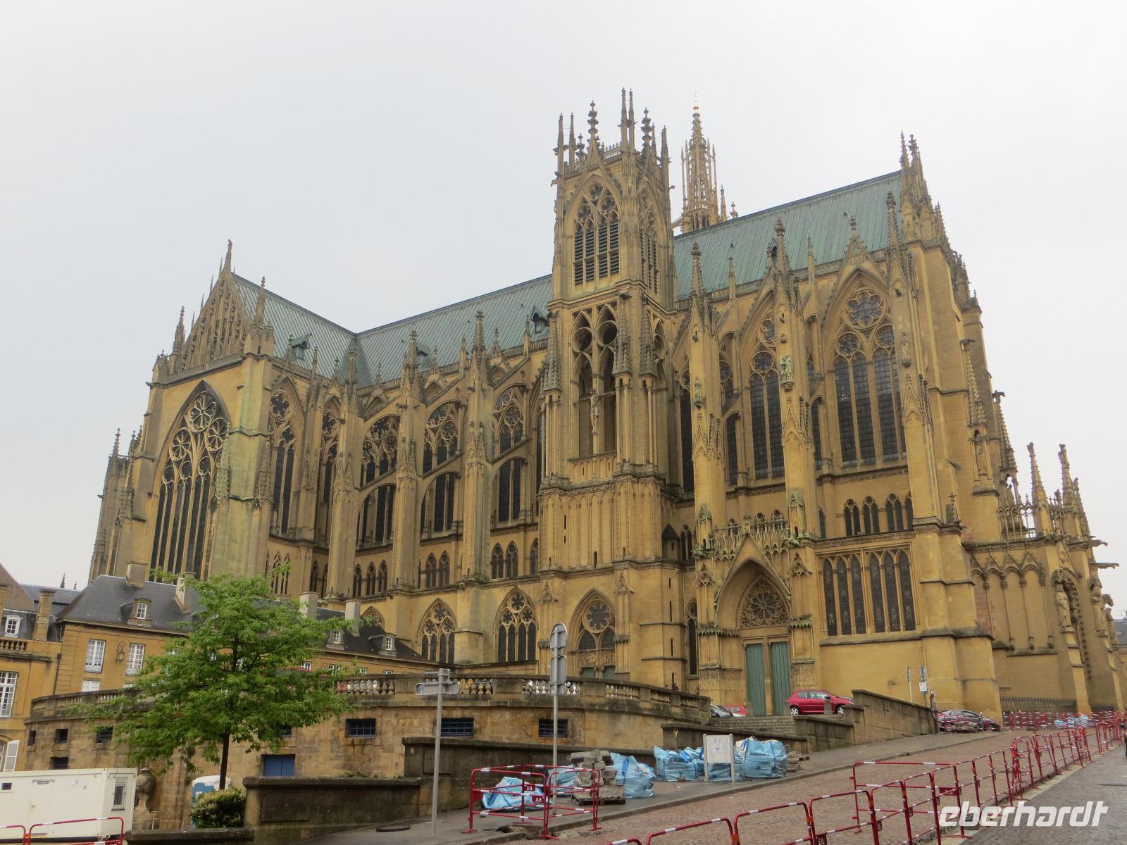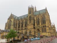 Zweiter Wahlgang der französischen Präsidentenwahl an diesem Tag - am Abend sollten wir schlauer sein. Zu 6:00 Uhr trafen sich die ersten Gäste in Dresden, um eine 750 Kilometer lange Fahrt durch Mitteldeutschland, Hessen, Rheinland-Pfalz und das Saarland bis nach Lothringen anzutreten. Bei Frankfurt und Grünstadt stiegen die letzten Gäste zu, so dass dann die Reisegruppe mit dreißig Gästen komplett war. Während der Fahrt schwankte die Witterung zwischen Nieselregen und ganz kurzer Sicht, so dass wir selbst naheliegende Sehenswürdigkeiten wie die Wartburg nicht sehen konnten. In Anbetracht noch langer gemeinsamer Fahrstrecken verschoben wir die „Einführung in die Geschichte Frankreichs" auf kommende Tage. Nach unserer Ankunft im Hotel Kyriad in Metz trafen wir uns siebzehn Uhr zu einem kleinen Stadtbummel mit dem Ziel eine der größten französischen Kathedralen, S. Etienne, zu besichtigen. Neben der Größe beeindruckt die Kathedrale insbesondere durch ihre 6500 m² Glasfenster. Auch wenn das Blau der Fenster auf der rechten Seite zunächst an Chagall erinnert, der Schöpfer dieser Fenster ist Vignon; Chagalls Fenster befinden sich im Hochaltar. Kostbar und hoch oben die schwalbennestartig angebaute Orgel aus der ersten Hälfte des 16. Jahrhunderts. Bei trübem Wetter bummelten wir zur Insel mit dem Theater und durch Gassen der Stadt mit wechselvoller Geschichte und einer etwas grau wirkenden Architektur - aber vielleicht lag es am Wetter und unserer Müdigkeit nach langer Fahrt? Abendessen als 3-Gang-Menü mit Quiche Lorrain („Eierschecke mit Schinkenstreifen"), Lachsforellenfilet und heißen Mirabellen mit Vanilleeis, Nach einem langen Tag bummelte wohl keiner mehr durch die Stadt - es war ein langer Tag. .