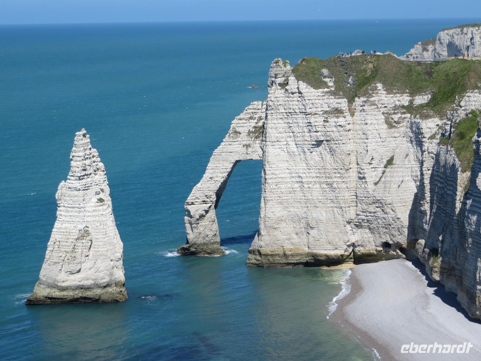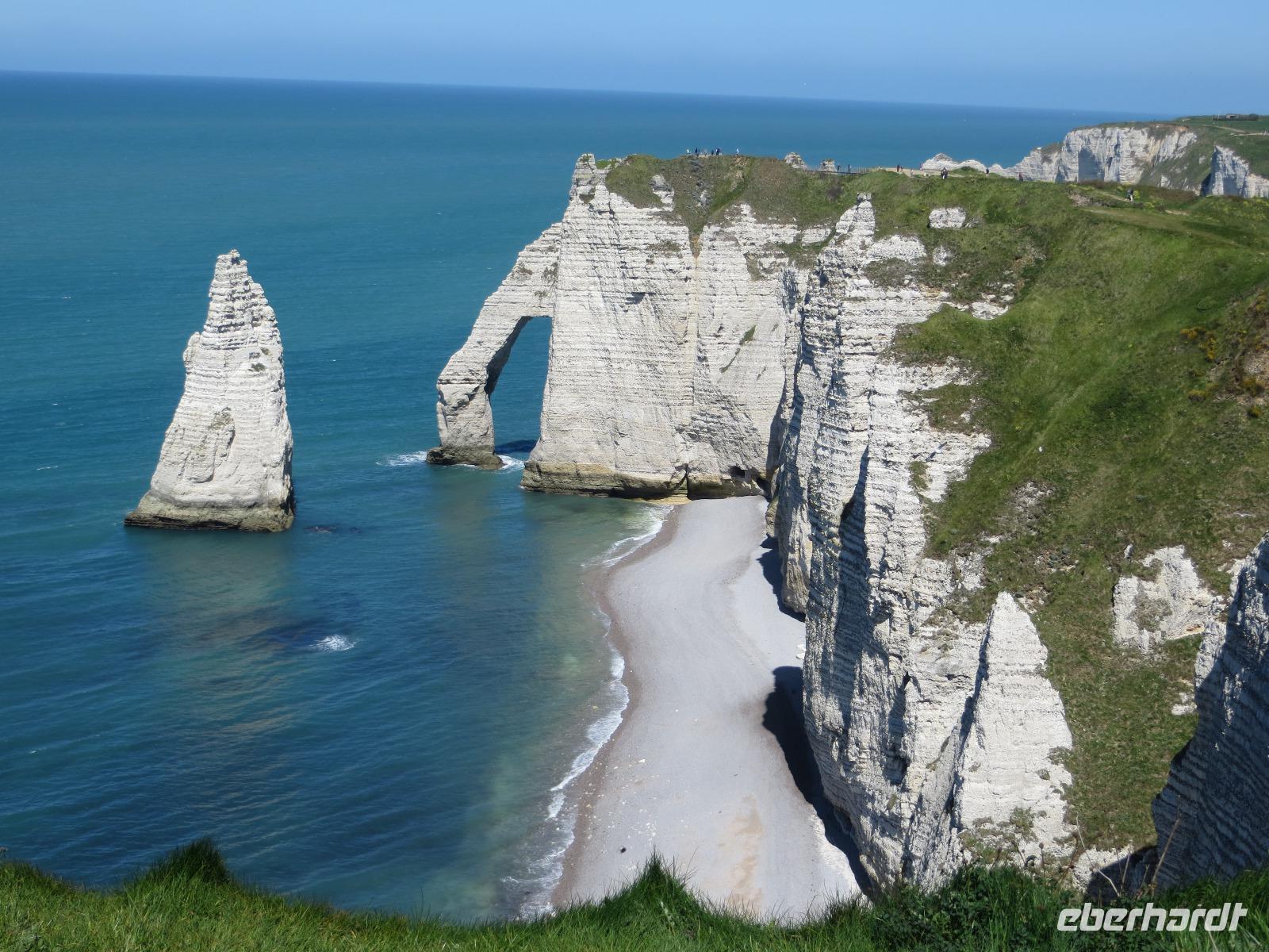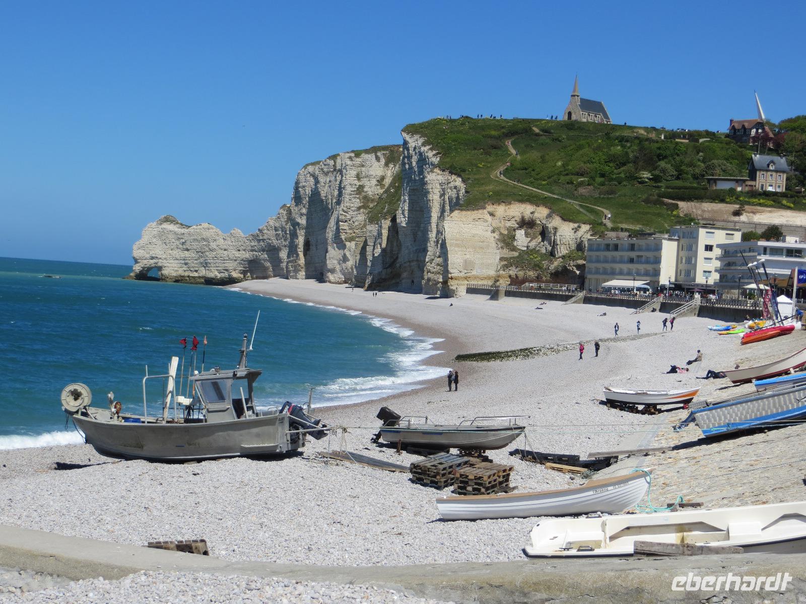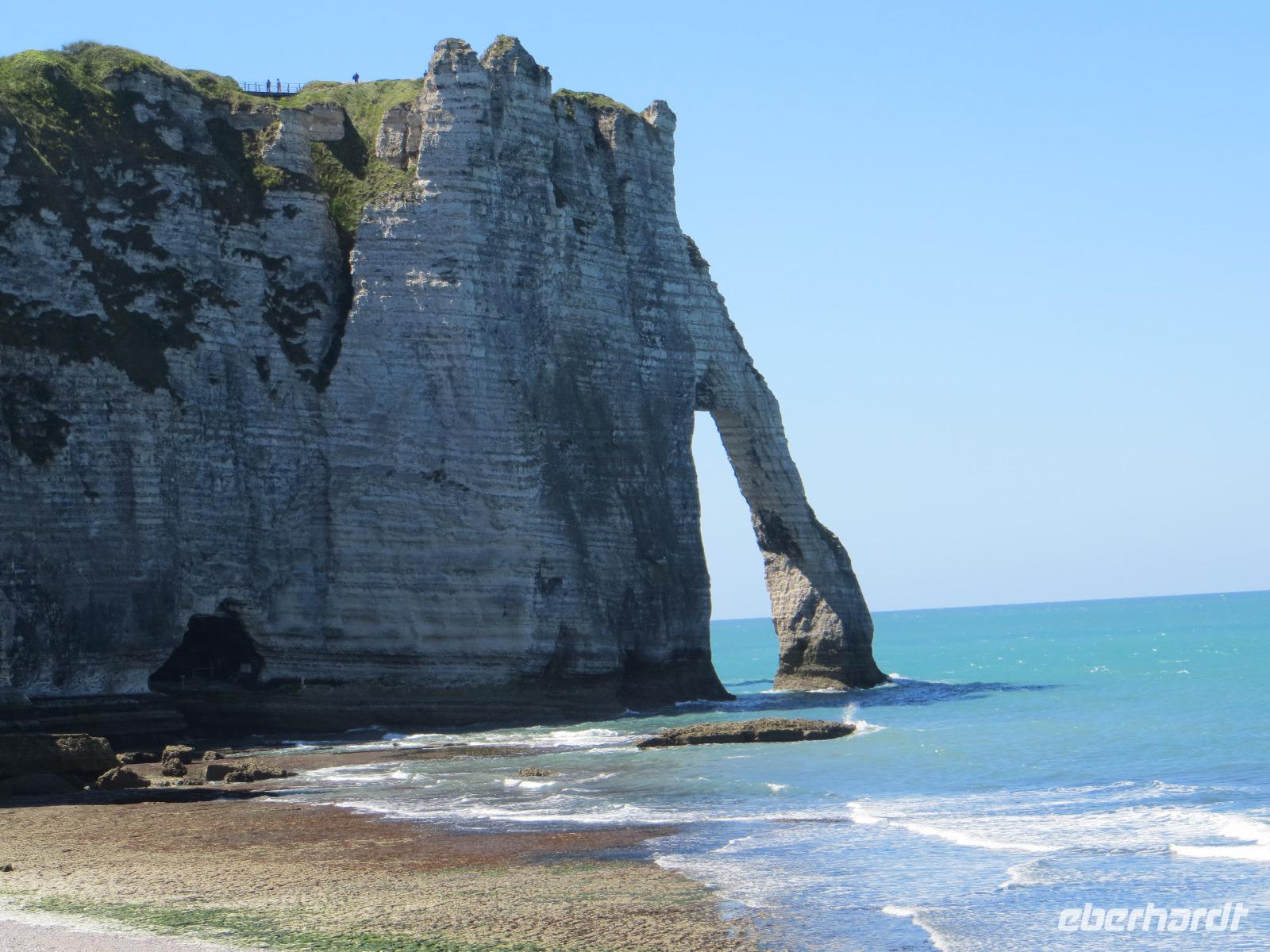 Unsere örtliche Reiseleiterin erwartete uns bereits in der Toursitinformation zu einem Bummel auf den Spuren der Johanna von Orleans. Wir starteten an der Westseite der Kathedrale zum Stadtbummel in Rouen, der zweitgrößten Stadt der Normandie. So begannen wir den Bummel vor und in einer der imposantesten gotischen Kathedralen Frankreichs, sahen den Butterturm, der aus Spenden - oder doch wohl eher aus dem Ablasshandel finanziert wurde - und den hohen Helmturm, die übliche gotische Rosette an der Westfront, und in der Kirche die „Parade der Apostel". Unser Bummel führte uns vorbei an schiefwinkligen Fachwerkhäusern der Altstadt und zum ehemaligen Gebeinhaus der Pesttoten. Am Justizpalast vorbei strebten wir zur Rue d' Horologue mit dem bekannten Uhrturm und der wohl ältesten Turmuhr. Weiter ging es zum Alten Markt, jenem Platz, wo 1431 Jeanne d´Arc den Feuertod starb. Eine moderne, flache Kirche steht nun in diesem Areal. Zur Mittagszeit starteten wir am Ufer der Seine zur Weiterfahrt an die Atlantikküste in das im Sommer recht trublige Etretat - zur Maienzeit ist der Touristenstrom fast noch überschaubar. Am Strand erstreckt sich linker Hand aufsteigend die Steilküste am Falaise d' Aval und rechtsseitig die Falaise d' Amont. Riesige Felsentore öffnen sich im Kalkstein und die von Westen scheinende Sonne produziert leuchtend hellen Fels und smaragdgrünes Wasser des Ärmelkanals. Wer auf einen der Hügel anstieg, wurde für sein Mühen belohnt und konnte manch schönes Urlaubsbild machen. Am späten Nachmittag erreichten wir das moderne Hafenviertel von Le Havre und unser Hotel Mercure am Bassin.
