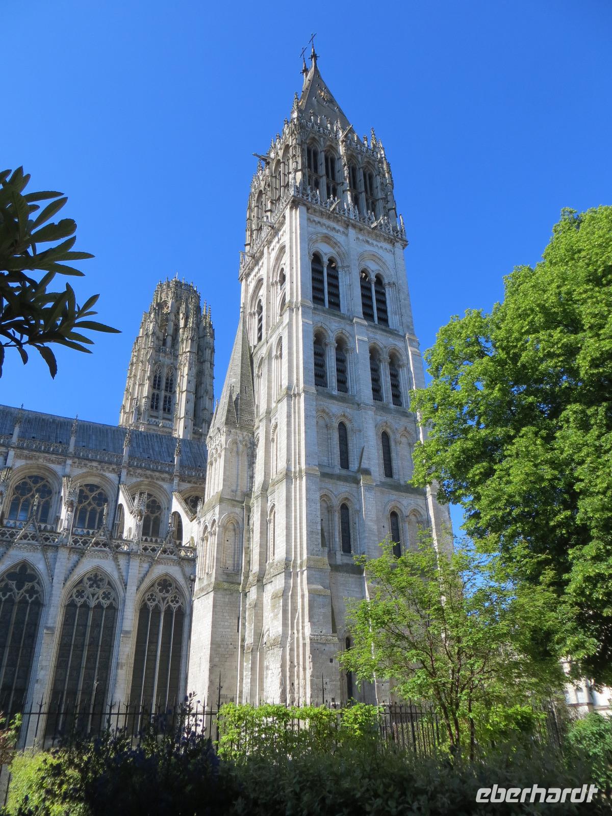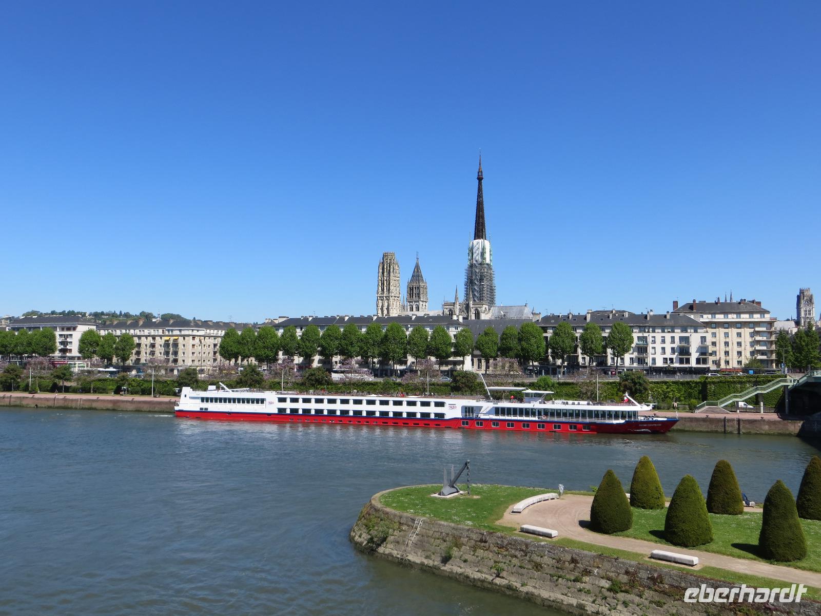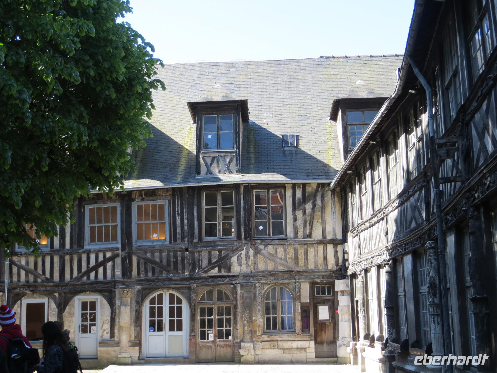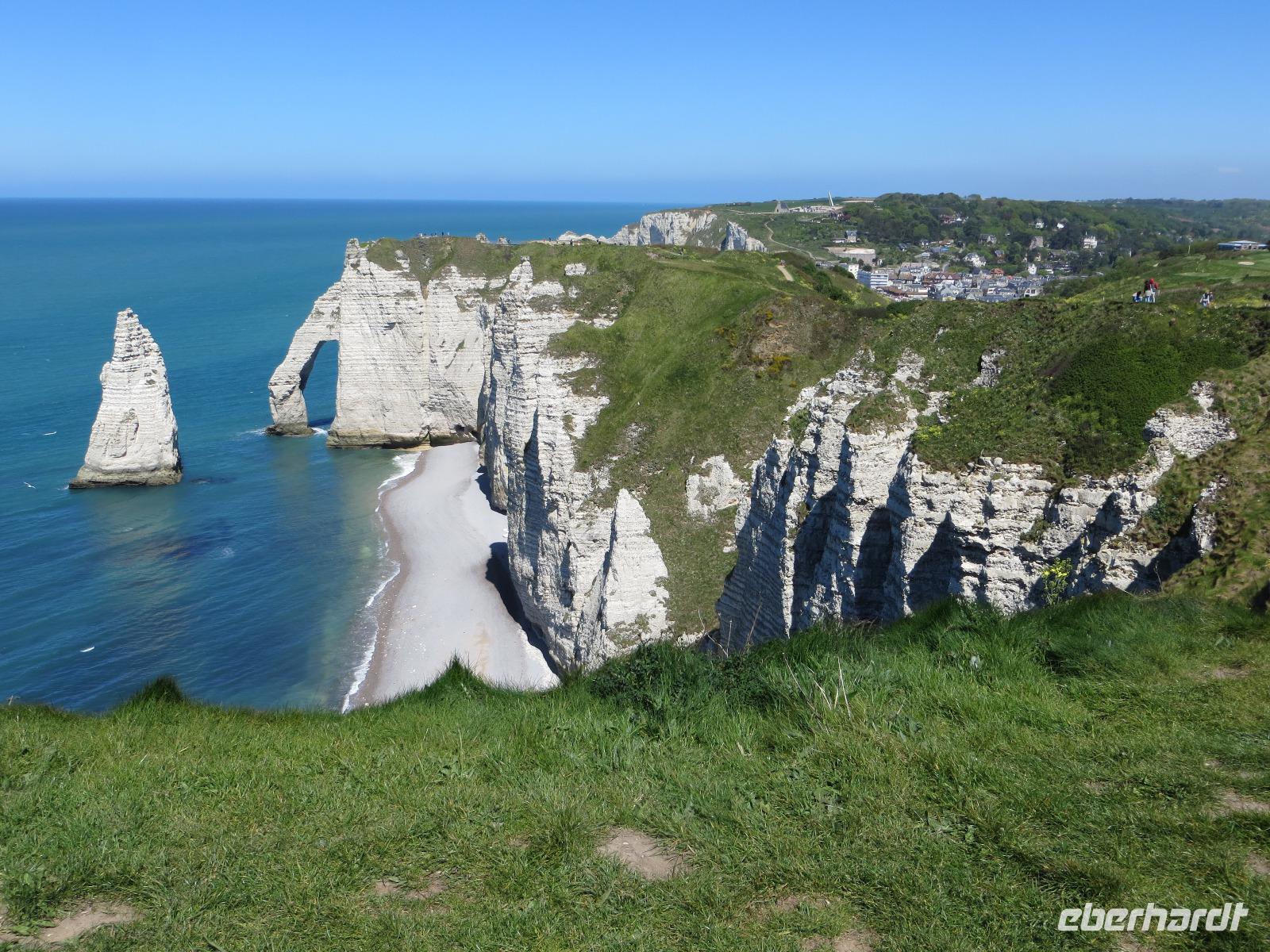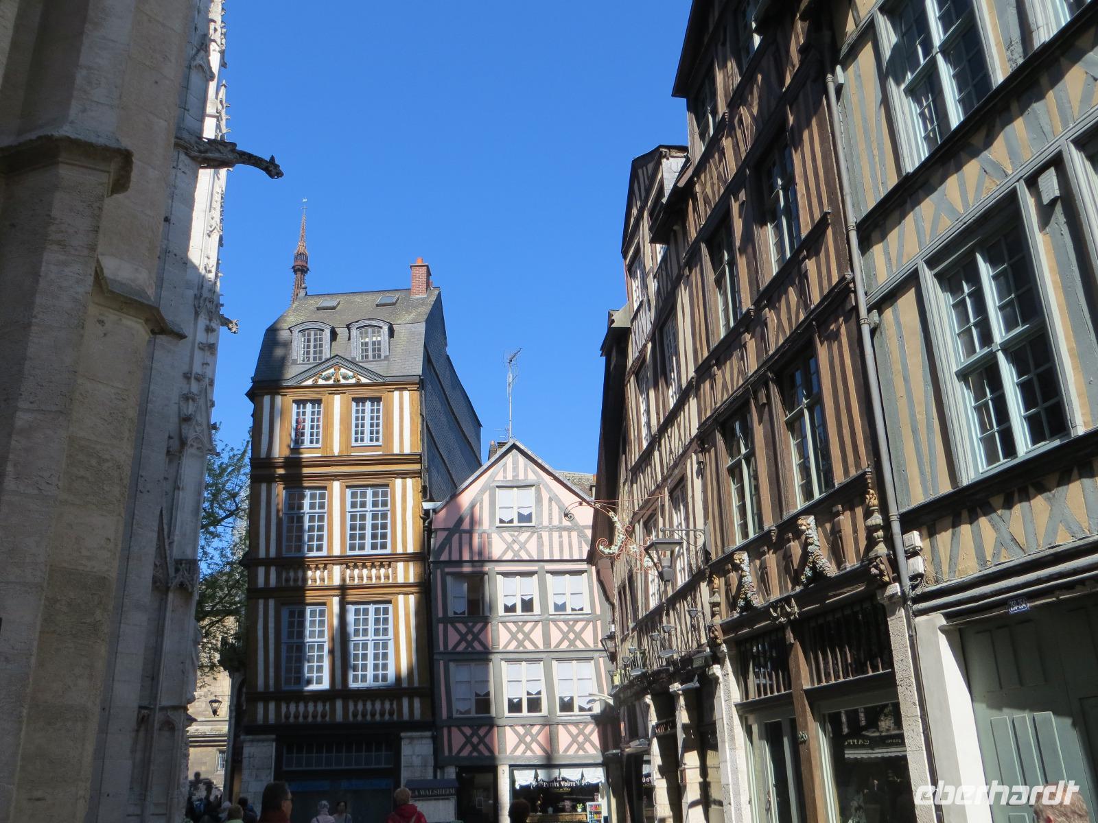 Unsere örtliche Reiseleiterin erwartete uns bereits in der Toursitinformation zu einem Bummel auf den Spuren der Johanna von Orleans. Wir starteten an der Westseite der Kathedrale zum Stadtbummel in Rouen, der zweitgrößten Stadt der Normandie. So begannen wir den Bummel vor und in einer der imposantesten gotischen Kathedralen Frankreichs, sahen den Butterturm, der aus Spenden - oder doch wohl eher aus dem Ablasshandel finanziert wurde - und den hohen Helmturm, die übliche gotische Rosette an der Westfront, und in der Kirche die „Parade der Apostel". Unser Bummel führte uns vorbei an schiefwinkligen Fachwerkhäusern der Altstadt und zum ehemaligen Gebeinhaus der Pesttoten. Am Justizpalast vorbei strebten wir zur Rue d' Horologue mit dem bekannten Uhrturm und der wohl ältesten Turmuhr. Weiter ging es zum Alten Markt, jenem Platz, wo 1431 Jeanne d´Arc den Feuertod starb. Eine moderne, flache Kirche steht nun in diesem Areal. Zur Mittagszeit starteten wir am Ufer der Seine zur Weiterfahrt an die Atlantikküste in das im Sommer recht trublige Etretat - zur Maienzeit ist der Touristenstrom fast noch überschaubar. Am Strand erstreckt sich linker Hand aufsteigend die Steilküste am Falaise d' Aval und rechtsseitig die Falaise d' Amont. Riesige Felsentore öffnen sich im Kalkstein und die von Westen scheinende Sonne produziert leuchtend hellen Fels und smaragdgrünes Wasser des Ärmelkanals. Wer auf einen der Hügel anstieg, wurde für sein Mühen belohnt und konnte manch schönes Urlaubsbild machen. Am späten Nachmittag erreichten wir das moderne Hafenviertel von Le Havre und unser Hotel Mercure am Bassin.