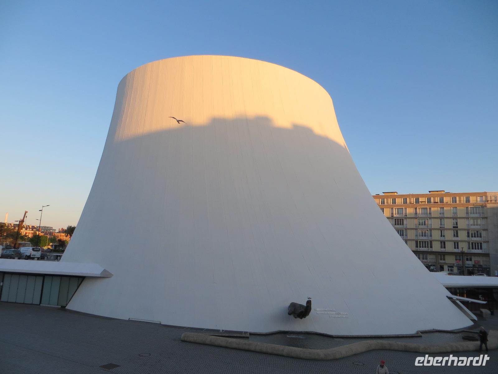 Auf unswerem Weg zum ein Kilometer entfernten Restaurant Bistrot des Halles bestaunten wir die Architektur der Nachkriegsmoderne: immerhin wurde für das Ensemble von Le Havre der Welterbetitel verliehen. Markantester Bau ist jedoch der „Vulkan" des Architekten Niemeyer - ein Kulturzentrum.
