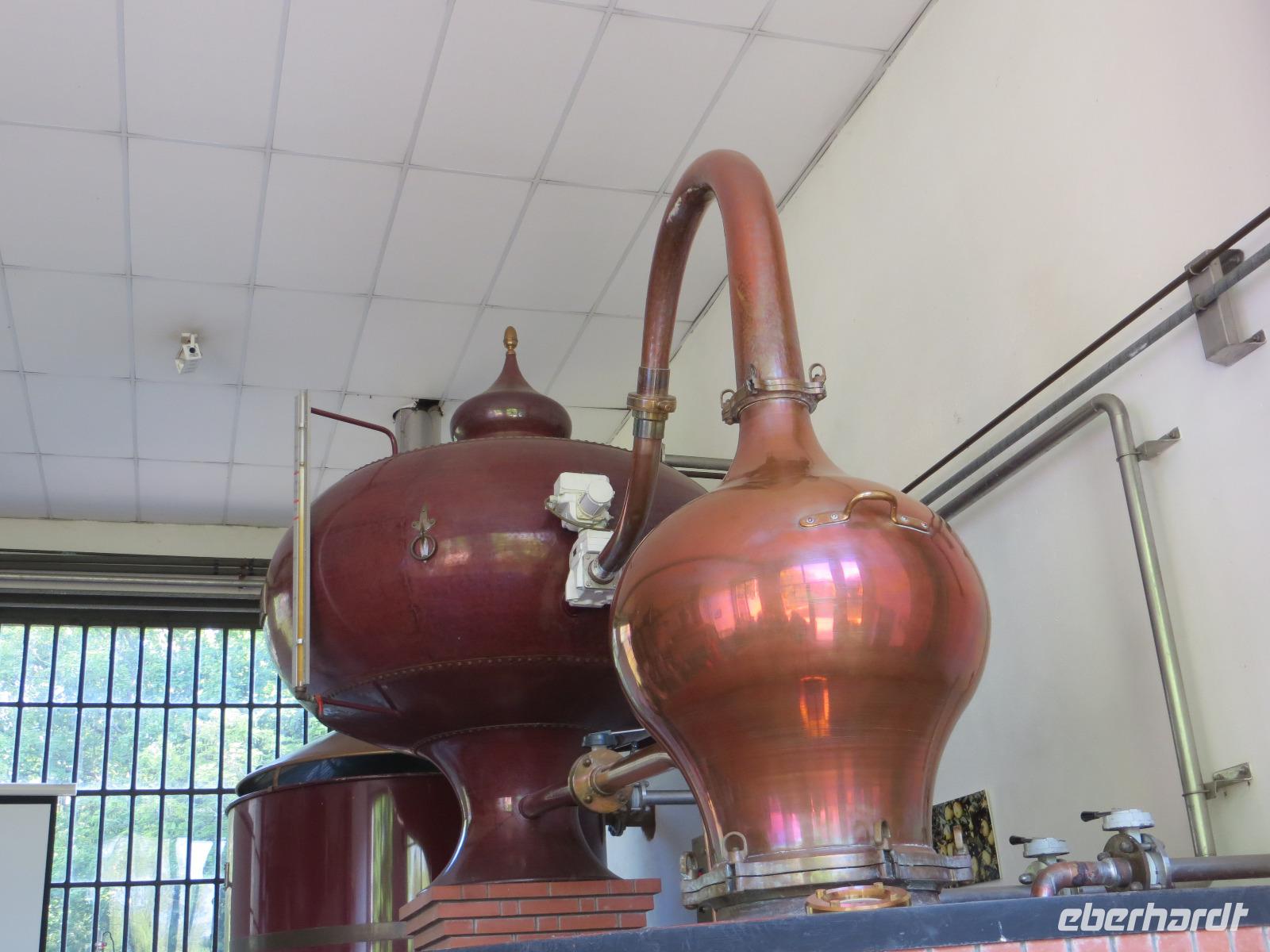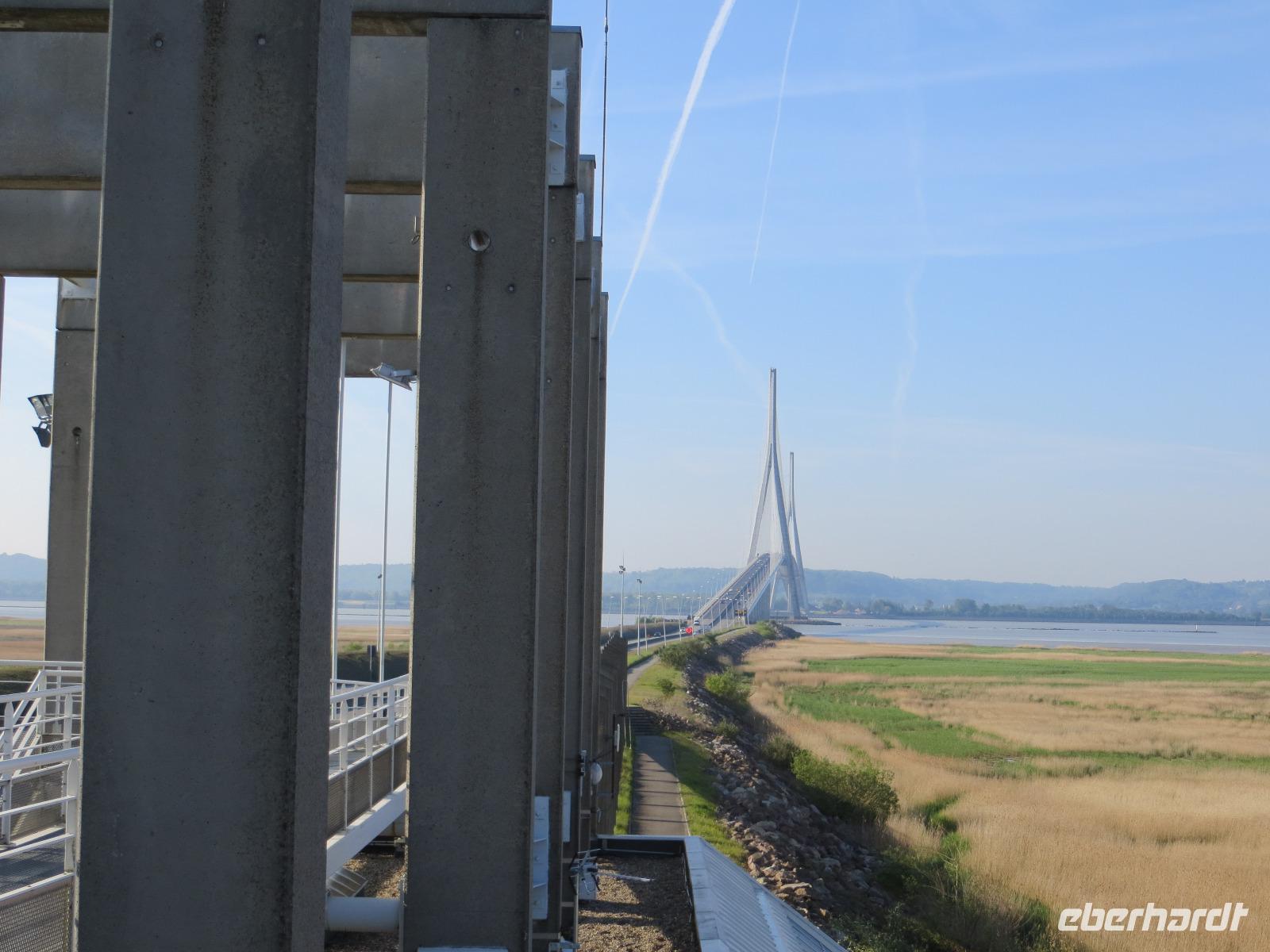 Wenige Busminuten nach Le Havre besichtigten wir die höchste europäische Seilbrücke, die Brücke der Normandie, die sich zwischen Le Havre und Honfleur über die Seine spannt. Zur besten Vormittagszeit trafen wir in Brieul en Auge ein, um mehr über die Destillation von Calvados zu erfahren: die Produktionslinie Apfel - Apfelsaft - Cidre - bringt nach zweimaligem Destillieren, dem Verwenden des Herzstücks, der Lagerung in Eichenfässern - Calvados. Nach einem Bummel durch Destillerie, Lagerkeller und vorbei am Schloss einer der renommiertesten Calvadosbrennereien der Normandie kosteten wir einen Schluck Pommaux und ein Schlückchen 15-jährigen Calvados. Für manchen auch die Chance zum Erwerb eines flüssigen Souvenirs. Vom alten Hafenort Honfleur am Mittag waren alle begeistert. Zahlreiche Handelshäuser aus der Renaissance reihen sich am Ufer des Hafenbeckens. Hinter diesen dann die Holzkirche St. Catherine mit einer Dachkonstruktion wie zwei umgekehrte Schiffskiele. Zeit für ein Muschelessen blieb auch für diejenigen, die dies so gern am Atlantik ausprobieren wollten. Mit dem Bus ging es dann an die Atlantikküste. Um den D-Day, die Aktion „Overlord" , also die Landung der Alliierten am 6. Juni 1944 korrekt zu erklären, fuhren wir über die Pegasusbrücke und mancher entsann sich an den Film „Der längste Tag". Dann ging es zu den Stränden der Anlandung mit den militärischen Bezeichnungen wie Juno, Gold, Omaha. Bei Arromanches blickten wir auf die Reste des künstlichen Hafens Mulberry, in dem 1944 binnen weniger Wochen mehr als 200.000 Soldaten und 40.000 Fahrzeuge anlandeten.