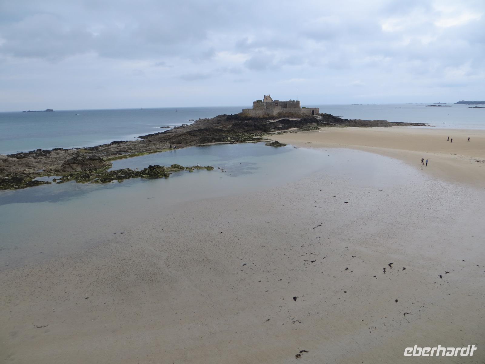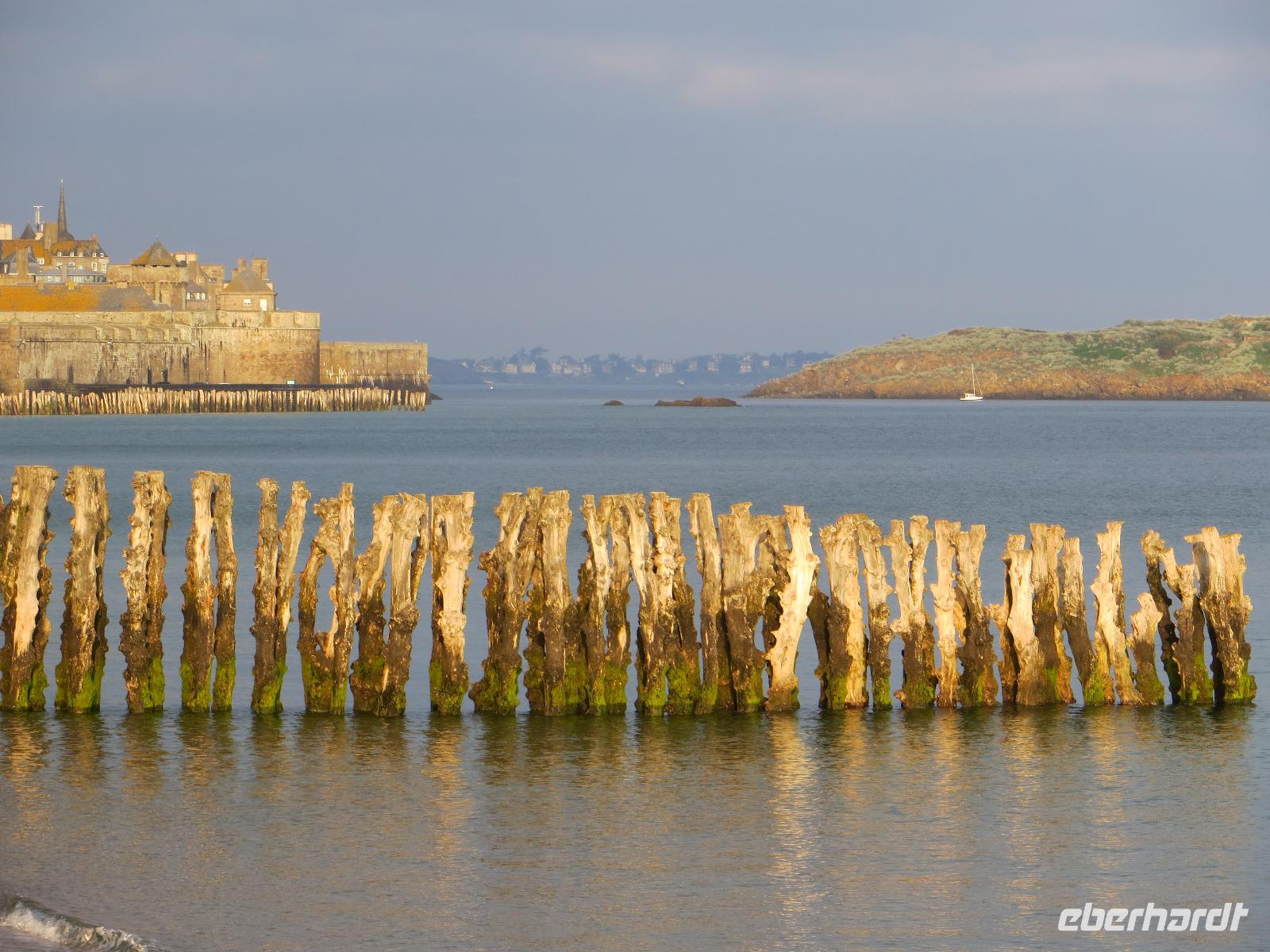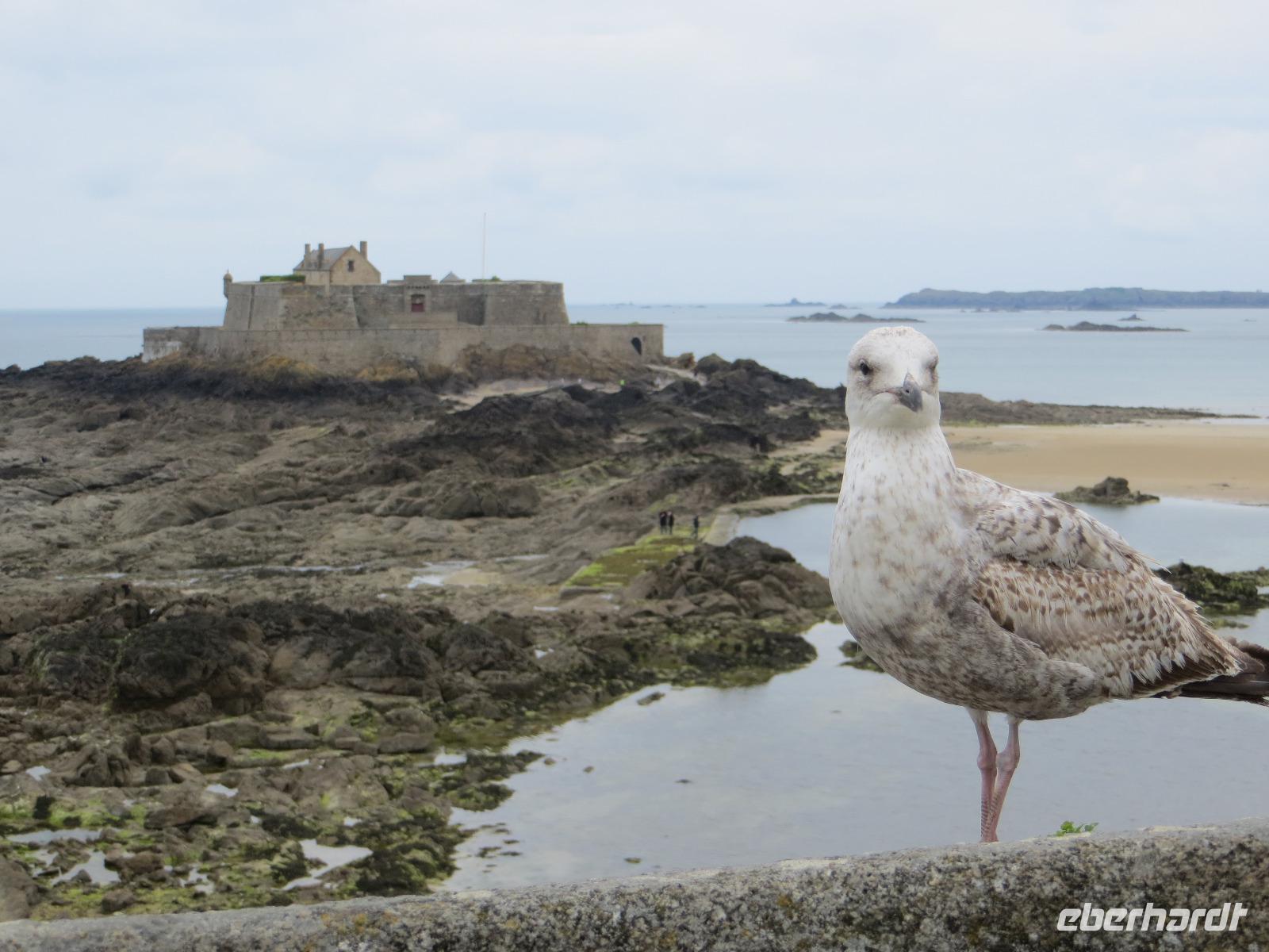 Da die versandende Fläche rund um den Granitfelsen wasserführender gestaltet wird, fährt der Transferbus nun über einen Damm und auf einer gewundenen Fahrbahn auf Stelzen, durch die nun das Wasser bei Flut fließen kann. Nach einigen Fußwegminuten, Toilettenpause und Shuttlebusfahrt stehen wir am Tor der Bürgerwehr - heute steht Gendarmerie hier: es ist Ausnahmezustand in Frankreich, was wir meist doch völlig augeblendet haben. Durch das Tor des Königs geht es wie einst Millionen Pilgern und heut Touristen durch die Große Straße, dann Treppen hinauf, vorbei an Fast-Food und Souvenirs zur Abtei. Vorher erheischen wir noch einen Blick in die Räume von Mutter Poulard, die einst für Pilger hier Omelett bereitete; heute gibt's auch noch dies nach alten Rezepten aber zu neuen Preisen. Mit einem Audioguide in bester deutscher Sprache ausgerüstet, konnte sich dann jeder individuell die Säle, das Refraktorium und die Treppe und Terrasse erschließen, bevor er nach gut einer Stunde den Almosensaal erreichte. Nach der Besichtigung einer der ersten UNESCO-Weltkulturerbestätten und doch reichlich Freizeit ging es mit dem Bus durch Polder nach Cancale - erste Adresse der Gourmets für frische Austern. Auch wir probierten und spülten mit einem Schluck Cidre nach. Zurück nach St. Malo, bummelten wir in alten Gassen und auf den Remparts, der Stadtbefestigung mit tollen Aussichten in die Gassen der Stadt, in Wohnzimmer und auf das Meer. Einige schlenderten bei Ebbe über die weiten Sandflächen direkt neben der Uferstraße von St. Malo zum Hotel. Nach dem Abendessen versuchten es gar zwei Gäste mit dem Anbaden ...