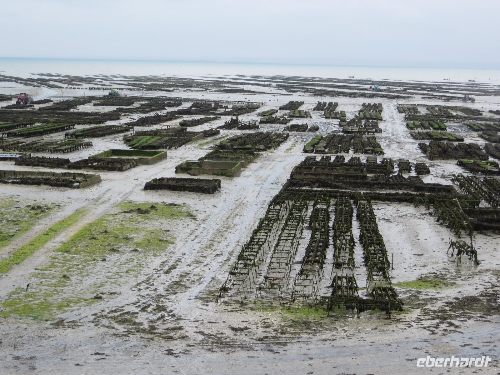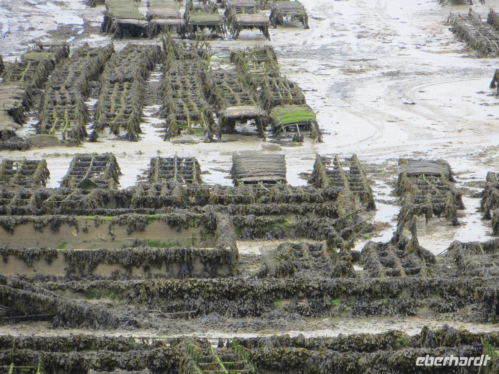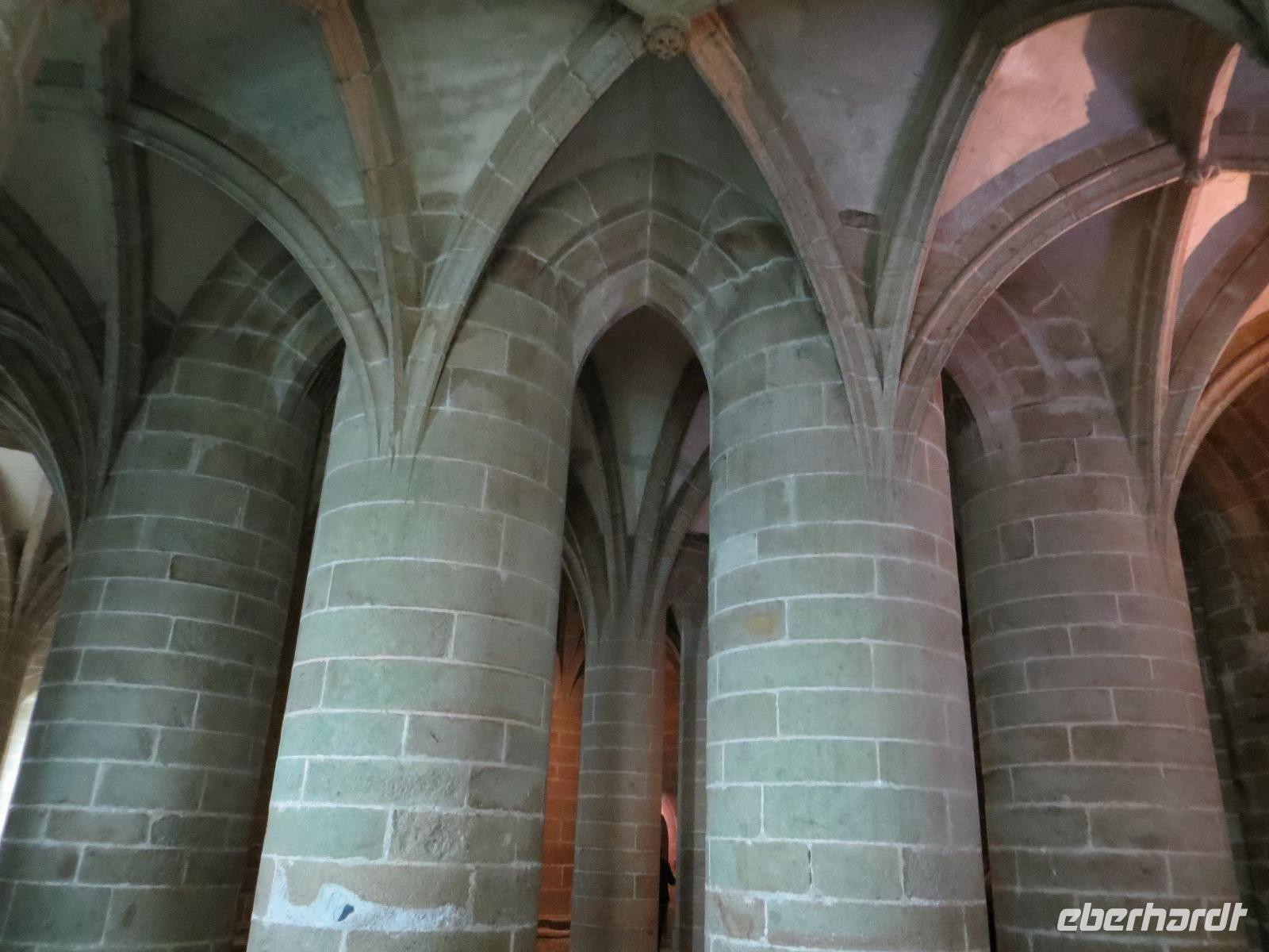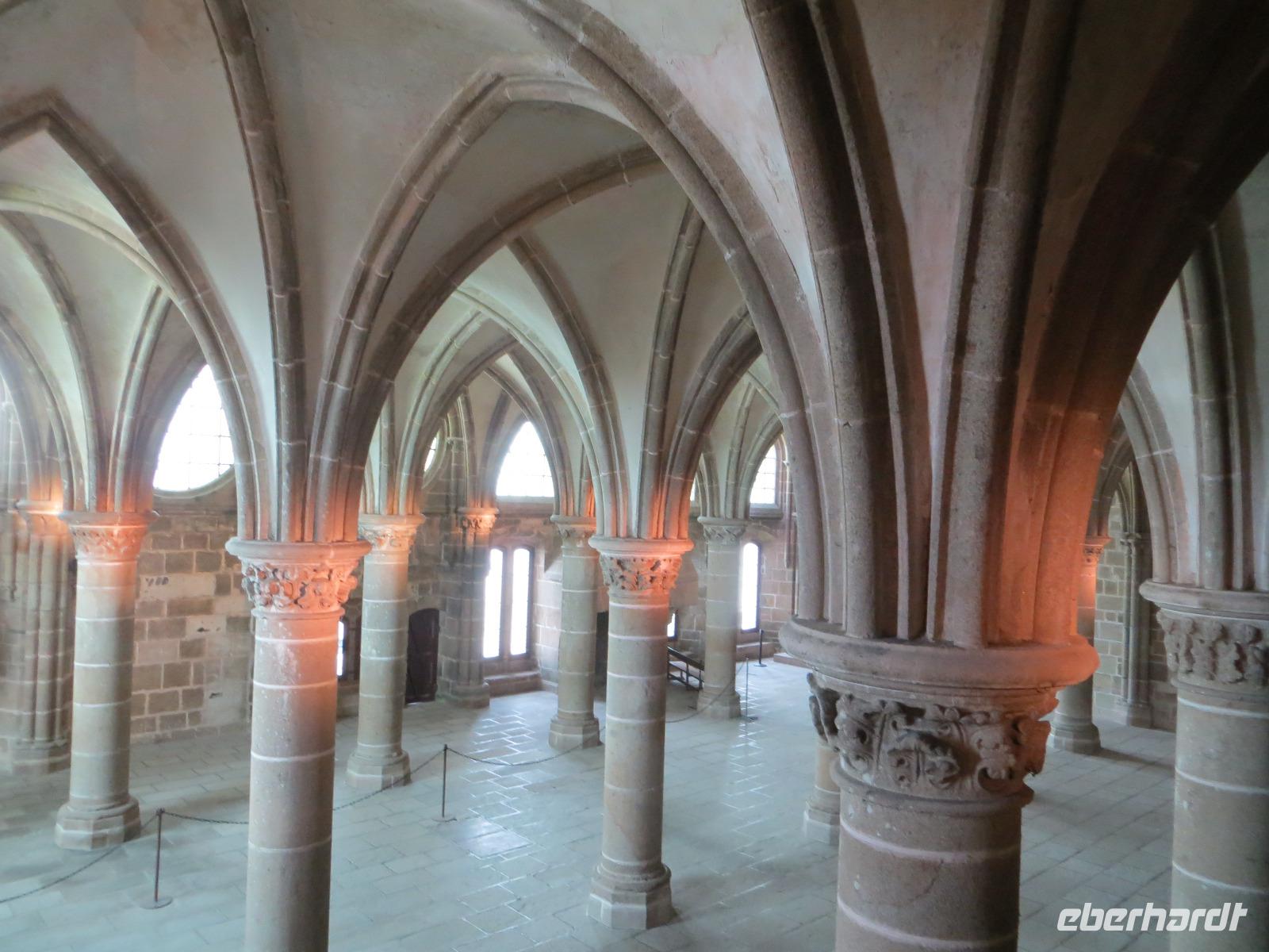 Da die versandende Fläche rund um den Granitfelsen wasserführender gestaltet wird, fährt der Transferbus nun über einen Damm und auf einer gewundenen Fahrbahn auf Stelzen, durch die nun das Wasser bei Flut fließen kann. Nach einigen Fußwegminuten, Toilettenpause und Shuttlebusfahrt stehen wir am Tor der Bürgerwehr - heute steht Gendarmerie hier: es ist Ausnahmezustand in Frankreich, was wir meist doch völlig augeblendet haben. Durch das Tor des Königs geht es wie einst Millionen Pilgern und heut Touristen durch die Große Straße, dann Treppen hinauf, vorbei an Fast-Food und Souvenirs zur Abtei. Vorher erheischen wir noch einen Blick in die Räume von Mutter Poulard, die einst für Pilger hier Omelett bereitete; heute gibt's auch noch dies nach alten Rezepten aber zu neuen Preisen. Mit einem Audioguide in bester deutscher Sprache ausgerüstet, konnte sich dann jeder individuell die Säle, das Refraktorium und die Treppe und Terrasse erschließen, bevor er nach gut einer Stunde den Almosensaal erreichte. Nach der Besichtigung einer der ersten UNESCO-Weltkulturerbestätten und doch reichlich Freizeit ging es mit dem Bus durch Polder nach Cancale - erste Adresse der Gourmets für frische Austern. Auch wir probierten und spülten mit einem Schluck Cidre nach. Zurück nach St. Malo, bummelten wir in alten Gassen und auf den Remparts, der Stadtbefestigung mit tollen Aussichten in die Gassen der Stadt, in Wohnzimmer und auf das Meer. Einige schlenderten bei Ebbe über die weiten Sandflächen direkt neben der Uferstraße von St. Malo zum Hotel. Nach dem Abendessen versuchten es gar zwei Gäste mit dem Anbaden ...