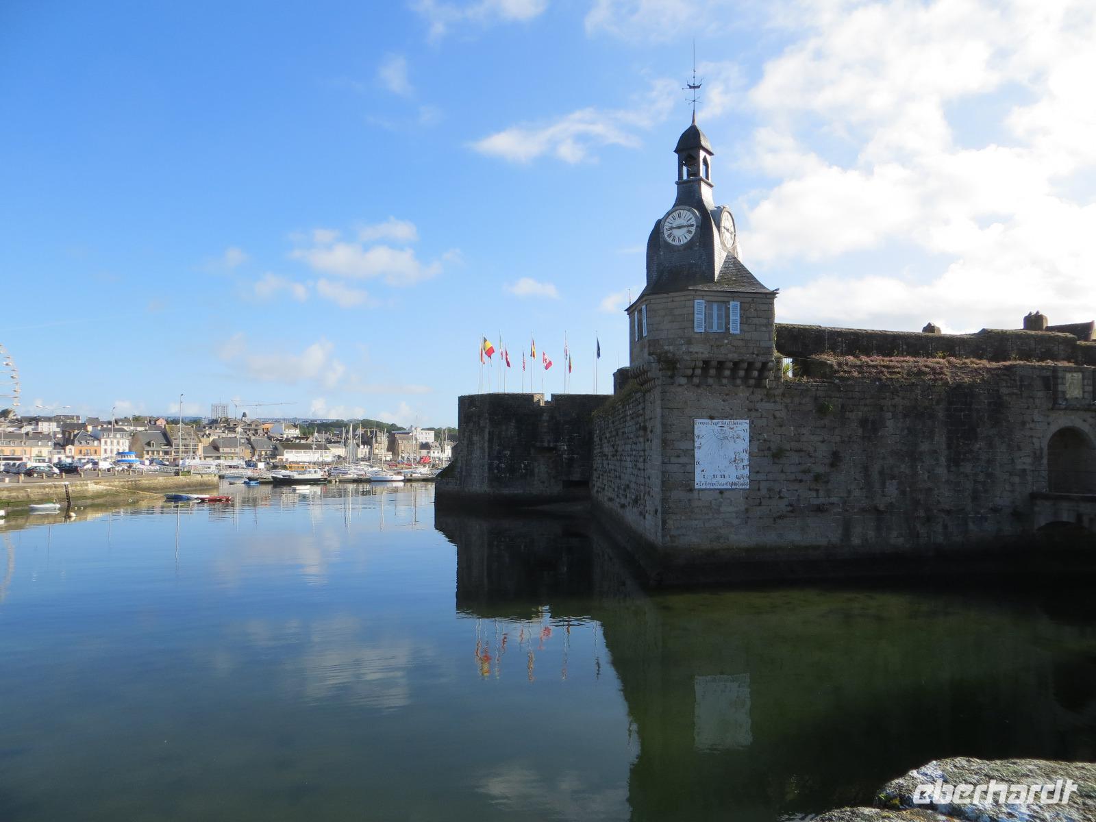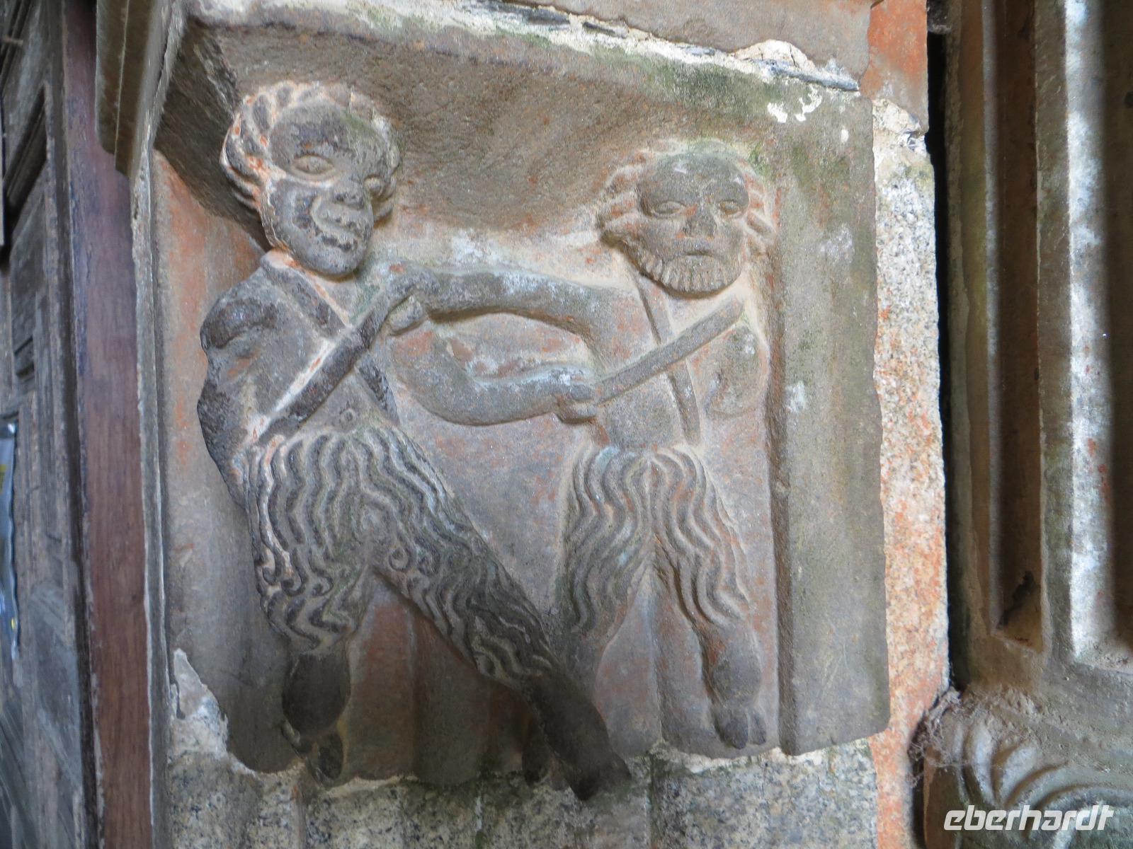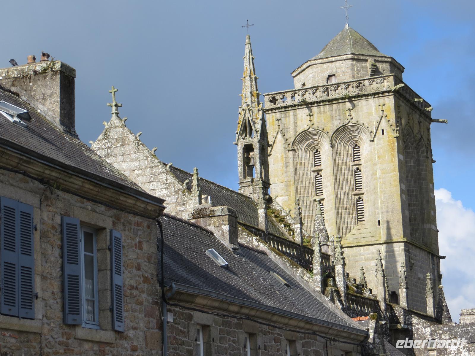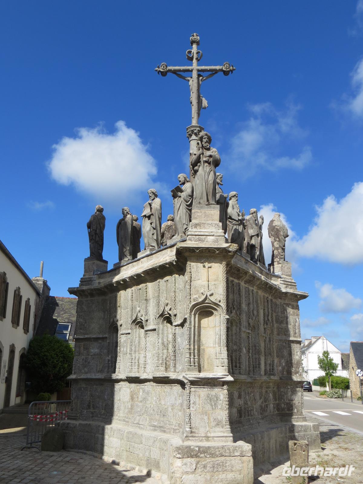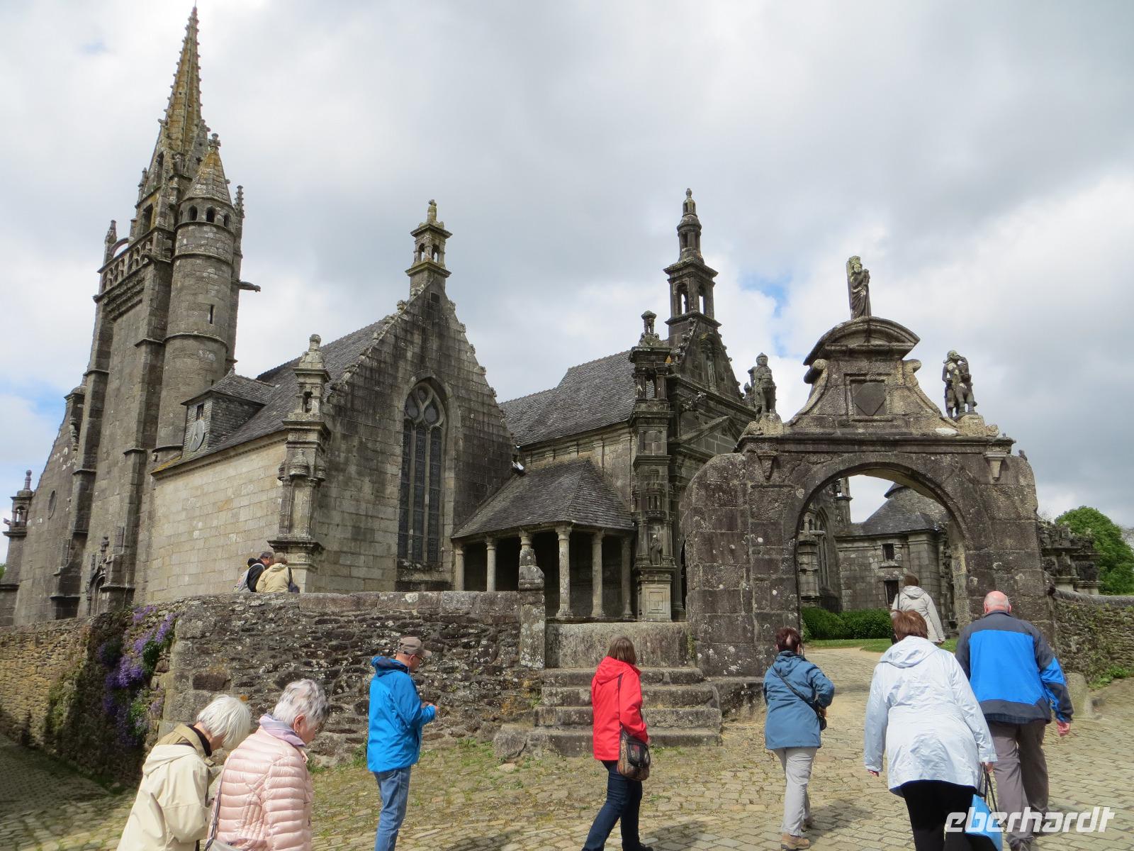 Heute ging es richtig durch die Bretagne von St. Malo zunächst an der Nordküste entlang und später querend im Finistere nach Quimper an der Südküste. Zunächst hielten wir - genau zur Richtungsänderung der Turbinen - am Gezeitenkraftwerk von Rance und diskutierten ein wenig die Möglichkeiten und Grenzen alternativer Energiegewinnung. An Küstenorten wie Dinard vorbei fuhren wir Richtung Cap Frehel, wo wir entlang der Steilküste durch Erika und Ginster zur Capspitze bummelten. Nach der ersten Begegnung mit der Steilküste und dem Meer der Smaragdküste, die bei grauem Wetter eher nicht smaragd strahlte, zog es uns nach Ploumanac'h, dem touristischen Hauptort an der Rosa-Granit-Küste. Durch ein leicht bewältigbares Wegesystem bummelten wir vorbei an den riesigen, von Wind und Wellen geformten Gesteinsbrocken. Mitunter kam sogar die Sonne heraus. Unsere Weiterfahrt durch die ländliche Bretagne führte uns nach Guimillau. Im abgeschlossenen Pfarrbezirk des kleinen Ortes befindet sich einer der bedeutendsten Kalvarienberge Frankreichs. Mehr als zweihundert Figuren stellen das Leben Jesu und seinen letzten Gang auf Golgata dar. Während sich Reisebücher vorrangig auf den Kalvarienberg beschreiben stürzen, wird mitunter die Kirche kaum erwähnt. Sie stammt auch aus der Zeit der französischen Rennaissance und bereits die feinen Figuren am Portal faszinieren. Vierhundert Jahre alte Taufbecken, Altarbilder, die Kanzel und eine immerhin dreihundert Jahre alte Orgel voller Schnitzerein am Prospekt sind ein unerwartetes Kunstwerk in einem Dorf mit kaum eintausend Einwohnern. Die Einfahrt nach Quimper haben wir uns wohl etwas schwerer als erforderlich gemacht und dann war vauch noch die Straße am Hotel gesperrt. Bdreitwillig rollten alle Gäste Ihre Koffer die zweihundert Meter zum Hotel, nicht weit vom Zusammenfluss („Kemper") von Odet und Steir. Mancher bummelte nach dem Abendessen noch in das nahe gelegene Stadtzentrum.