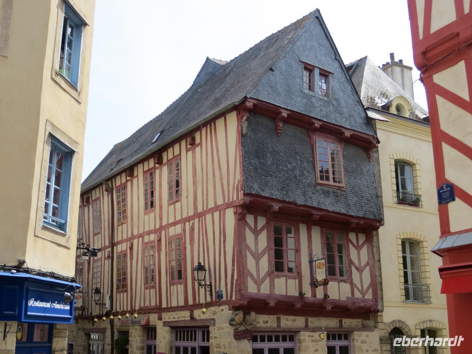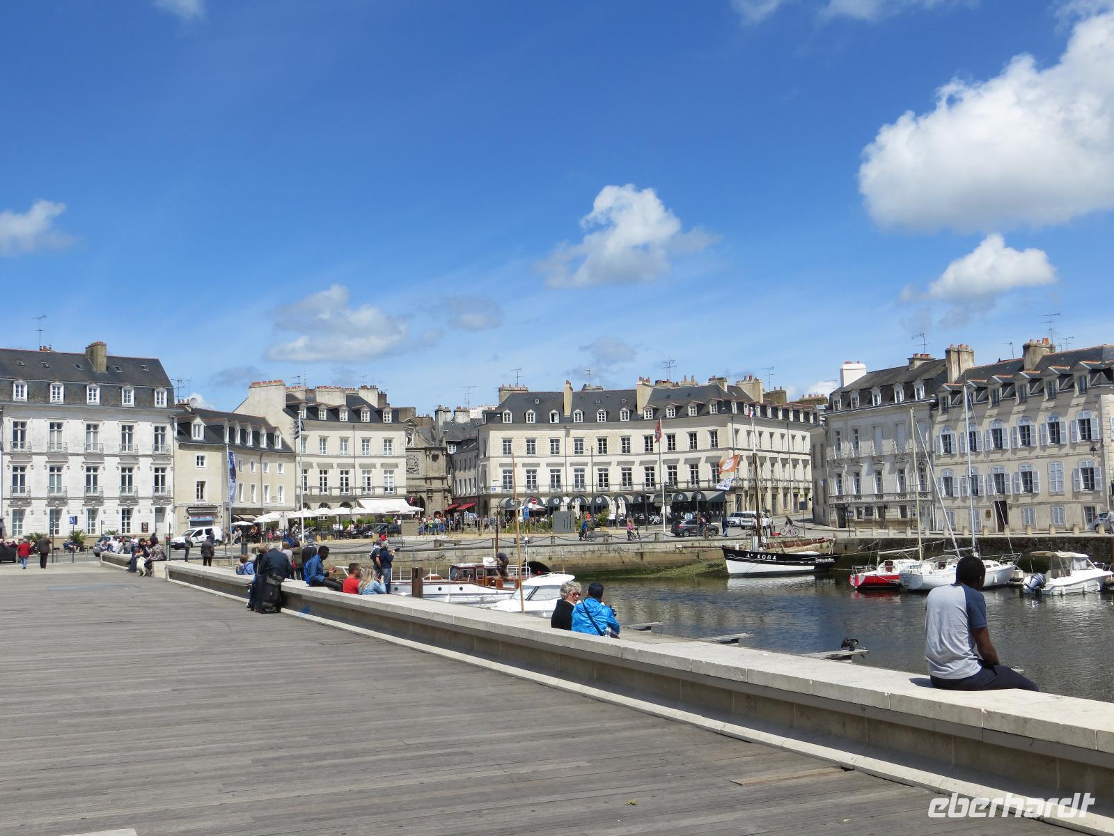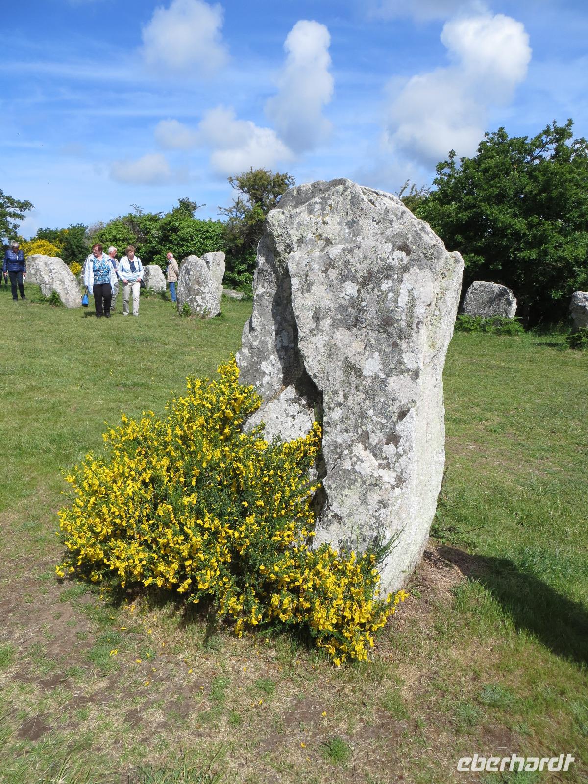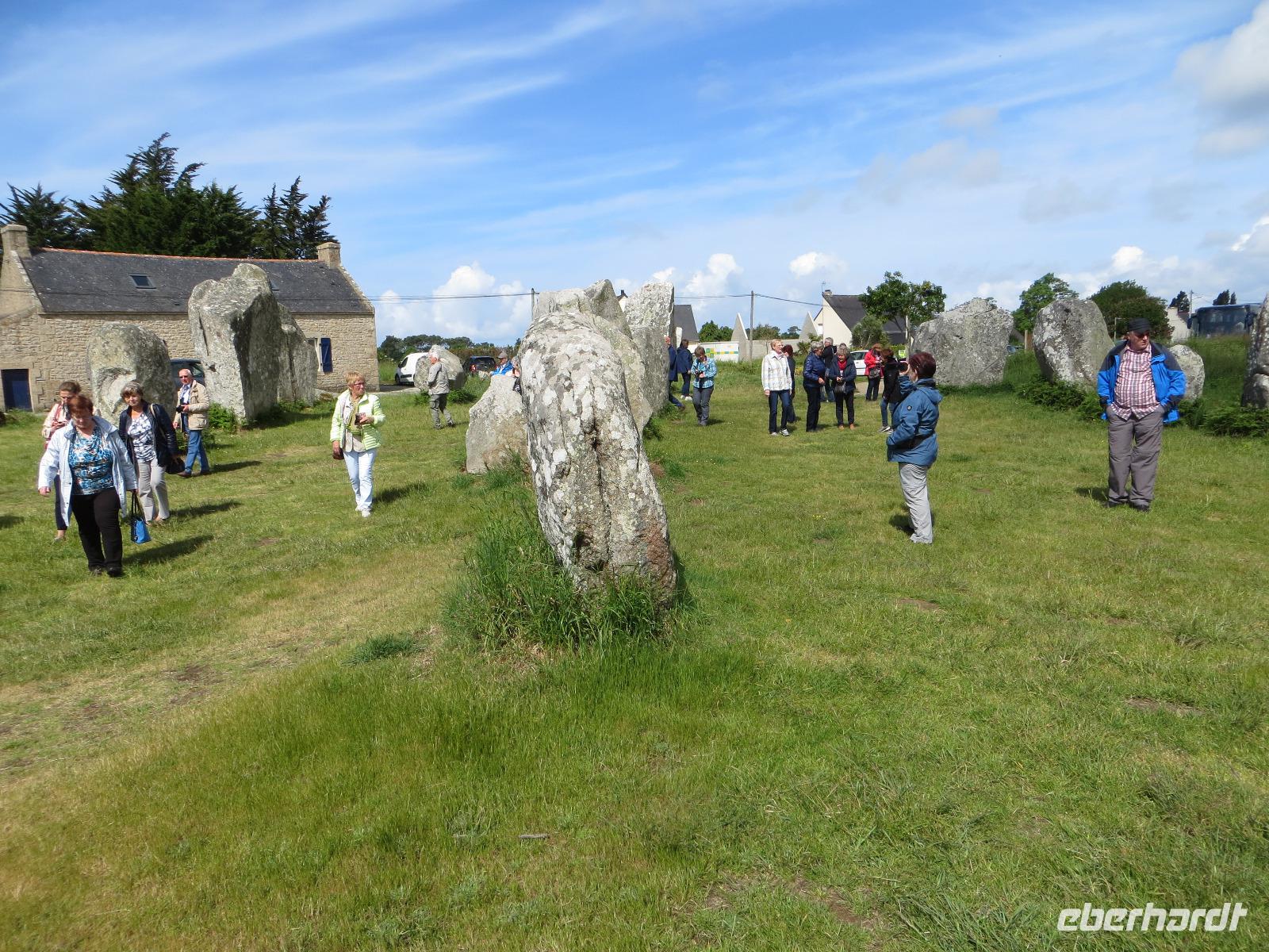 Am frühen Vormittag erreichten wir den Fischerort Concarneau mit seiner einst geschlossenen Stadt, einer Altstadt im Festungsring auf einer Halbinsel im Meer. Ohne Touristen und noch mit geschlossenen Geschäften hat der Ort durchaus seinen Reiz, weil man die ursprüngliche Bausubstanz viel besser erkennen kann als im Gewimmel von Touristen und Auslagen. Auf üblichem Weg durch die Altstadt erreichten wir das Weintor, erheischten Fotos an der Außenmauer voller Blüten und stiegen auf den Ausblick an der Festungsmauer. Bei lockerer Bewölkung fuhren wir weiter an die Südküste der Bretagne Richtung Carnac. Die Ortsbezeichnung gründet sich auf dem englischen Wort carns für Steine. Vor mehr als fünftausend Jahren stellten hier die Menschen teils behauene Findlinge auf und richteten sie in parallelen Reihen aus. So sind heut noch sechs der sogenannte Menhirfelder nördlich von Carnac mit je ca. 950 - 1150 Steinen zu besichtigen. Im bereits vor Carnac liegenden Feld bei Erdeven kann man sogar zwischen den Steinen gehen und entdeckt Dolmen von fünf bis sieben Metern Höhe, umgeben von Eichenbäumen mit Vogelgezwitscher. So hatten wir ein prächtiges Naturerlebnis während unser Fahrer Holger die Küchenelektrik reparierte. Am zeitigen Nachmittag erreichten wir Vannes, checkten im Hotel ein und starteten zum Stadtrundgang mit Friedhelm, dem „bretonischen Eroberer", der uns mit häufigen Fragen unsere Unwissenheit demonstrieren wollte oder seinen Kindern - in Begleitung zeigen - wollte, was er für ein toller Guide, Unternehmer, Buchautor und natürlich Bretone sei. Am Alten Hafen startend, zog es uns durch das Hafentor, in den doppelwandigen Stadtmauerring - heut eine blühende Gartenanlage nach französischer Gartenarchitektur - an der Waschstelle vorbei und dann hinauf über den Platz der Ritterturniere zur Kathedrale. Nach sechzehn Uhr war Zeit für individuelles Bummeln - leider war die Stadt am Sonntagnachmittag doch recht verweist, aber wer suchte, der fand auch ein Eis oder gar mehr.