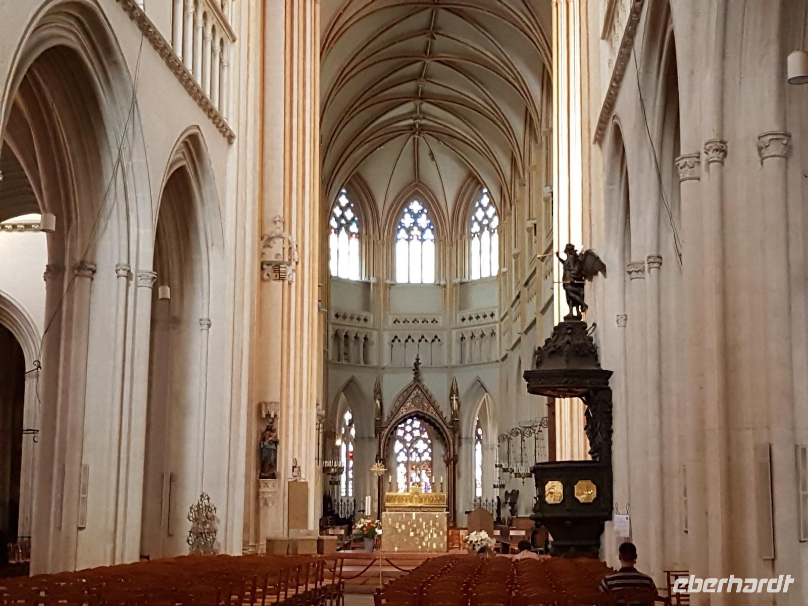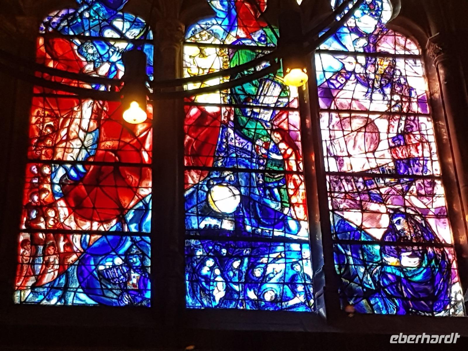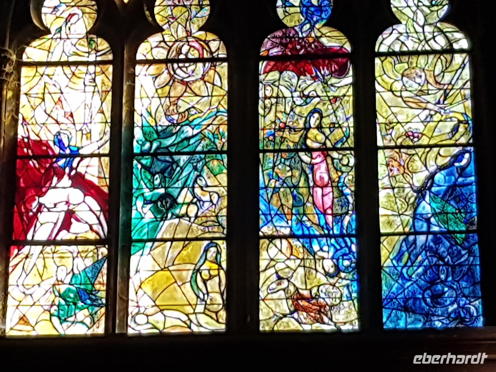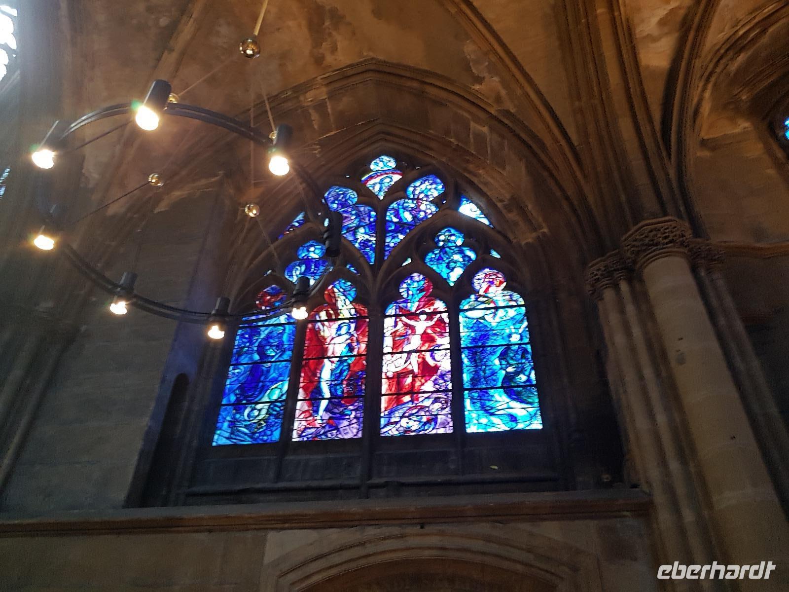 Bei schönem Sommerwetter begann am frühen Sonntagmorgen unsere Studienreise in die Normandie und Bretagne mit unseren ersten Reisengästen am Dresdner Flughafen. Später begrüßten wir weitere Reisegäste an den Zustiegsorten Chemnitz-Mitte, Raststätte Teufelstal, Jena-Zentrum und Neudietendorf. Nach dem Fahrerwechsel an der Raststätte Teufelstal fuhr uns unser Busfahrer Gerald Hohlfeld auf den Autobahnen A 4 und A 6 flott und sicher durch Hessen und Rheinlandpfalz zum Autohof bei Grünstadt, wo unsere letzten Gäste zustiegen. Da sich der Zubringer aus Heilbronn jedoch um ca. 1 ½ Stunden verspätet hatte, ergab sich für uns eine ungeplante Wartezeit. Dann ging es in flotten Tempo durch das Saarland, über die deutsch-französische Grenze nach Metz, die Hauptstadt der französischen Region Lorraine (dt. Lothringen). Eine halbe Stunde vor ihrer Schließung konnten wir noch die Kathedrale St. Etienne besichtigen, die 1220 begonnen wurde und das dritthöchste Kirchengewölbe Frankreichs besitzt. Daneben ist die Kathedrale berühmt für ihren reichen Schatz an Glasfensterzyklen von 13. bis zum 20. Jahrhundert. Besonders prachtvoll wirkten bei dem warmen Nachmittagslicht gerade die drei Glasfenster von Marc Chagalls im nördlichen Querschiff und im Chorumgang.