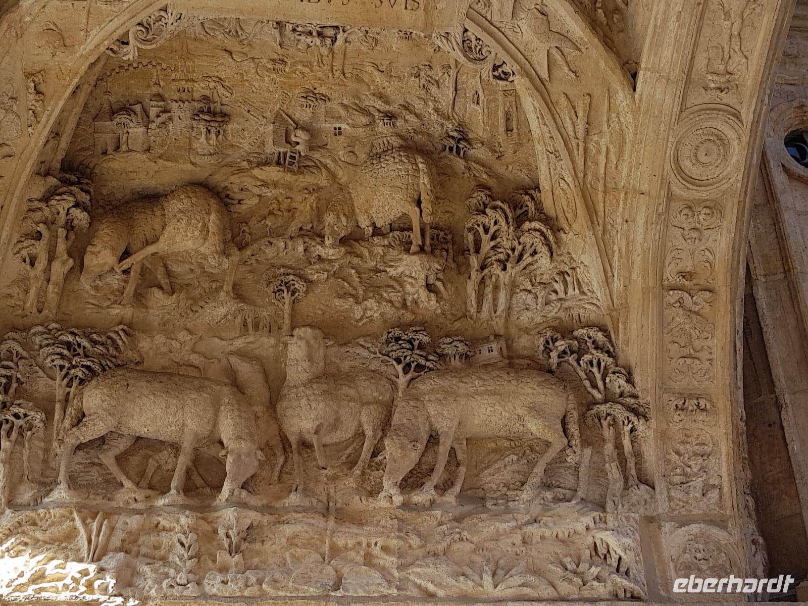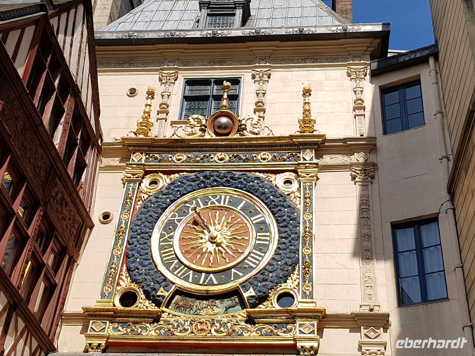 Der heutige Vormittag sollt ganz der malerischen Altstadt von Rouen, der alten Hauptstadt der Normandie, gehören. So verließen wir am morgen das Hotel und fuhren in Richtung der Altstadt. Dort führten uns unsere beiden örtlichen Stadtführerinen Anne Robin und Catherine Brandon in zwei Gruppen. Sie brachten uns die Geschichte dieser altehrwürdigen Stadt näher, zeigten uns die nicht zuletzt durch Claude Monet's Gemäldezyklus so berühmte Kathedrale Notre-Dame und machte uns auf Besonderheiten der Fachwerkbauten in Rouen aufmerksam. Wir entdeckten mit ihnen viele malerische Ecken der Altstadt und sahen den alten Markt mit der 1979 erbauten Markhalle sowie der Jeanne-d'Arc geweihten Kirche. Ihr größter Schatz ist ein wunderschöner Glasfensterzyklus, der aus der 1944 zerstörten Kirche St. Vincent stammte. Neben der Kirche erinnert ein 20 m hohes Kreuz an die Verbrennung Jeanne d'Arcs am 30.5.1431 auf einem an dieser Stelle aufgerichteten Scheiterhaufen.