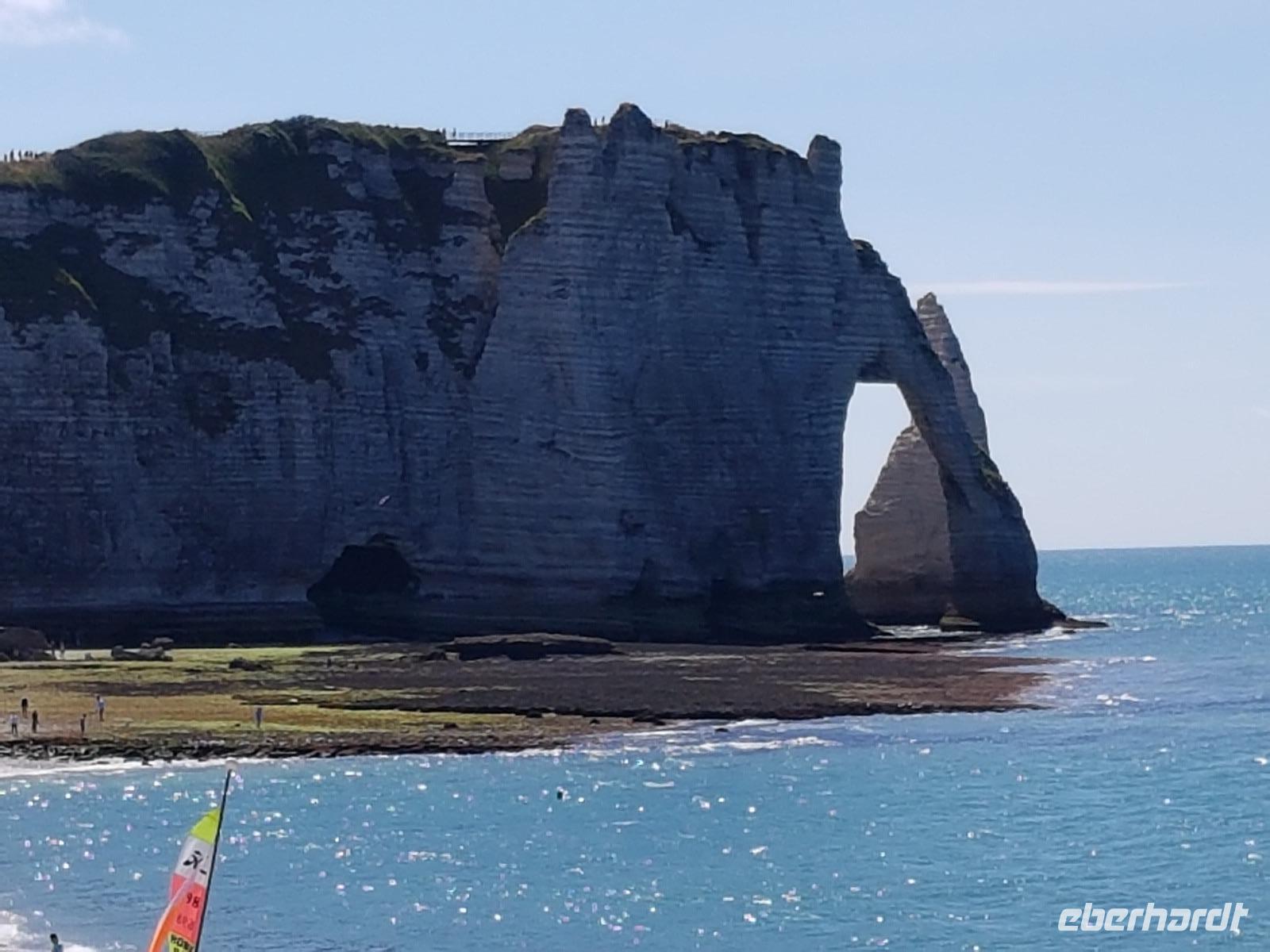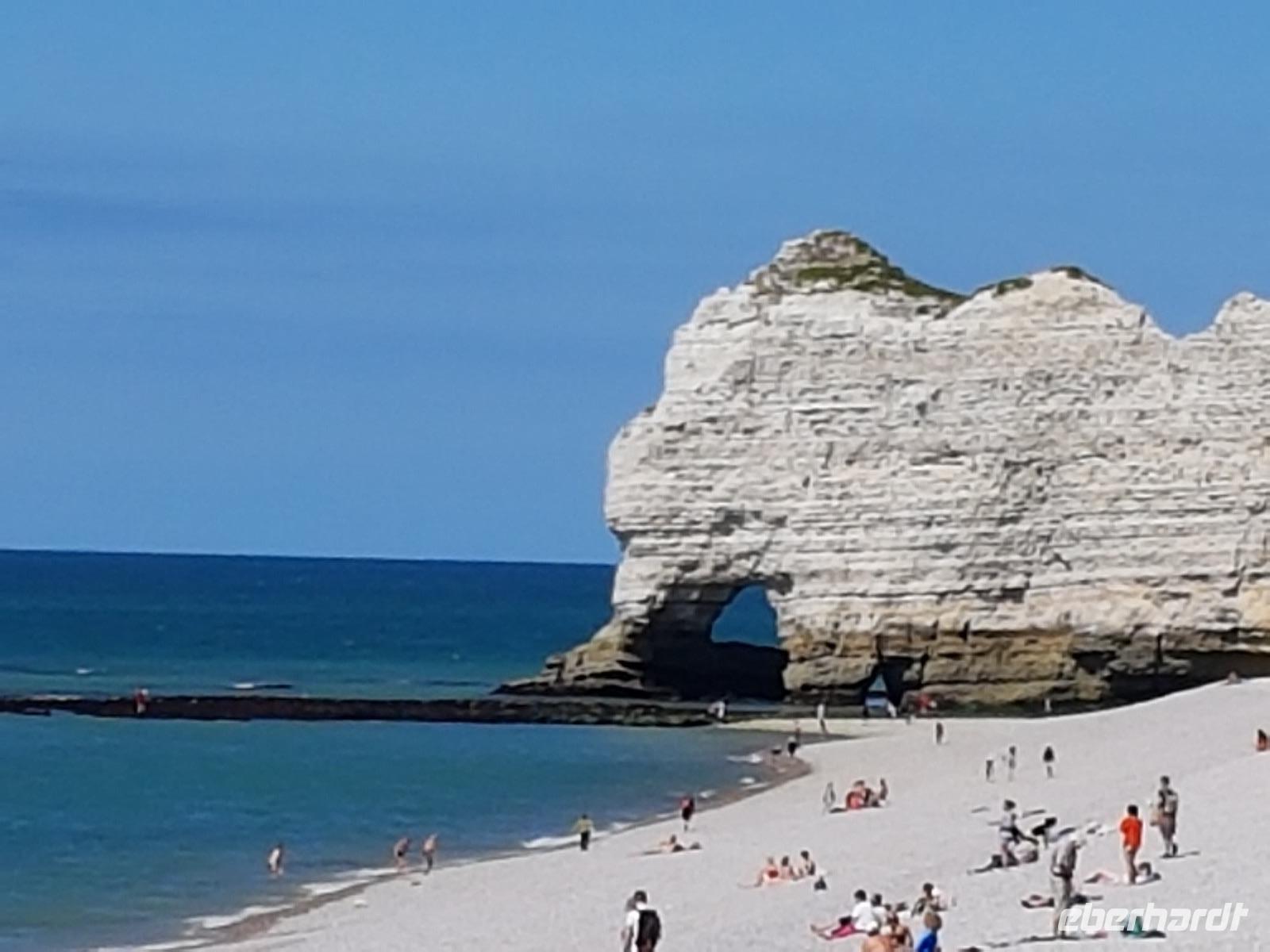 Dann hatten wir Freizeit zu einer Mittagspause bevor es am Nachmittag zur Côte d'Abatre ging. Die Alabasterküste - so wurde dieser Küstenabschnitt seit Jahrhunderten von seinen Bewohnern benannt aufgrund ihrer hellen Kreidefelsen. Bei diesem herrlichem Sonnenwetter wirkte der Farbkontrast zwischen dem dunklen Blau des Meeres, dem lichte Bau des Himmels und der Helligkeit der fast weiß erscheinenden Kreidefelsen einfach faszinierend. Die Felsen mit ihren eingelagerten Feuersteinbändern erhoben sich monumental beiderseits des steinigen Strandes - der "Falaise d'Aval" links und rechts der "Falaise d'Amont". Diese Küste, die schon Generationen von Malern, Fotografen und Schriftstellern fasziniert hatte, bescherte uns bei diesem fabelhaften Wetter einen traumhaften Genuss.