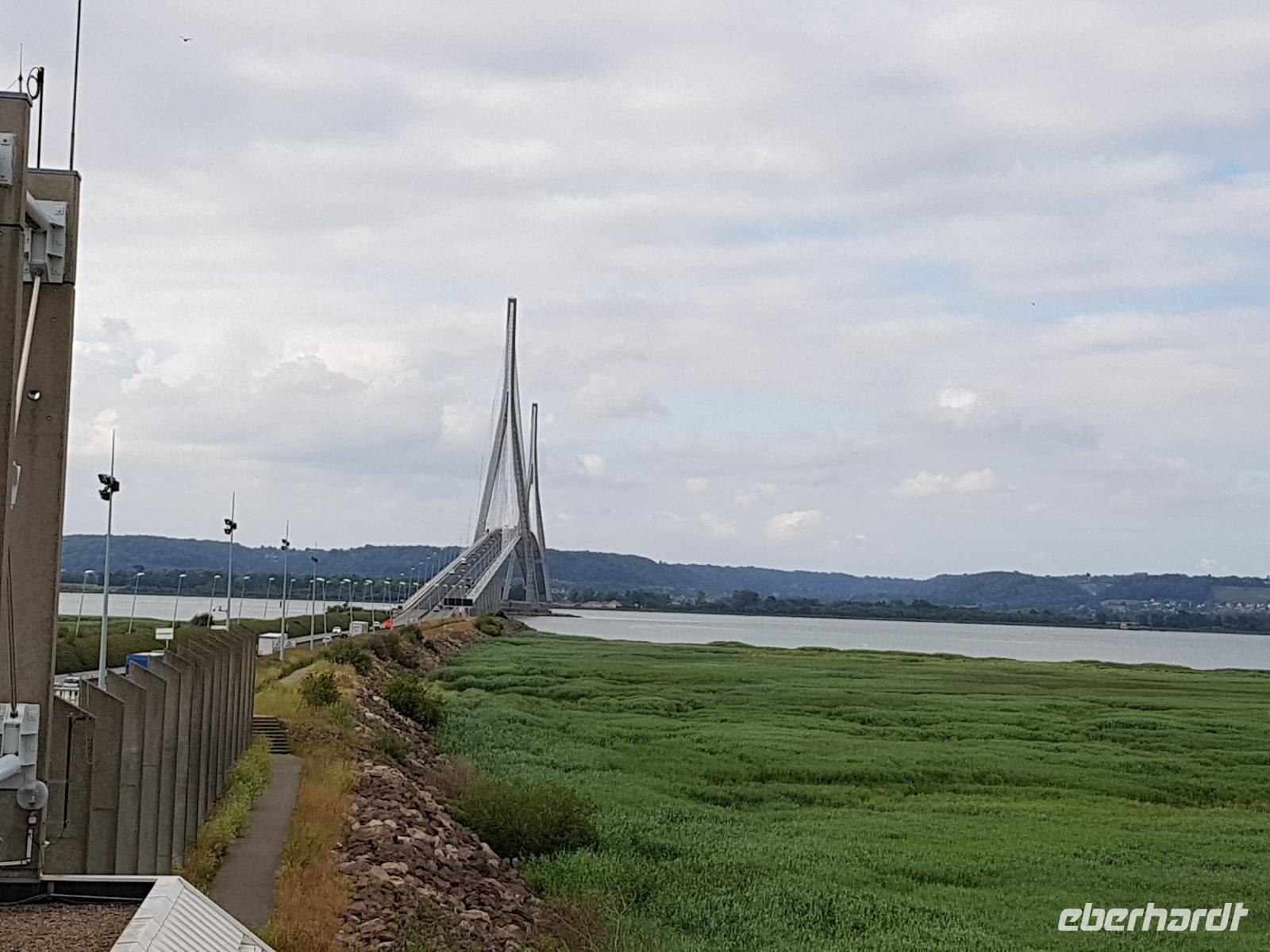 Schon kurz nach unserer Abreise aus Le Havre erlebten wir eine erste große Überraschung: die atemberaubend schöne "Pont de Normandie". Zur Zeit ihrer Errichtung 1988-1994 war sie mit einer Länge von 2.241 Metern und einer Hauptspannweite von 854 Metern die größte Schrägseilbrücke der Welt. Nach einem längeren Fotostopp fuhren wir über die "Pont de Normandie" und waren beeindruckt von der Leichtigkeit und Eleganz dieses genialen Brückenbauwerks.