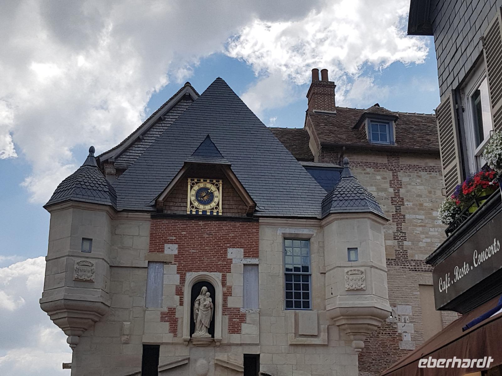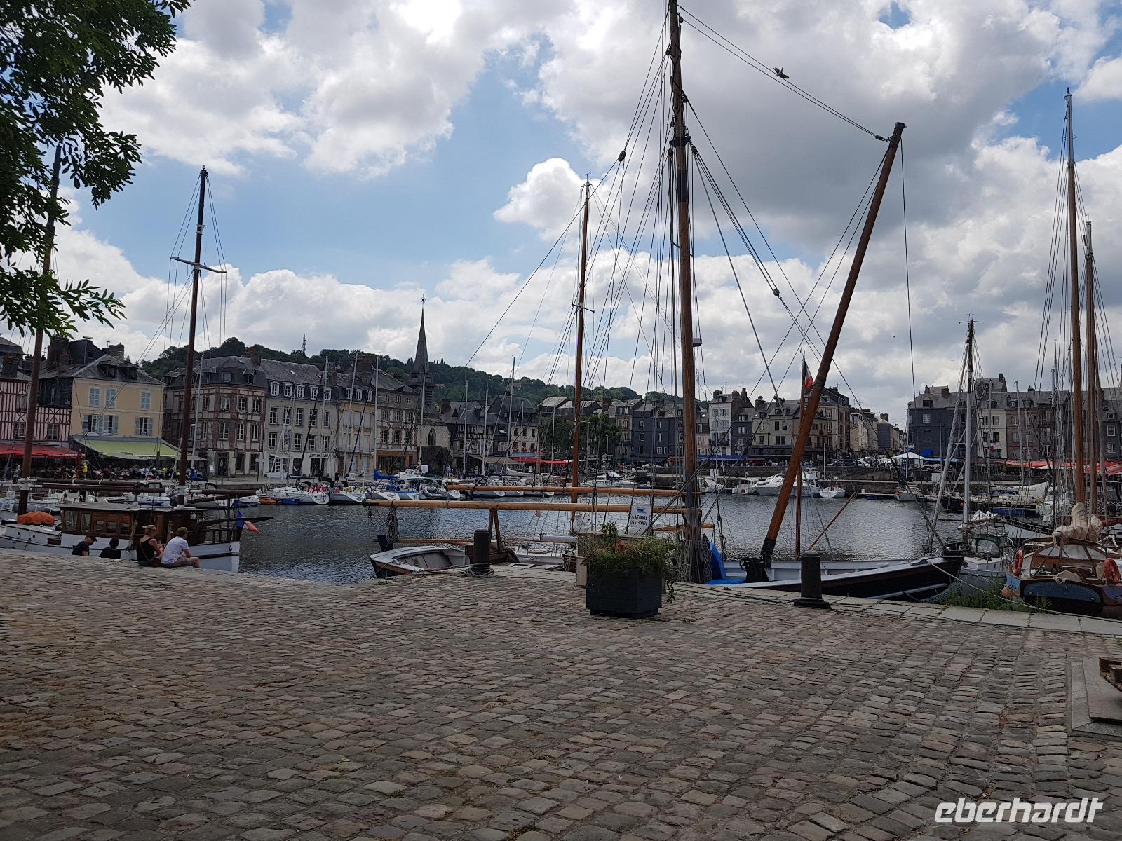 Wenig später gelangten wir in das Pays d'Auge - das malerische Hinterland der Blumenküste. Wir erreichten das Château de Breuil in seiner wunderbaren Parkanlage. Da vor der Führung noch etwas Zeit war, wogen sich einige Reisegäste aus unserer Gruppe auf der seit kurzem eingerichteten Apfelwaage, die einem genau verrät, wie viele hundert Äpfel schwer bzw. leicht man ist. Dann erlebten wir eine fachkundige Führung durch die Calvados-Brennerei und das Lager der Fässer, wo wir zum Abschluss ein Multimediapräsentation über die Herstellung des Calvados sahen. So waren wir auf angenehmste Weise bald recht neugierig auf den Geschmack des Calvados, den wir anschließend kosteten. Beschwingt durch den köstlichen Tropfen fuhren wir nun in das alte Hafenstädtchen Honfleur, von dem einst Kapitäne wie Samuel de Champlain in die Neue Welt aufbrachen. Viele Jahrhunderte lang florierte hier der Überseehandel mit Kanada und Brasilien. Mitte des 19. Jahrhunderts kamen die jungen Künstler aus der Hauptstadt, die sich der frühimpressionistischen Landschaftsmalerei verschrieben hatten und gründeten zusammen mit dem Maler Eugène Boudin in der Ferme Saint-Siméon bei Honfleur eine kleine Künstlerkolonie. Ende des 19. Jahrhunderts sollte der Musiker und Komponist Eric Satie, der berühmteste Sohn der Stadt, das Pariser Musikleben kräftig aufmischen. Wir spazierten zum malerischen Stadtviertel des Alten Hafens und zu der von Schiffszimmermeistern aus Holz errichtete Kirche Ste Chaterine. Hier gab es gerade ein Wochenmarkt, auf dem man besonders leckere Crêpes und bretonische Galettes essen konnte.