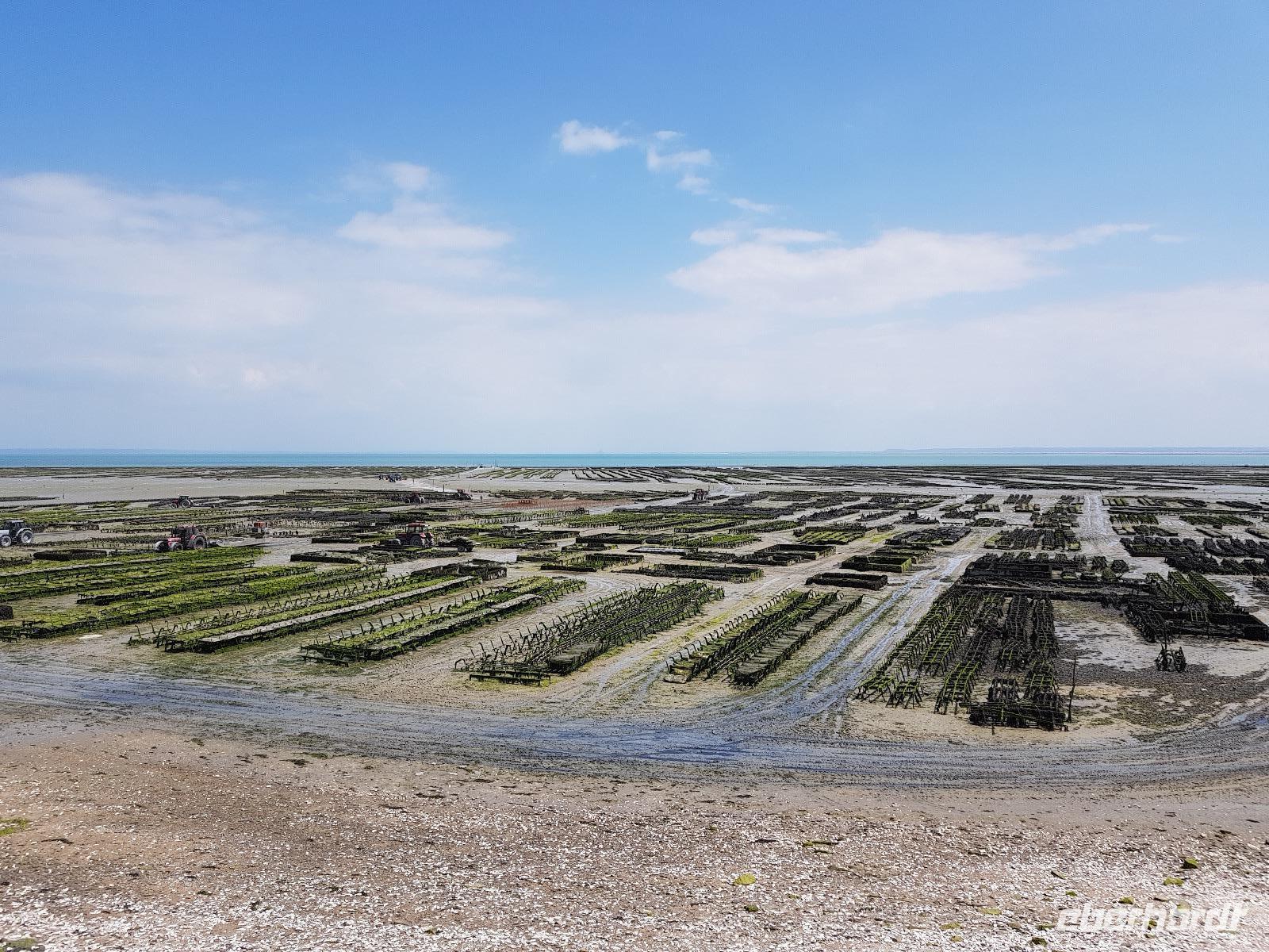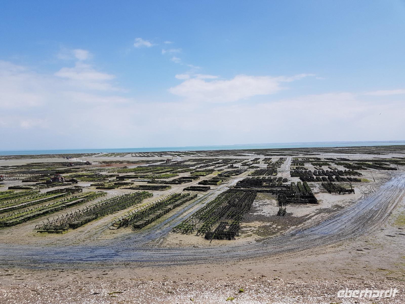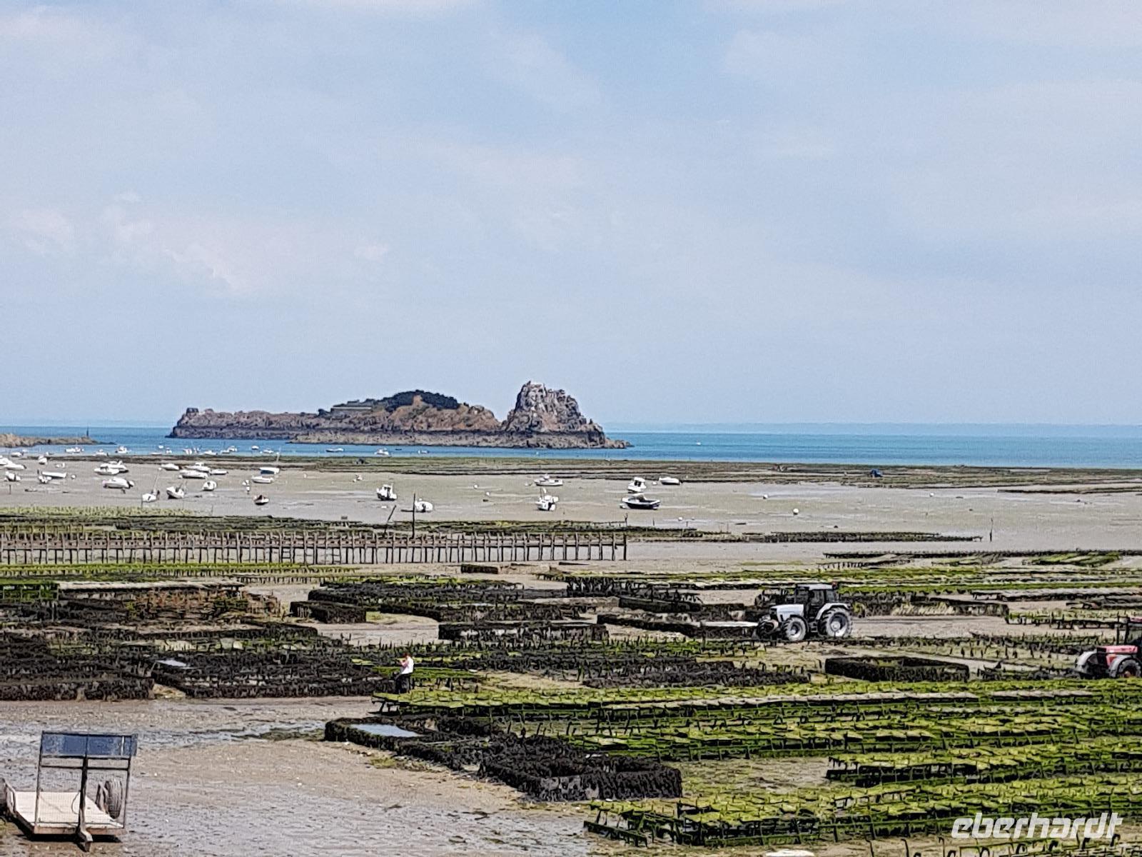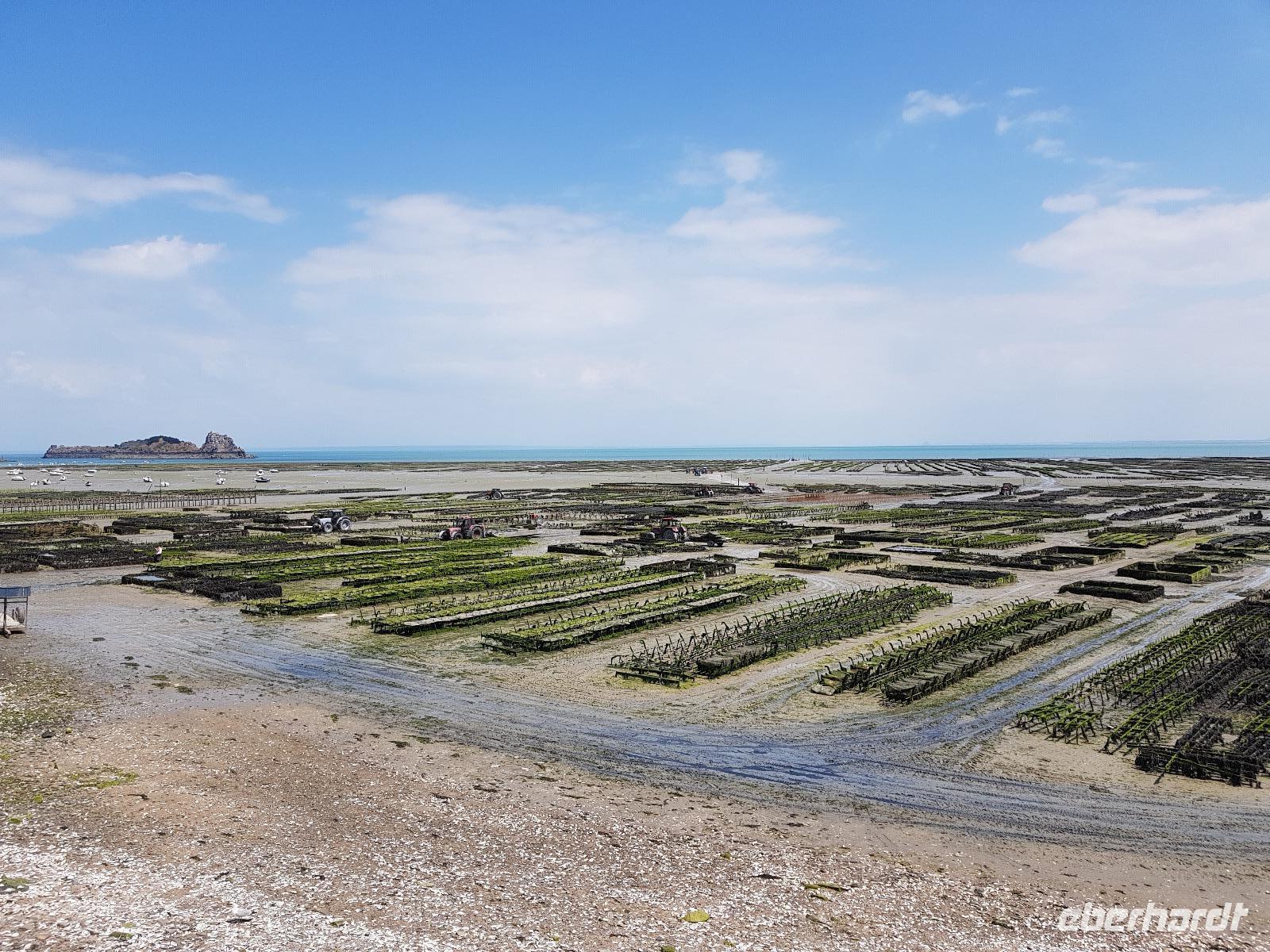 Wir hingegen kehrten dem Abteiberg den Rücken und fuhren zur Austernverkostung nach Cancale, die Aussterhauptstadt in der weiten Bucht des Mont-Saint-Michel. Die Ebbe erlaubte uns, den gesamten Austernpark von der Küste aus zu überblicken. Man konnte wunderbar die Tische mit den darauf gelegten Austerntaschen sehen und die Bewirtschaftung der Anlage verfolgen. Zum Glück hielt auch das Wetter und so konnten wir mit Blick aufs Meer Austern essen so frisch, wie nirgendwo sonst. Sie wurden erst kurz zuvor von den Austernfischern geliefert und seit dem am Strand verkauft. Es gab "Pazifische Felsenaustern" (Huitre creuse) sowie kleinere "Europäische Austern" (Huitre plat bzw. Pied de cheval) mit Zitrone. Dazu gab es Baguette sowie Muskateller- und Chardonnay-Wein. Für manchen von uns war das Essen von Austern eine kulinarische Premiere, für manchen der „Kenner" ein wahrer Genuss.