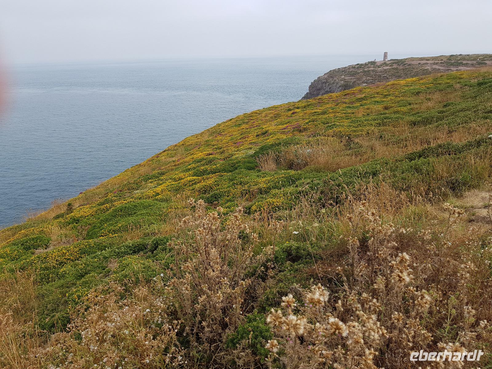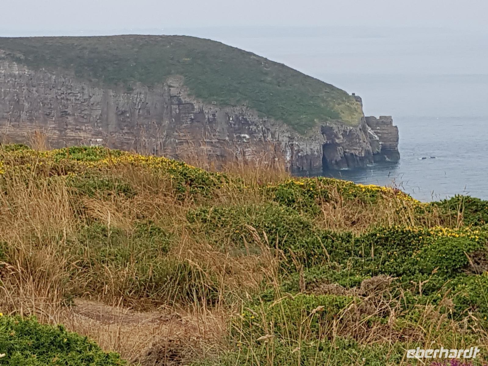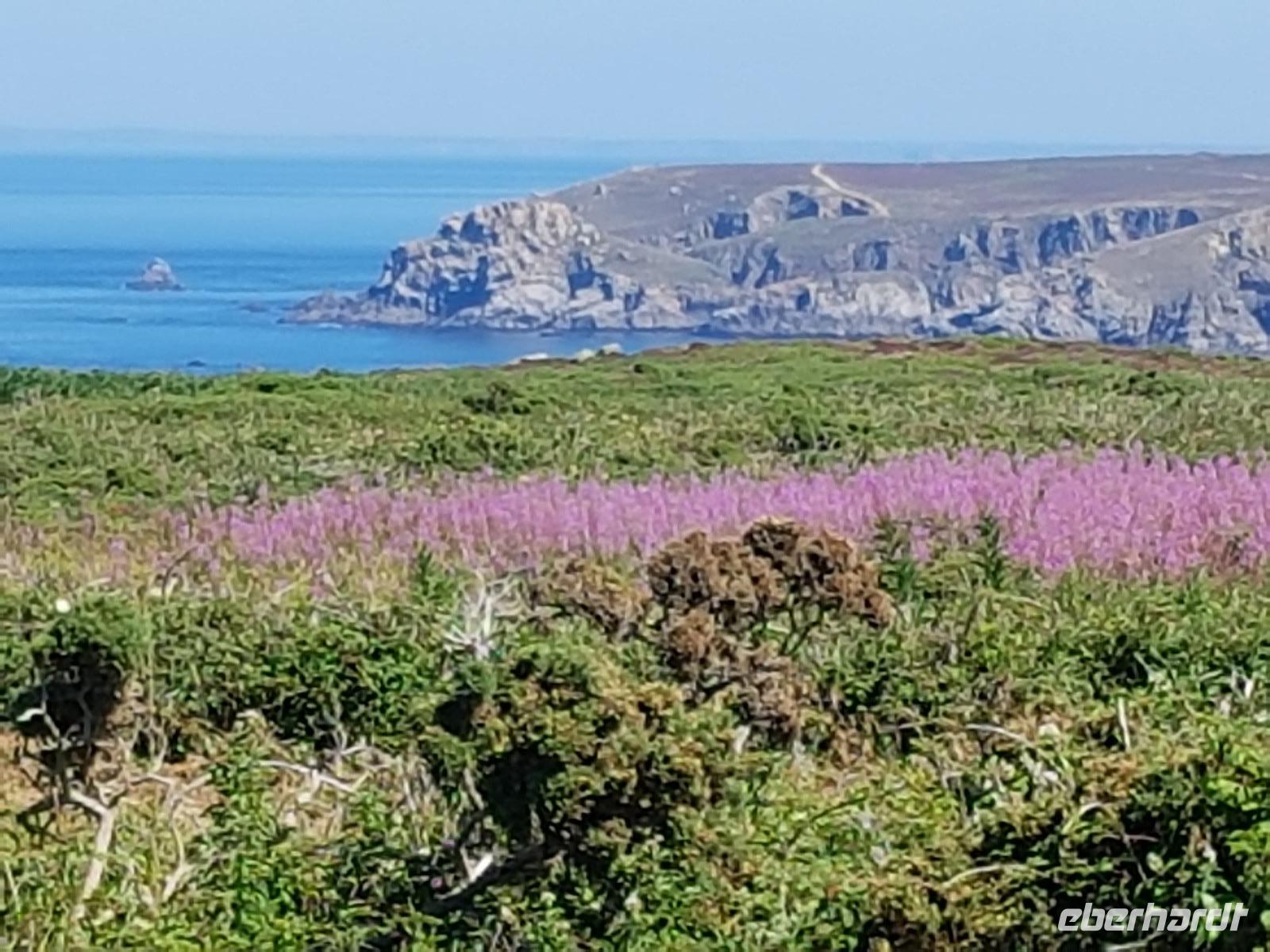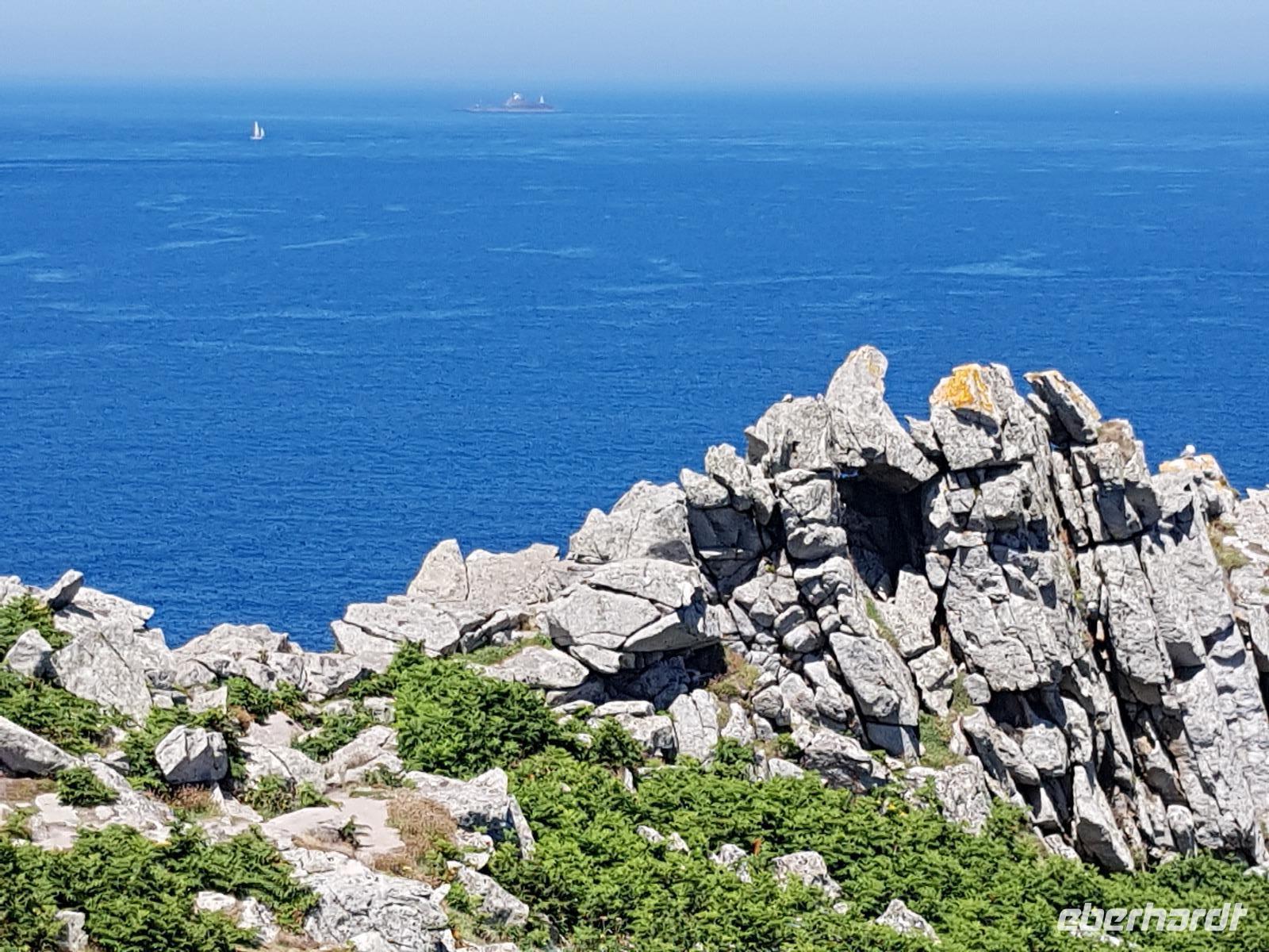 Dann ging es an dem bekannten Seebad Dinard, das gegenüber von San Malo liegt, vorbei zur Smaragdküste, der Côte d'Emmeraude. Hier an der bis zu 70 m hohen Steilküste erwartete uns eine einzigartige Naturszenerie, die wir bei fabelhaften Wetter erlebten durften. Rings um den alten Leuchtturm waren die Steine bedeckt mit gelbem Ginster und der violetten Erika. Über den benachbarten schroffen Felsklippen umkreisten große Möwen kreischend ihre Kolonien. Auch Lummen wurden von einigen Gästen entdeckt.