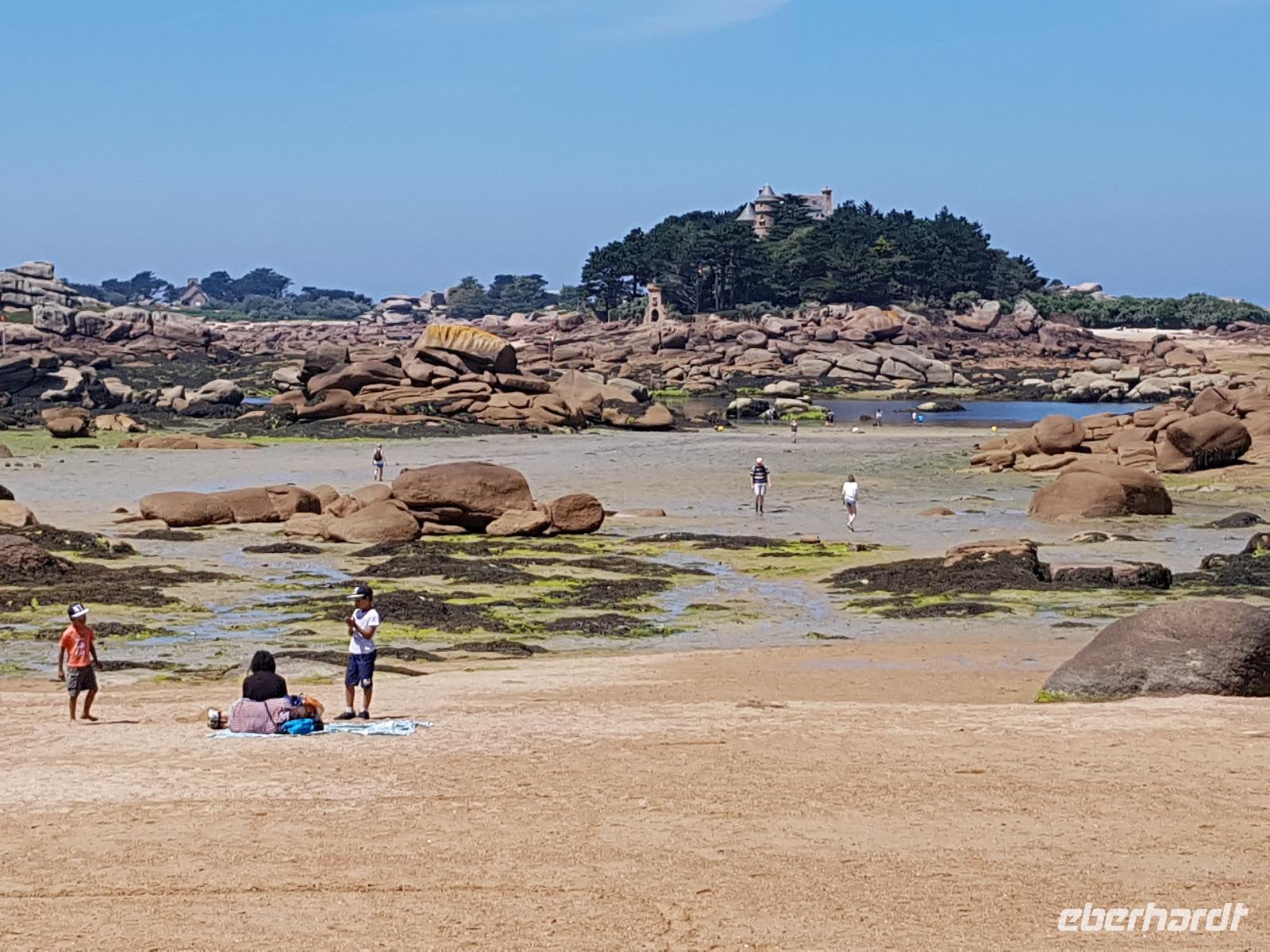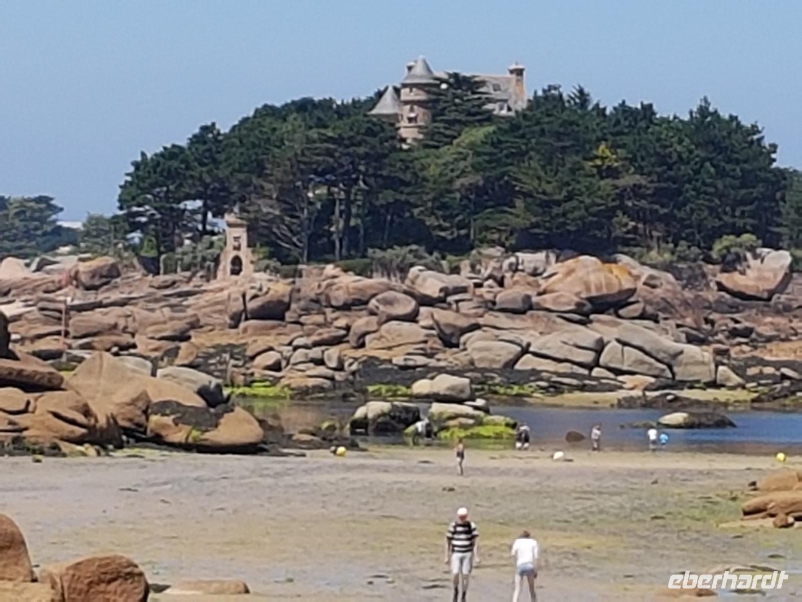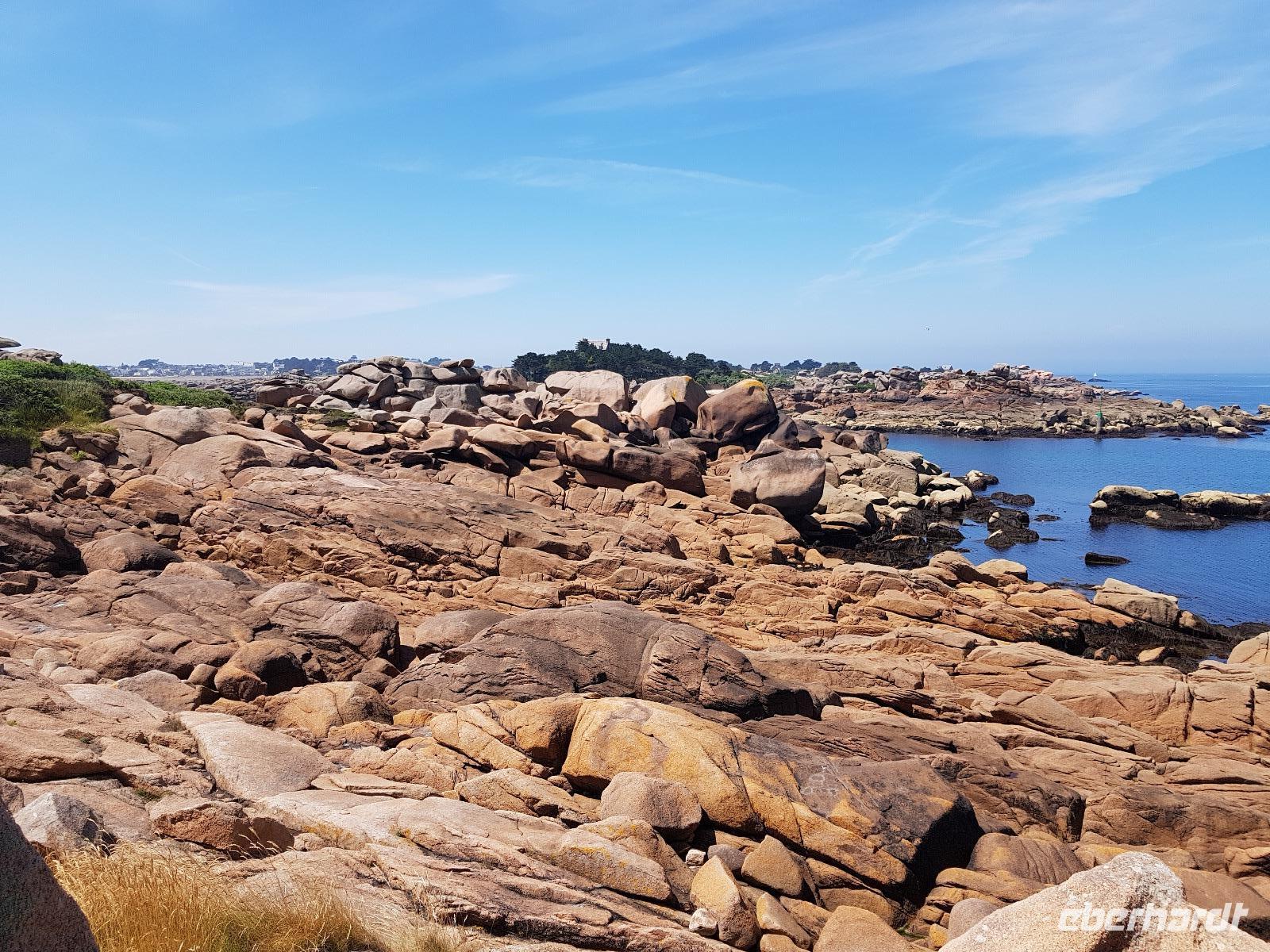 Nach diesem wunderbaren Küstenerlebnis an der Côte d'Emmeraude steuerten wir nun die Granitküste, die Côte d'Granit Rose, an. Nach einer Mittagspause am Bus in Ploumanac'h wanderten wir bei schönstem Sommerwetter auf dem alten Zöllnerpfad an den gigantischen Steinkolossen vorüber, sahen in ihnen Tiere, Köpfe und allerlei Fabelwesen und waren fasziniert von der spektakulären Felsenlandschaft und ihren bizarre Formen.
