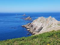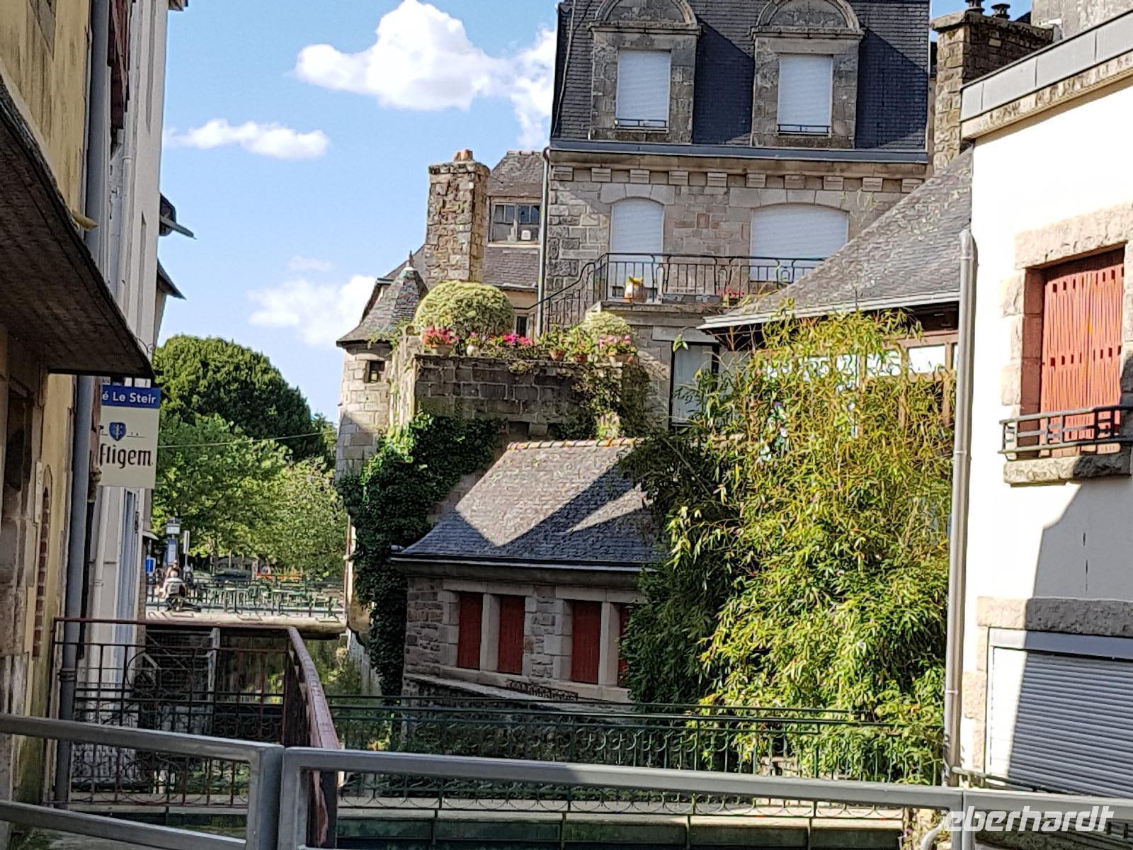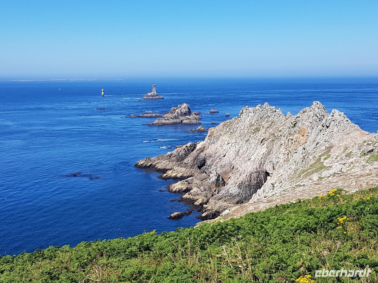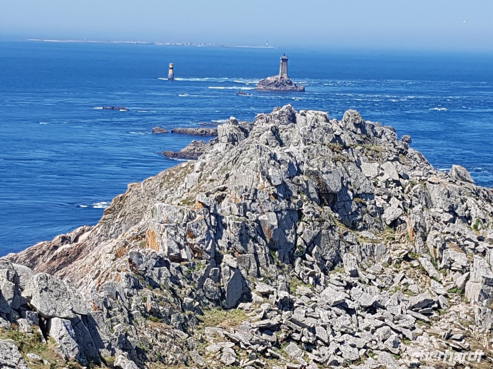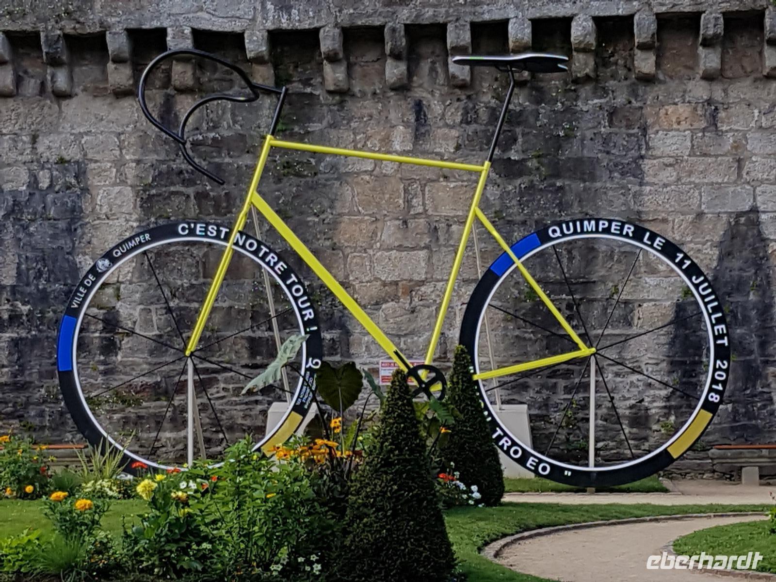 Anschließend ging es am Hafen von Douarnenez und an der Ile Tristan vorbei zum Cap Sizun. Die extrem zugespitzte Landzunge reicht etwa 30 km in den Atlantischen Ozean hinein und trennt die Iroise See im Norden vom Golf von Biskaya im Süden. Nach einem Fotostopp an der Baie des Trépassés, der Bucht der Verschiedenen, erreichten wir den Parkplatz an der Pointe du Raz, dem spektakulären westlichen Ausläufer des Caps. Vom Parkplatz führte ein ca. 15 minütiger Fußweg zur Pointe du Raz, der aber auch zu einem kleinen Preis mit einem Shuttel bewältigt werden konnte. Die durch starken Gezeitenströme und zahlreiche Klippen gebildete Passage an der Pointe du Raz war einst lebensgefährlich für die Schifffahrt. Heute erreichen die Schiffe von Audierne aus in einem großen Bogen die ca. 8 km westlich liegende Ile de Sein. Diese Insel wurde im Juni 1940 geradezu legendär für ihr einzigartiges Engagement zur Befreiung Frankreichs, als sich all ihre männlichen Bewohner im wehrfähigen Alter der „Freien Französischen Marine" anschlossen. Heute bei diesem sonnigen, windstillen Wetter wirkte das Meer ziemlich harmlos. Aber die Sicht war so hervorragend, das man nicht nur die Île de Sein und den entfernteren Leuchtturm Phare de Tévennec sehen sondern sogar die Riffe im Meer vor der Insel deutlich erkennen konnte. Nach diesem großartigen Küstenerlebnis an der Pointe du Raz fuhren wir entlang der südlichen Küste des Cap Sizun zurück nach Quimper. Am Nachmittag hatten wir noch genügend Zeit, um mit Muße die Hauptstadt der Cornouaille mit ihrer Cathédrale Saint Corentin und ihren stimmungsvollen Gassen und Plätzen zu genießen. An der Stadtmauer erinnerte noch eine „Kunstfahrrad" an die Tour de France, die vor drei Tagen durch Quimper ging.