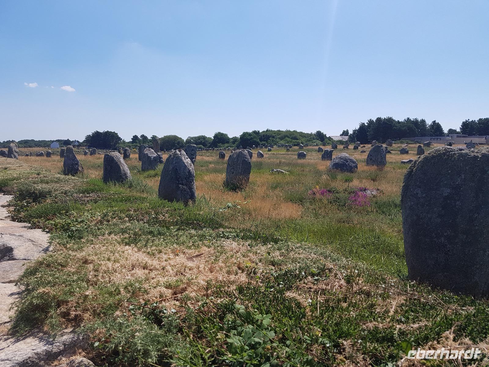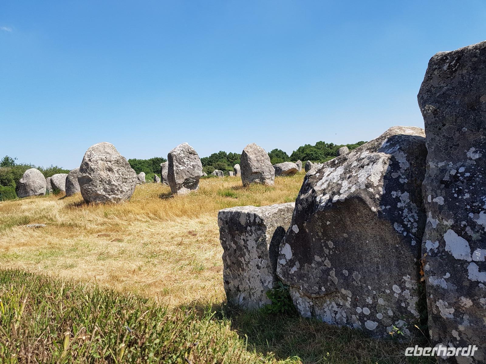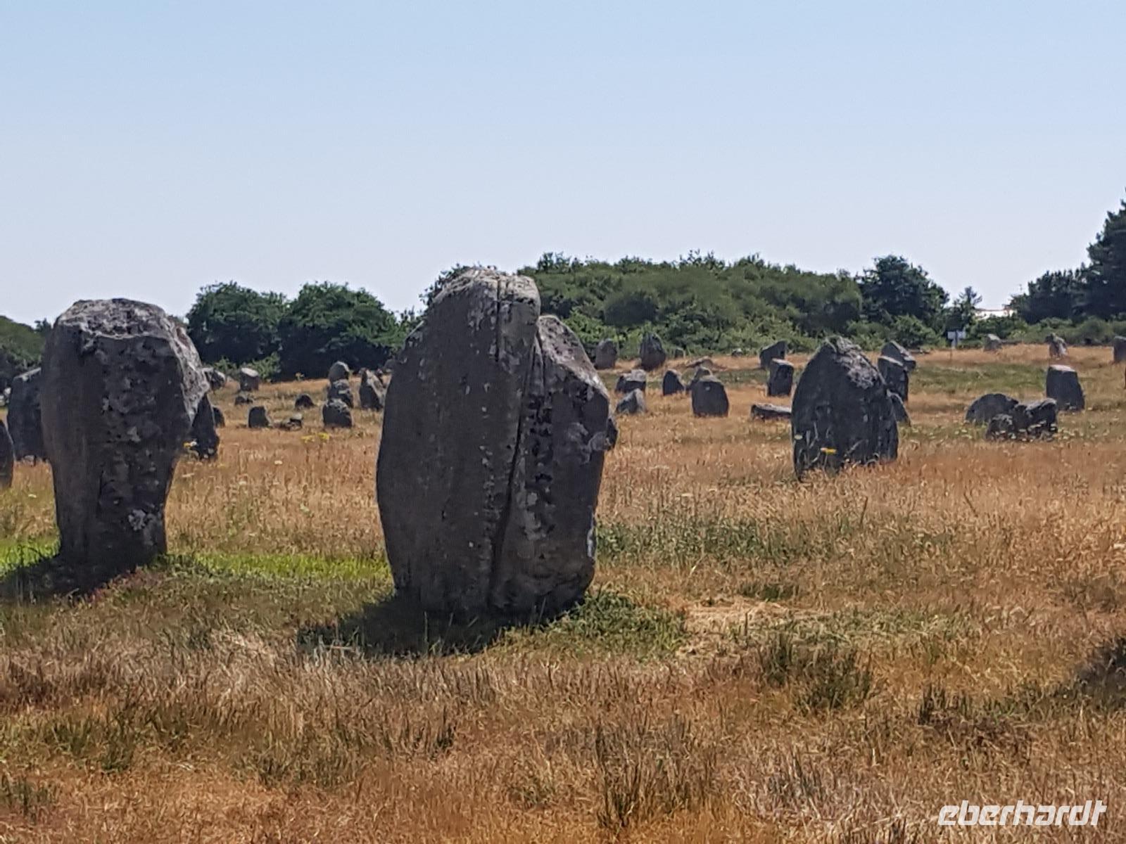 Wenig später erreichten wir über die Schnellstraße 165 das Departement Morbihan, wo wir die weltweit berühmten, aus der Jungsteinzeit stammenden Megalithanlagen von Carnac besuchten. In Le Ménec, ein Dorf bei Carnac, umfassen die zwischen dem 5. und dem 3. Jahrtausend v. Chr. entstandenen Steinreihen (Alignements) 1050 Steine, die sich über eine Länge von 950 m erstrecken. Hier enden die 11 Reihen der bis zu 4 Meter hohen Menhire. Die Deutung der gesamten Megalithanlage von Carnac liegt noch immer im Dunkeln. Sicher ist jedoch, dass es sich hier um eine der ältesten Kultstätten der Menschheitsgeschichte handelt.