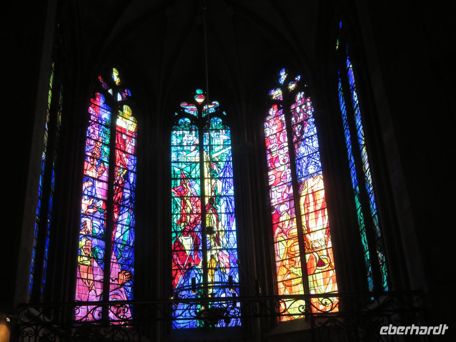 Zu 6:00 Uhr trafen sich die ersten vier Gäste in Dresden, um eine 750 Kilometer lange Fahrt durch Mitteldeutschland, Hessen, Rheinland-Pfalz und das Saarland bis nach Lothringen anzutreten. Bei Alsfeld stiegen die letzten Gäste zu, so dass dann die Reisegruppe mit sechsundzwanzig Gästen komplett war. Während der Fahrt schwankte die Witterung zwischen Nebel und klarer Sicht bei Tiefdruck in Thüringen; die Temperaturen erreichten kaum sechs Grad. Zum Sonntag ging es jedoch zügig voran. Nach unserer Ankunft im Hotel Kyriad in Metz trafen wir uns siebzehn Uhr zu einem kleinen Stadtbummel mit dem Ziel eine der größten französischen Kathedralen, St. Etienne, zu besichtigen. Ein Chor hatte Aufstellung genommen, und wie zur Begrüßung unserer Gruppe, erklang ein christliches Lied. Neben der Höhe beeindruckt die Kathedrale insbesondere durch ihre 6500 m² Glasfenster. Auch wenn das Blau der Fenster auf der rechten Seite zunächst an Chagall erinnert, der Schöpfer dieser Fenster ist Villon; Chagalls Fenster befinden sich im Hochaltar. Kostbar und hoch oben die schwalbennestartig angebaute Orgel aus der ersten Hälfte des 16. Jahrhunderts. Bei kaltem Wetter bummelten wir zur Insel mit dem Theater - wo uns Gendarmerie und Polizei nicht aufhielten, weil Sie scheinbar einen wichtigen Gast zu beschützen hatten - und durch Gassen der Stadt mit wechselvoller Geschichte und einer etwas grau wirkenden Architektur - aber vielleicht lag es am Wetter und unserer Müdigkeit nach langer Fahrt? Abendessen als 3-Gang-Menü mit Quiche Lorrain („Eierschecke mit Schinkenstreifen"), Spanferkel mit Pfirsichconfit und Zitronencremtörtchen, Nach einem langen Tag bummelten einige nochmals zur Moselinsel, um die „Stadt des Lichts" zu erkunden.