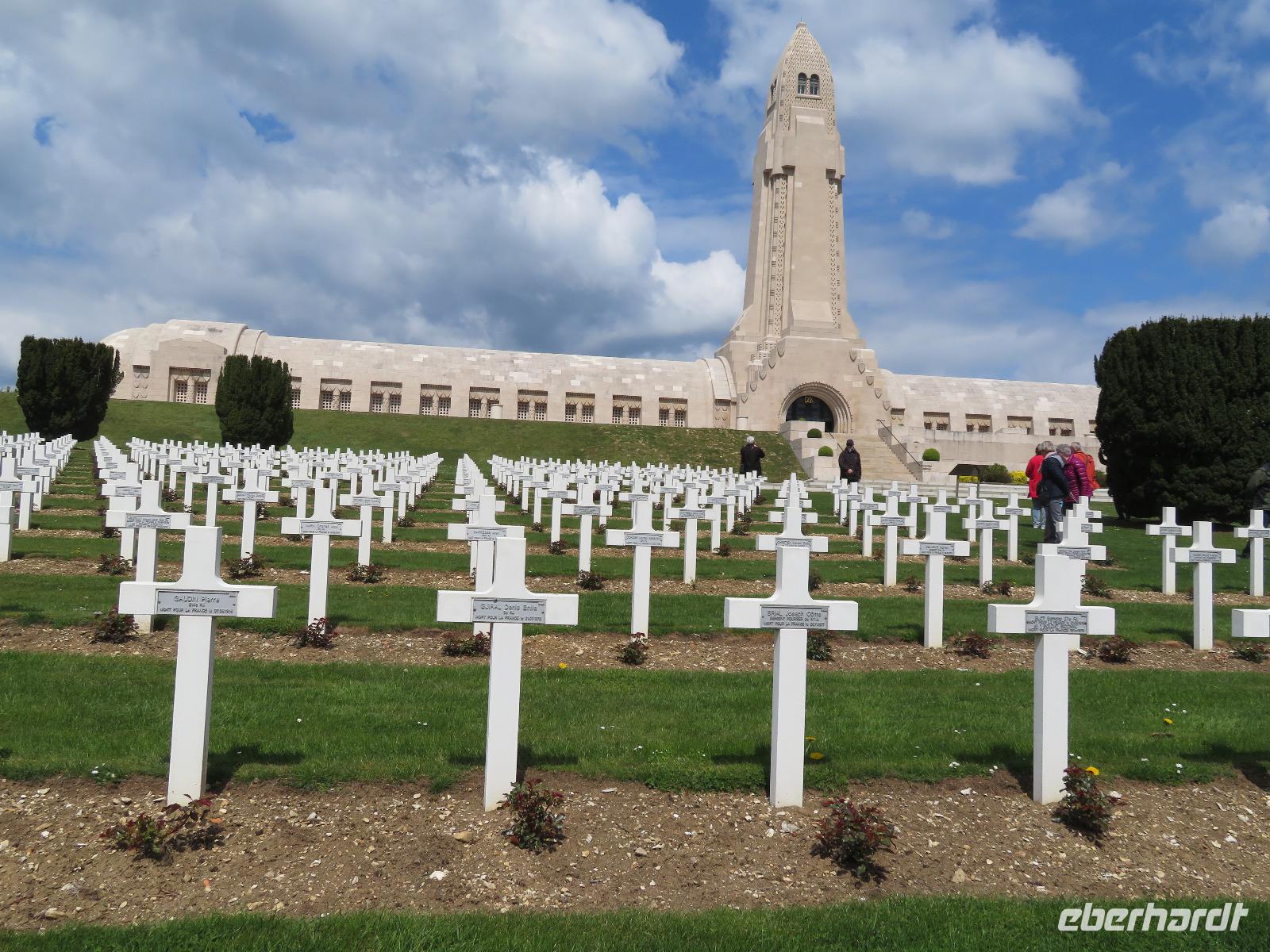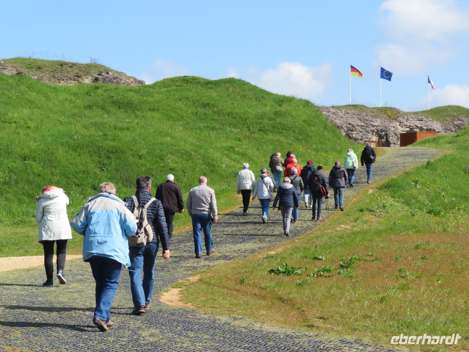 Anschließend fuhren wir zum Beinhaus, letzter Ruhestätte für die zumeist völlig zerrissenen Körperteile von mehr als 130.000 Gefallener. Nachdem man jahrelang eher bekundete, im Gebeinhaus würden überwiegend die Überreste toter Franzosen liegen, bekundet man mittlerweile eher zweistaatliches binationales Bekenntnis zu allen Toten (Wer will auch bekunden, ob der abgerissene Armknochen ein französischer oder deutscher sei.) Davor der riesige Friedhof für tausende Einzelgräber gefallener Franzosen und Ort des versöhnenden Händedrucks zwischen Mitterand und Kohl.